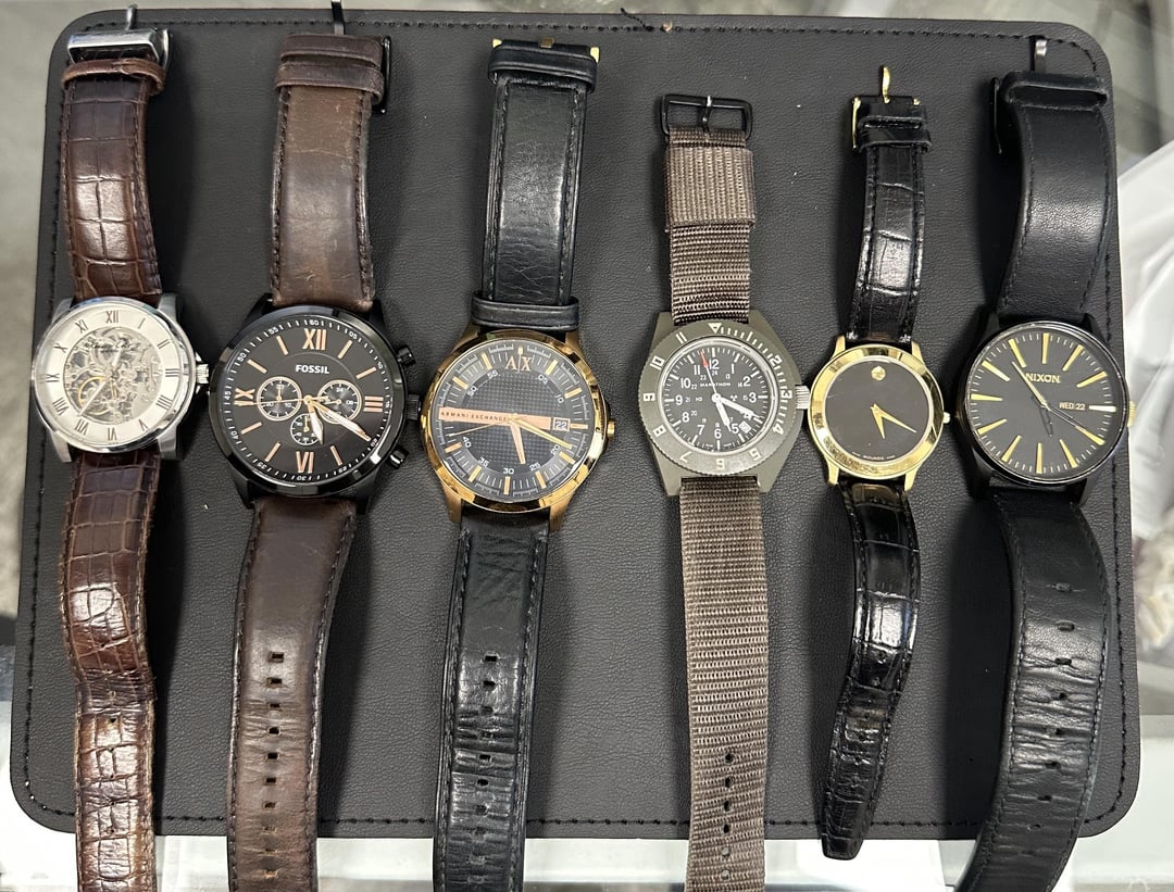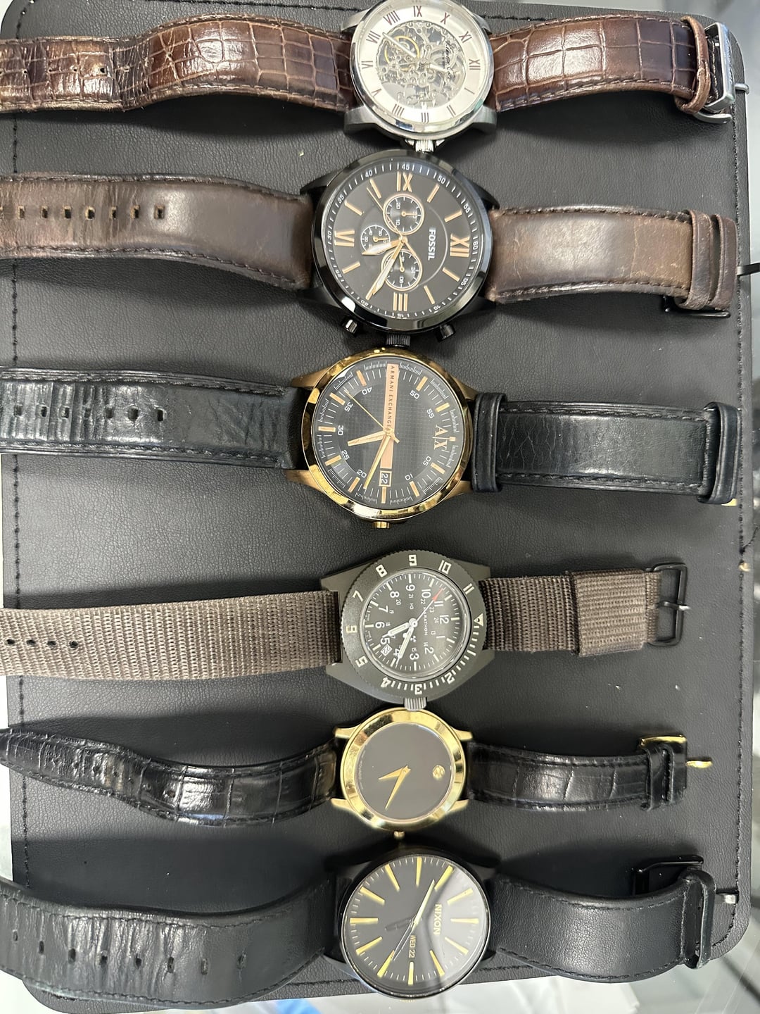 timestamp: https://imgur.com/a/b4QR90C I had a few old watches in my collection that I haven't been using much anymore. Let me know if anything interests you, offers accepted on all. Free shipping continental US included (at the current price). **Left to Right** 1) Kenneth Cole - KC1515 - 43 mm - automatic - $40 2) Fossil BQ2376 - black leather - 48 mm - quartz - chronograph - $40 - Nice looking watch, chronograph works, didn't get much use overall 3) Armani Exchange AX2129 - $40 - just changed battery 4) Marathon Sage Green Pilot’s Navigator with Date Swiss Quartz Movement 41mm 60m - 20 mm watch strap - tritium -$200 - The watch bezel moves but it has a crack on it that you can see on the side pic on left side 5) Movado Museum Watch Unisex 35mm Black Dial 87 E4 0844 - $100 - just changed battery 6) Nixon Sentry Leather - 42 mm - matte black/gold - $60 - just changed battery, nice looking watch, it was my favorite a few years ago before I started to invest more in my watch collection