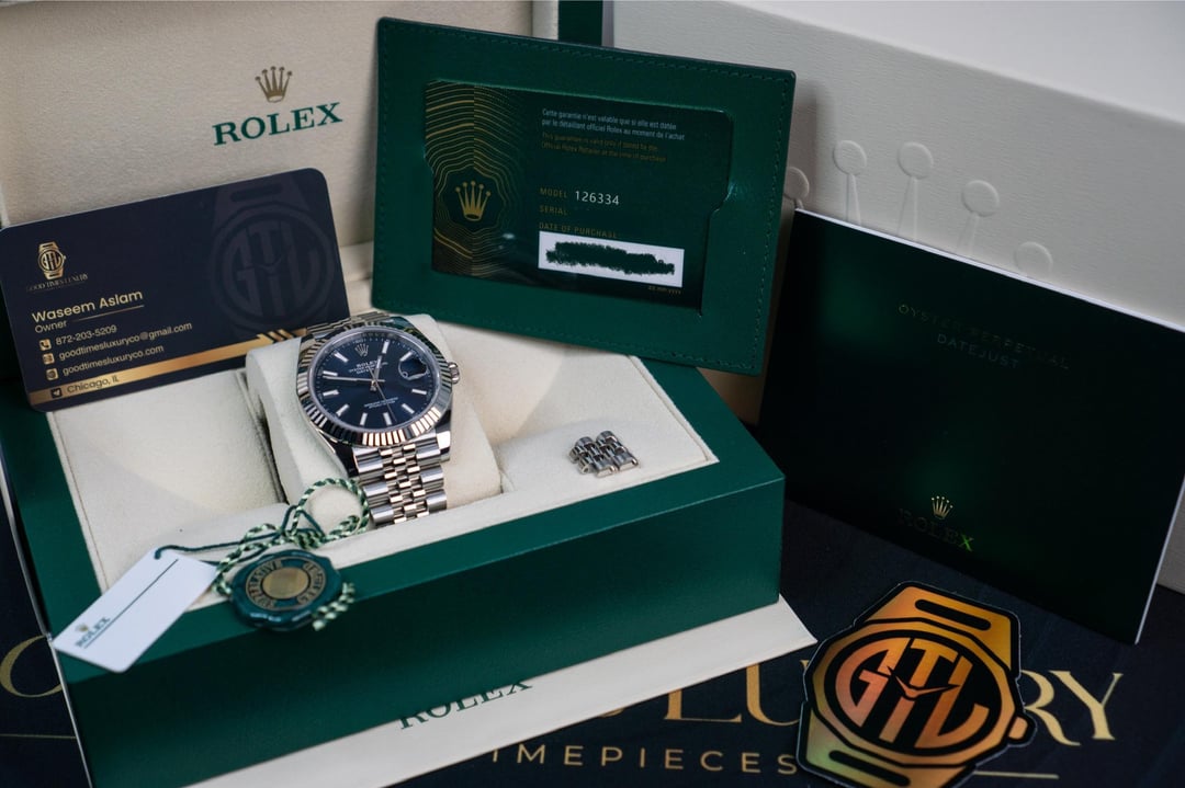 - TIMESTAMP: https://imgur.com/a/PKwoV1m - Video: https://imgur.com/a/pWfM1If For Sale: 2023 Rolex Datejust 41mm Ref. 126334 | Complete Set Who needs diamonds 💎 when you have a fluted bezel? This Pre-Owned watch features an 18K white gold bezel and striking bright blue dial. The combination of elements in this piece creates a very appealing overall look that is sure to catch everyones attention. Super comfy stainless steel Jubilee bracelet that hugs your wrist perfectly and can be worn all day. ✨ Features: * Model Ref: 126334 * Dial: Stunning Blue with white markers * Movement: Automatic * Case Size: 41mm * Bezel: White Gold 🕰️ Condition: PreOwned - Like New 💳 Warranty Date: Aug 2023 📦 Complete set includes: - Double Boxed - Warranty Card - White Tag - Green Tag - Manuals 💰 Price: $13,795+Shipping via Wire/Zelle/USDT 📍 Location: Chicago, IL 📩 Contact: - 📞 Call/Text/Whatsapp: 872-203-5209 - 📸 Insta: @goodtimesluxury - 🟦 FB: waseem.aslam.31586 (Meta Verified) ⭐️ 5-Star Reviews on Google 🌐 Google us: Good Times Luxury Chicago About me 🙋🏻♂️: My name is Waseem Aslam, Owner of Good Times Luxury and Moderator for Watch Trader Community FB group. Please don’t hesitate to contact me with any questions. I’m proud to provide a top-notch buyer experience. I’ll happily provide more information/pictures/videos until you’re confident in your purchase. Thank you!