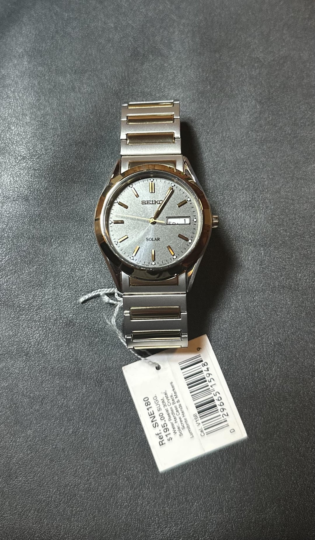 For sale is this fantastic Seiko Solar SNE180. This watch is brand new and unworn, but has two imperfections. There is a small scuff on the bezel at 12 o’clock, it’s slight but it’s there. There is also a small, thin scratch on the case back. Other than that, this watch is in perfect condition. Since it has not been worn and sat in a drawer, I had the solar battery replaced recently. Watch is in excellent condition and keeps perfect time. 38 mm case, 10 mm thick, 20 mm lug to lug. Expandable bracelet and adjustable clasp, no tools necessary. Asking $50 net to me + shipping of your choice (I can provide discounted options). Prefer Zelle, Cashapp, or Venmo. Thanks for looking!