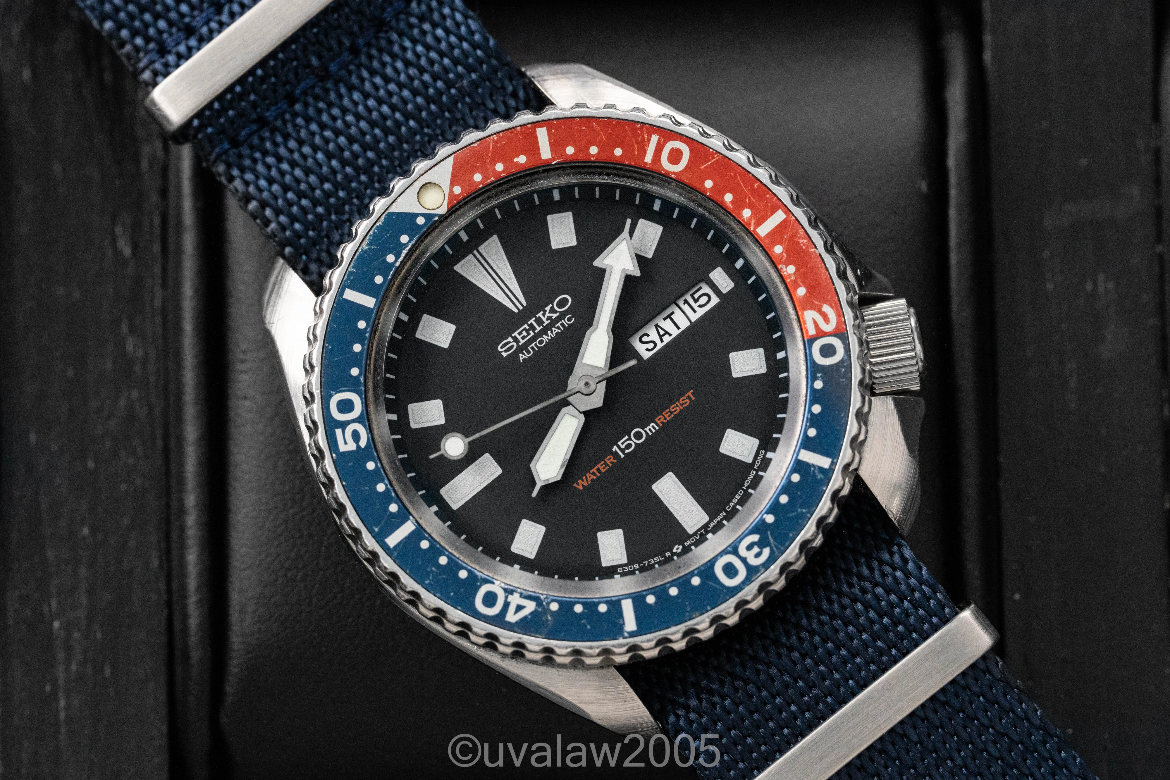 For sale is my Seiko 6309-7290 Slim Turtle. Serial dates it to July 1987. Except for an upgrade to a sapphire crystal with clear AR, this is all original with typical patina to the case and bezel insert. Bi-directional bezel works great and crown screws down with 3 full rotations. Comes with two brand new CNS Watch Bands nato straps and an extra OEM pepsi bezel from the 729A variant which can be swapped out.