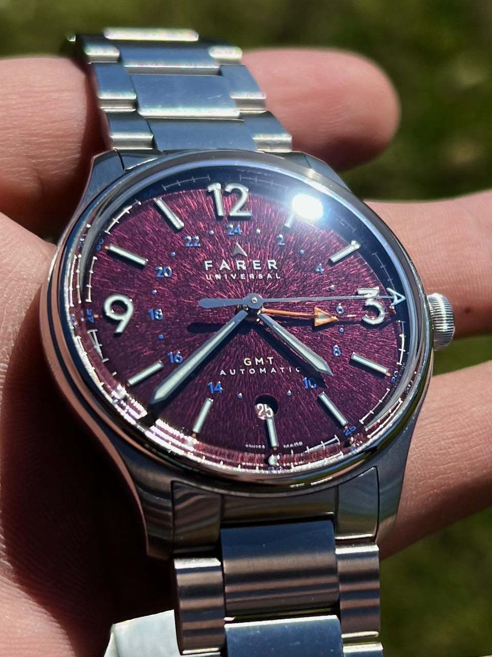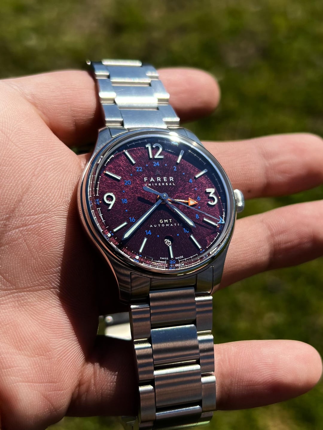 Hello, up for sale is my lightly used Farer Banzare GMT with the gorgeous burgundy bark dial. This watch is truly amazing, I hate that I am even selling this right now, the dial is unreal and the amount of detail is absurd. Comes with very comfortable steel link bracelet, very easy to size and wears great at 39.5mm. Warranty card is dated 5/13/2024 and covered for 5 years so has plenty of time. This is currently sold out on Farers Website and appears to be the only one for sale at the moment. Pricing at $1350 shipped for a small loss and a great gain for anyone interested. Feel free to reach out with any questions, thanks for looking!