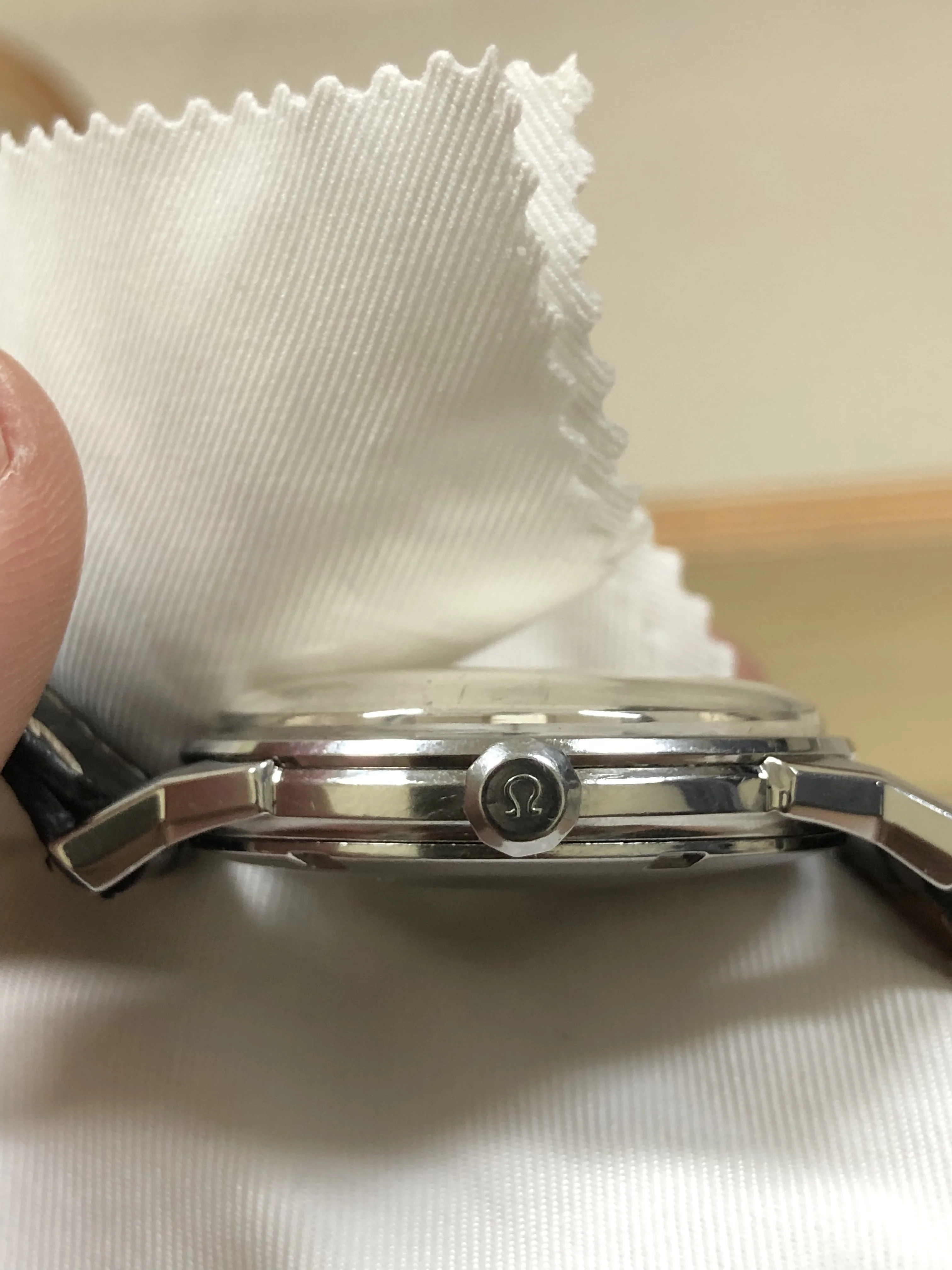 - Case: The diameter is 34.5mm without the crown. Original case in good condition with hairline scratches. Original thin Omega ten-sides crown.