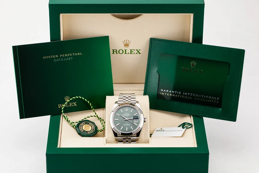 Up for sale is a brand new Rolex Datejust 41 with Mint Green Stick Dial with Fluted Dial on Jubilee Bracelet, reference # 126334. It comes complete with all boxes, papers, booklets, hang tags, and Rolex Warranty Card dated February 2025.