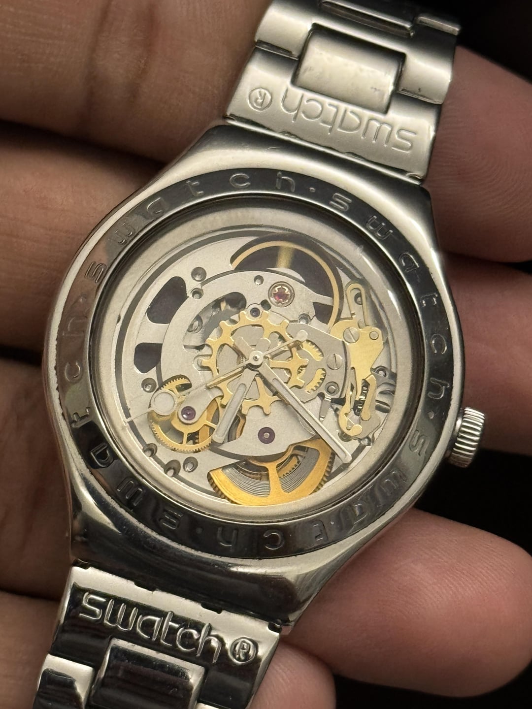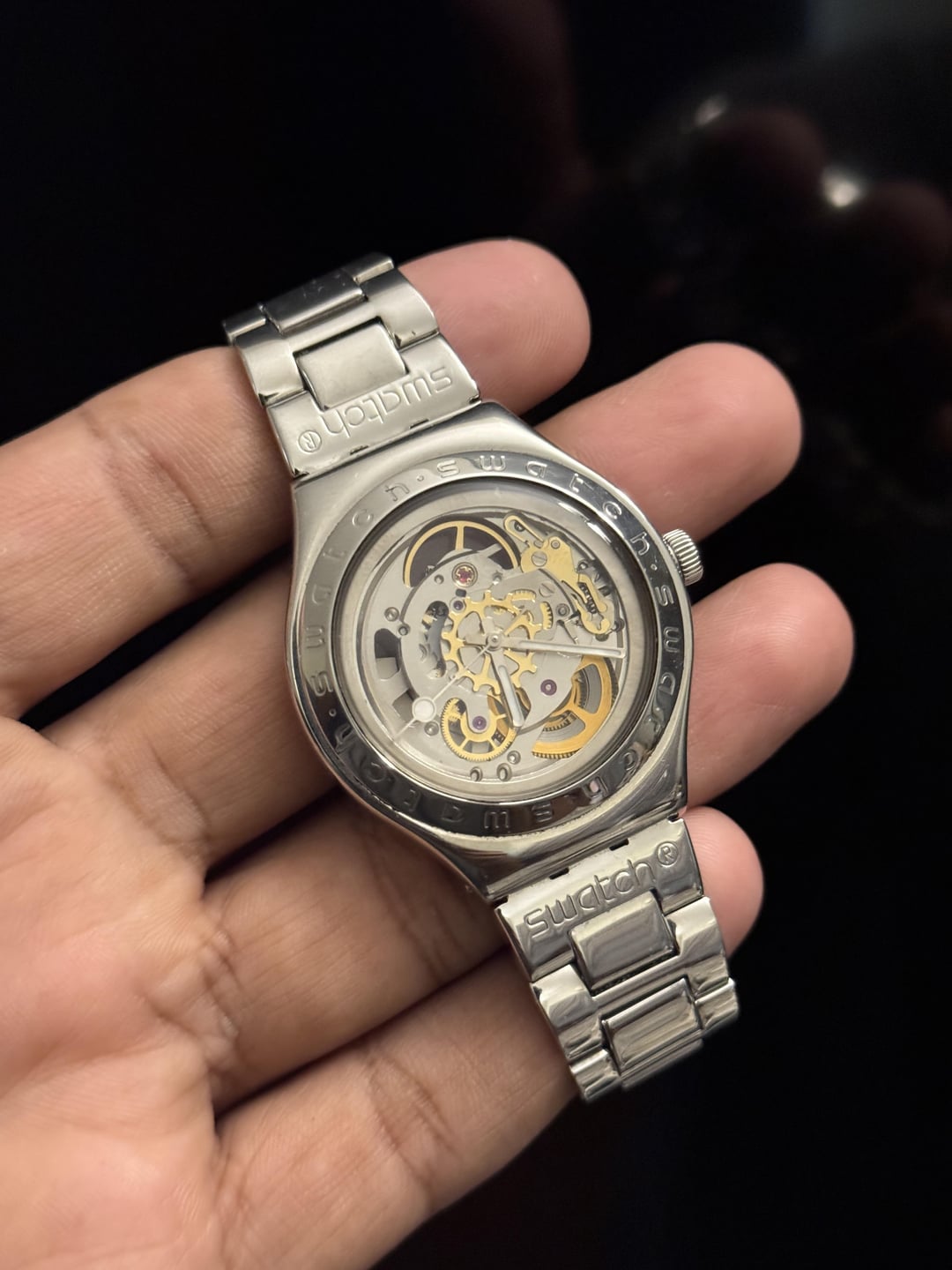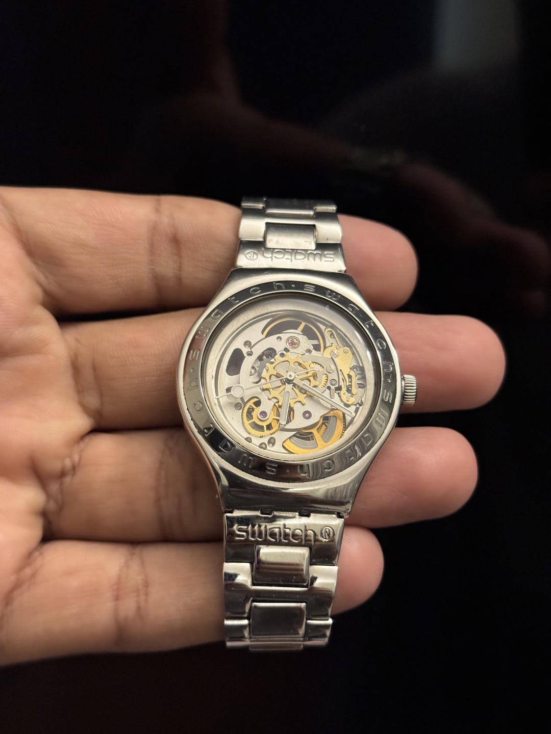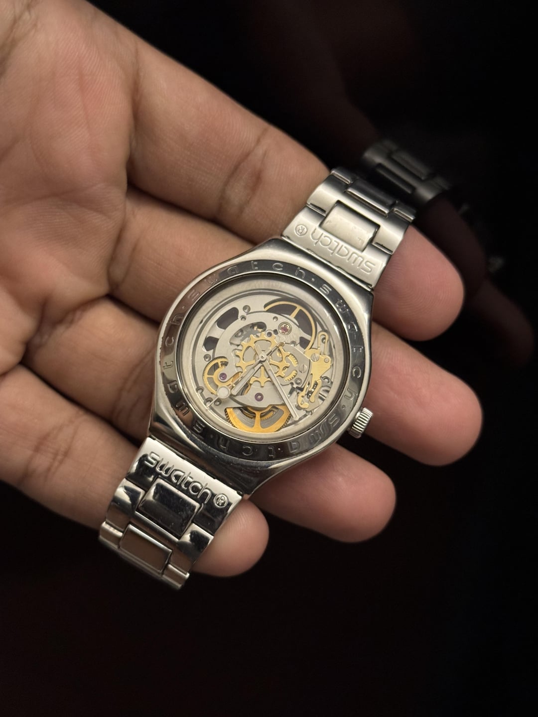 Swatch Irony Automatic Skeleton A lot of watch for the money! Featuring a 37mm dial, showcasing the movement that is a treat to watch. Complemented by an interesting lollipop second hand. Automatic movement. The watch shows light signs of wear/hairlines throughout. Bracelet will approx 7. Price: 165$ through wise shipped via fedex conus