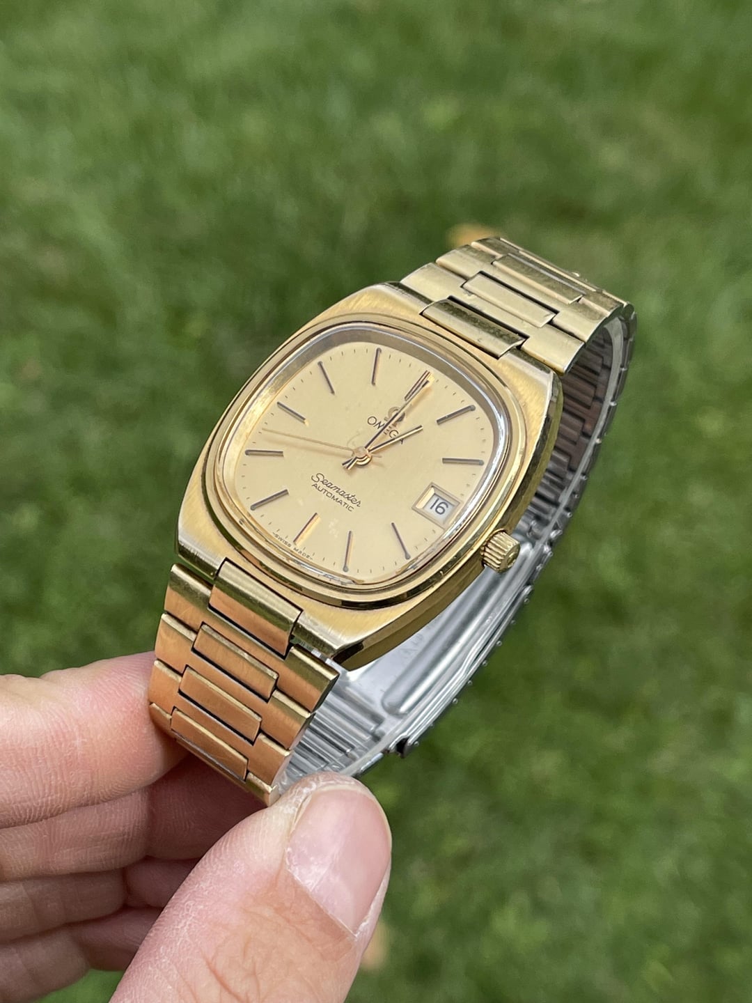 Hi all! Here is for sale a nice Omega Seamaster Automatic 166.0207. The watch is made of gold plated stainless steel. For sale is the watch only. The case is in good condition, made from stainless steel and gold plated with 20 microns. The case has original sharp brushed and polished edges, it has signs of wear but no big scratches or dings. Movement is automatic 23 Jewels Omega 1010, keeps time around 0 sec/day. Crown is gold plated, signed with Omega logo. Caseback is stainless steel and has Seamaster logo. Reference number is engraved on inner side of caseback. Crystal is acrylic signed with Omega logo in center, has sharp edges and no blemishes. TV dial is gold colored, has vertical brushed texture. This one has applied gold toned Omega logo, Seamaster Automatic and Swiss Made at 6 o’clock. Date window is at 3 o’clock. Applied hour markers are gold toned as the handset. Bracelet is authentic Omega 1286.249.1 goldplated as well, has minimal stretch and can fit a 19cm wrist. The watch is in good preserved condition and looks brilliant due to gorgeous TV dial. Detailed pics/videos: https://imgur.com/a/l1iJCgJ Timestamp: https://i.imgur.com/b55NplX.jpeg Price is $690 through PayPal Friends and Family. Standard International Shipping is included in price. I ship international. I’ve sold a couple watches here, so you can check my feedback on r/WatchExchangeFeedback I am not interested in trades. Please PM me if you have any questions