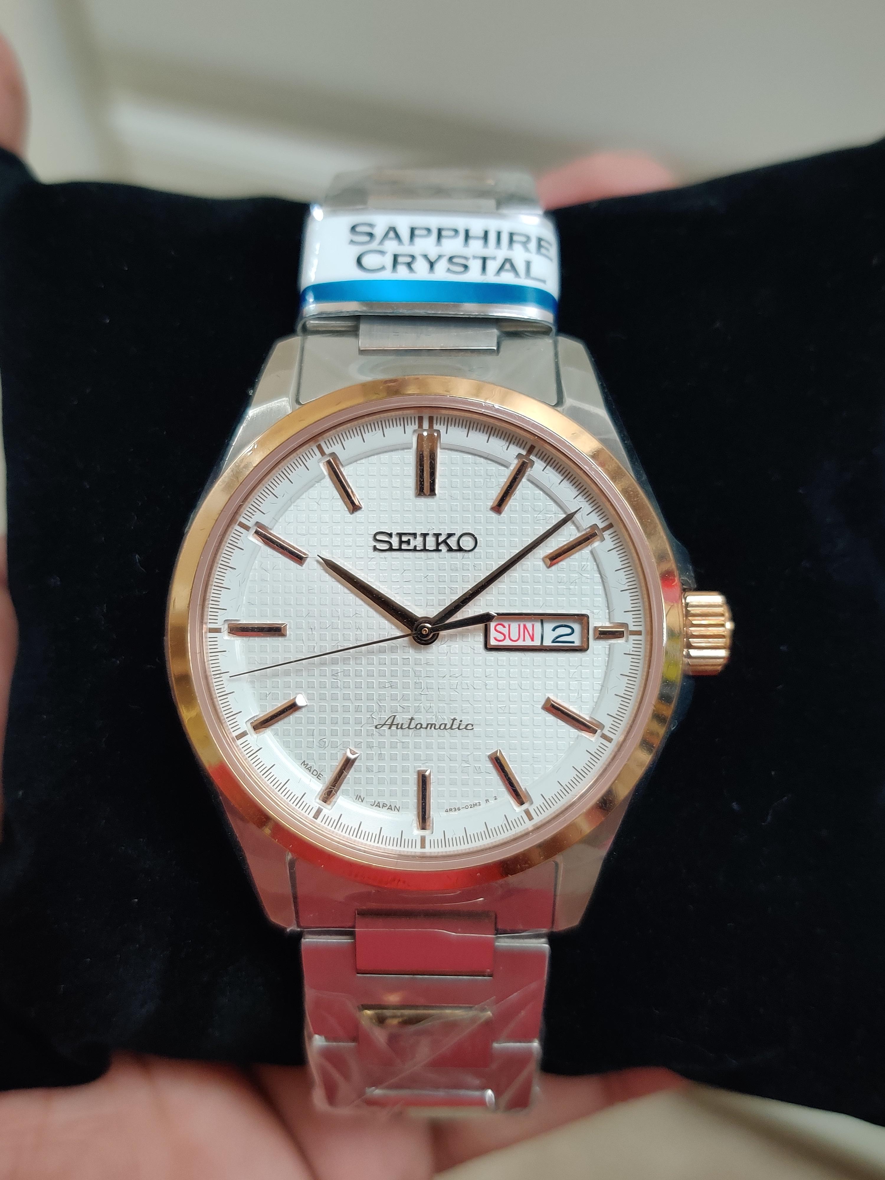Selling Seiko SRP468. BNIB. Full kit. Off White waffle dial with Rose Gold plated bezel and crown looks amazing. $550. Free shipping in US. Can discuss options for overseas shipping. Ships from Texas. No trades. Prefer Zelle or wire. Paypal, and Venmo are options for buyers with extensive feedback. Album - [https://imgur.com/a/Lp31F6y](https://imgur.com/a/Lp31F6y) TS - [https://imgur.com/TuokqEZ](https://imgur.com/TuokqEZ)