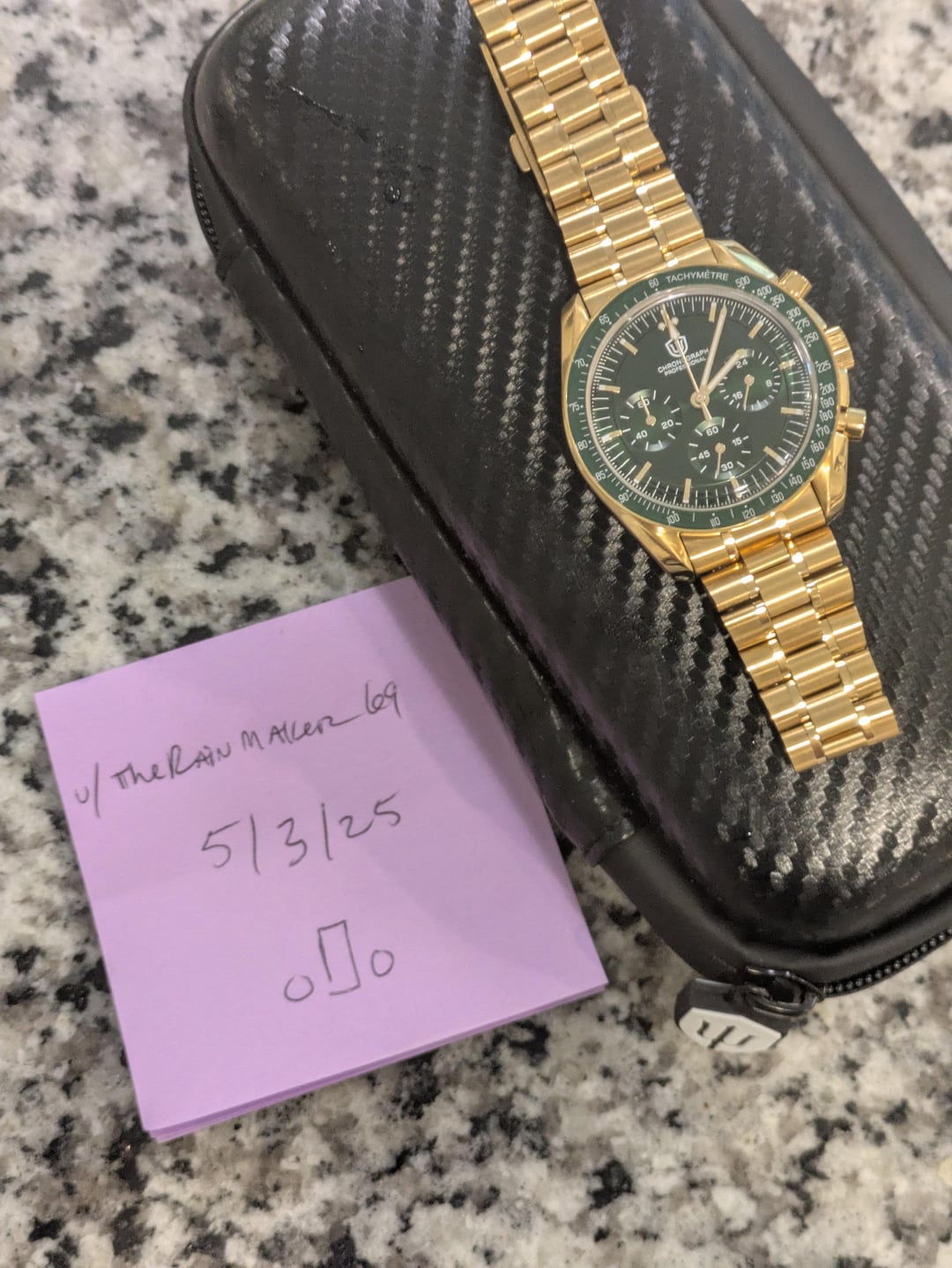 Timestamp: https://imgur.com/gallery/i8tuu9V Sale price: $140 Location: CONUS Willing to Ship to: Conus Accepted Payment Methods: Zelle, PayPal ff, venmo Movement Details: Seiko mechaquarts VK WR: 100m Warranty Provided? None. I will do everything I can to package securely. Item Condition? NEVER WORN Watchdives limited edition release of the gold speedy Homage. Green sunburst dial. Sapphire box crystal I have a lot of gold watches that have sentimental value. Probably won't wear thi Shipping Costs? Included in price