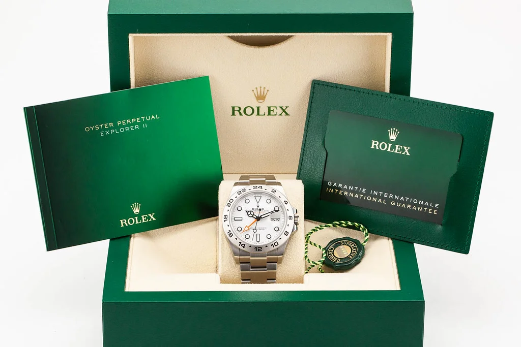 Up for sale is a brand new, fully stickered Rolex Explorer II 42mm Polar White Dial, reference # 226570. It comes with all boxes, papers, booklets, hang tag, and Rolex Warranty Card dated December 2024.