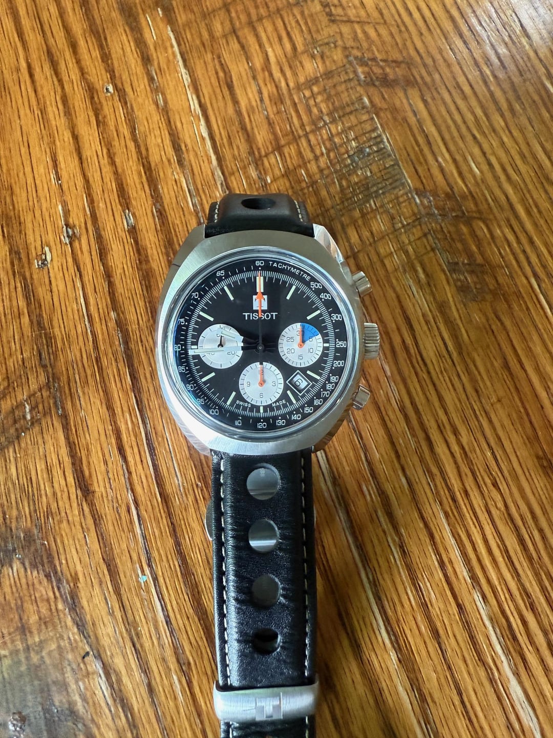 Hi everyone, I'm selling this Tissot Heritage 1973 Chronograph, in black, to make room for a recent acquisition. It's an amazing watch, in excellent condition. I would rate the condition as 9.5; minimal and minor light wear on the case, perfect crystal, and overall the watch looks pristine. All chronograph mechanisms working as they should, alignment is precise. Some basic specs: Tissot automatic chronograph movements (based on Valjoux 7753), 43 mm x 46.6 mm Tonneau-style case, domed sapphire crystal with AR coating. On the larger side, then, but the modest lug-to-lug makes it very wearable, even on my small wrist. I'm now asking $925, including shipping to CONUS. Let me know if you have any questions, of course.