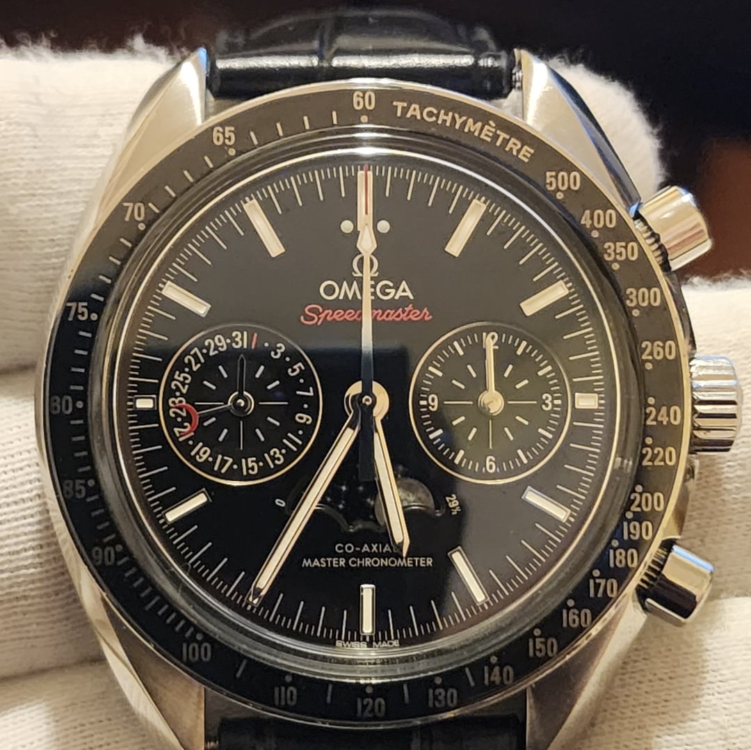 **Timestamp:** [https://imgur.com/a/9MTYbd0](https://imgur.com/a/9MTYbd0) **💰 Price: $9,081 OB**O Selling my **Omega Speedmaster Moonphase Co‑Axial Master Chronometer Chronograph** **Ref:** 304.33.44.52.01.001 **MSRP:** $11,200 Comes with: Full set – Omega inner/outer box, warranty card, manual **Case Size:** 44.25mm stainless steel **Movement:** Omega Co-Axial Master Chronometer Caliber 9904 – Automatic **Crystal:** Domed scratch-resistant sapphire with anti-reflective treatment on both sides **Complications:** Chronograph, Moonphase, Date, Time **Strap:** Black alligator leather strap with deployant clasp The Speedmaster Moonphase isn’t just another chronograph — it’s a technical marvel. Certified as a Master Chronometer, it pairs Omega’s cutting-edge Co-Axial technology with a high-precision moonphase complication accurate for 122 years. The photorealistic moon disc, layered dial, and elegant case proportions elevate this reference into a category of its own. It's my favorite watch--I'm always complimented when I wear it, and have fallen in love with moonphase complications as a result. As an attorney, I find particular joy in collecting and discussing timepieces of this caliber with fellow enthusiasts who appreciate the artistry behind every detail. Make this one yours. **💰 Price: $9,081 OB**O **💵 Preferred paymen**t: Wire transfer or crypto (BTC/ETH/USDC) **✅ Zelle accepted for trusted buyers** **📦 Shippin**g: FedEx Overnight, fully insured and tracked **📍 NYC local pickup availab**le (Greenpoint, Williamsburg, or Midtown)