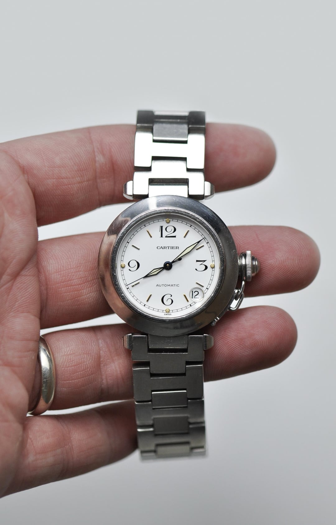 1990's Cartier Pasha C (ref. 1031) The Pasha de Cartier line was launched in 1985, with the help of legend - Gerald Genta. This example offered is the 35.5mm Pasha C ref. 1031. The Round Stainless Steel Case and vendome lugs are topped off by the screw down crown cap and retaining chain. The Cartier Calibre 49 Automatic Movement was recently serviced in April 2025. The watch exhibits marks and scratches throughout the case and bracelet consistent with its age (30 years). The dial is clean featuring creamy lume plots and blued hands with the sapphire crystal showing minor scratches and marks. Quick Specs: - Reference: 1031 - Year: Mid 1990's - Dimensions: 35.5mm - Movement: Swiss, Cartier Cal. 49 Automatic - Case Material: Stainless Steel - Bracelet: Original Cartier Stainless Steel H link Bracelet. Fits 6.5 inch wrist / 16.5cm (Got a larger wrist? generic steel links available on ebay for cheap) - Lug Width: 18mm - Service History: April 2025 - Box & Papers: No, watch only - Please DM if you have any questions **Photos:** https://imgur.com/a/ejnnnSh **Timestamp:** https://imgur.com/a/PPOWdXW **Price:** $1,485 (Shipped Worldwide - Fully Insured) [Exluding Customs & Duties] **Watch Location:** Sydney, Australia (Local Pickup or Drop-off can be arranged) **Payment method:** Wise (Formerly Transfer wise) low fees.