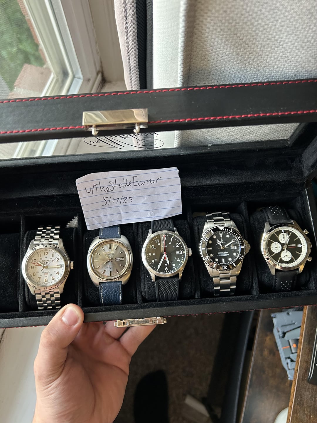 REDUCED! 1. Seiko 5 Sports Field GMT SBSC009 - Great used condition with very minor scratches throughout. Clasp has some heavier scratches. - Watch only - 355$ shipped 2. Rare 1970s Seiko Ice Blue Actus SS - Excellent condition given its age with very minor signs of wear. - Serviced by previous owner - Watch only - 250$ shipped 3. Vaer C5 Ameriquartz Date - Good used condition with some scratches on the case - Comes as watch and original strap with buckle only - 114$ shipped 4. Steinhart Ocean One 39 Ceramic - good used condition with small signs of wear. Scratches on bracelet and a small scratch on crystal - Comes with all original packaging and papers. Not in the best condition but still ok - 270$ shipped 5. Rare (cheapest available) Seiko x Nano chronograph SZSJ005 - Excellent used condition with almost no signs of wear. - Comes with all the original boxes and bracelet. Bracelet is still brand new. - 515$ shipped All prices listed include shipping within the continental US. Payment via PayPal or Zelle please. Thanks for taking a look! If you comment YOLO to take a watch, I will take off 5–10$ (depending on which one) for saving me time. Thanks.