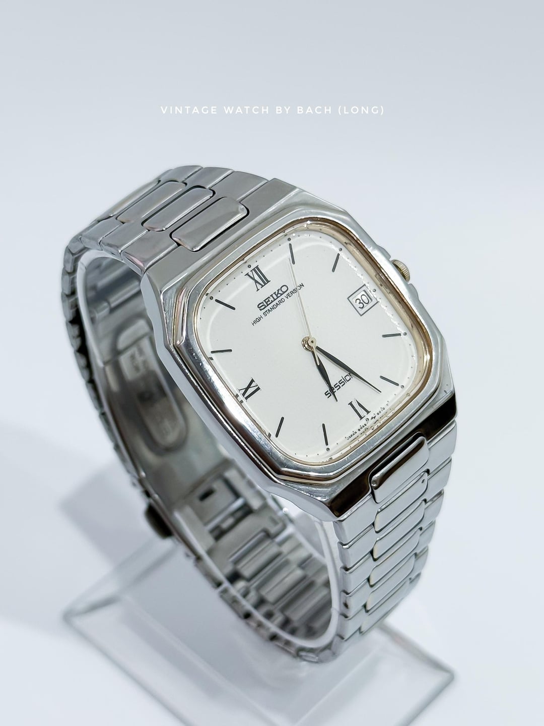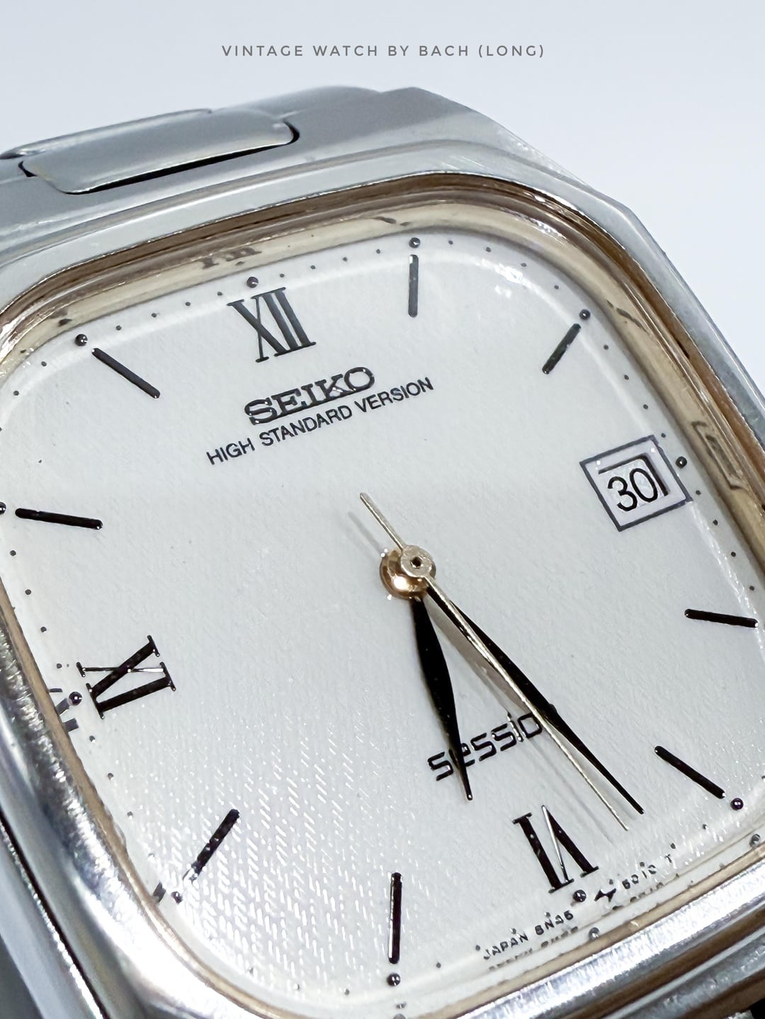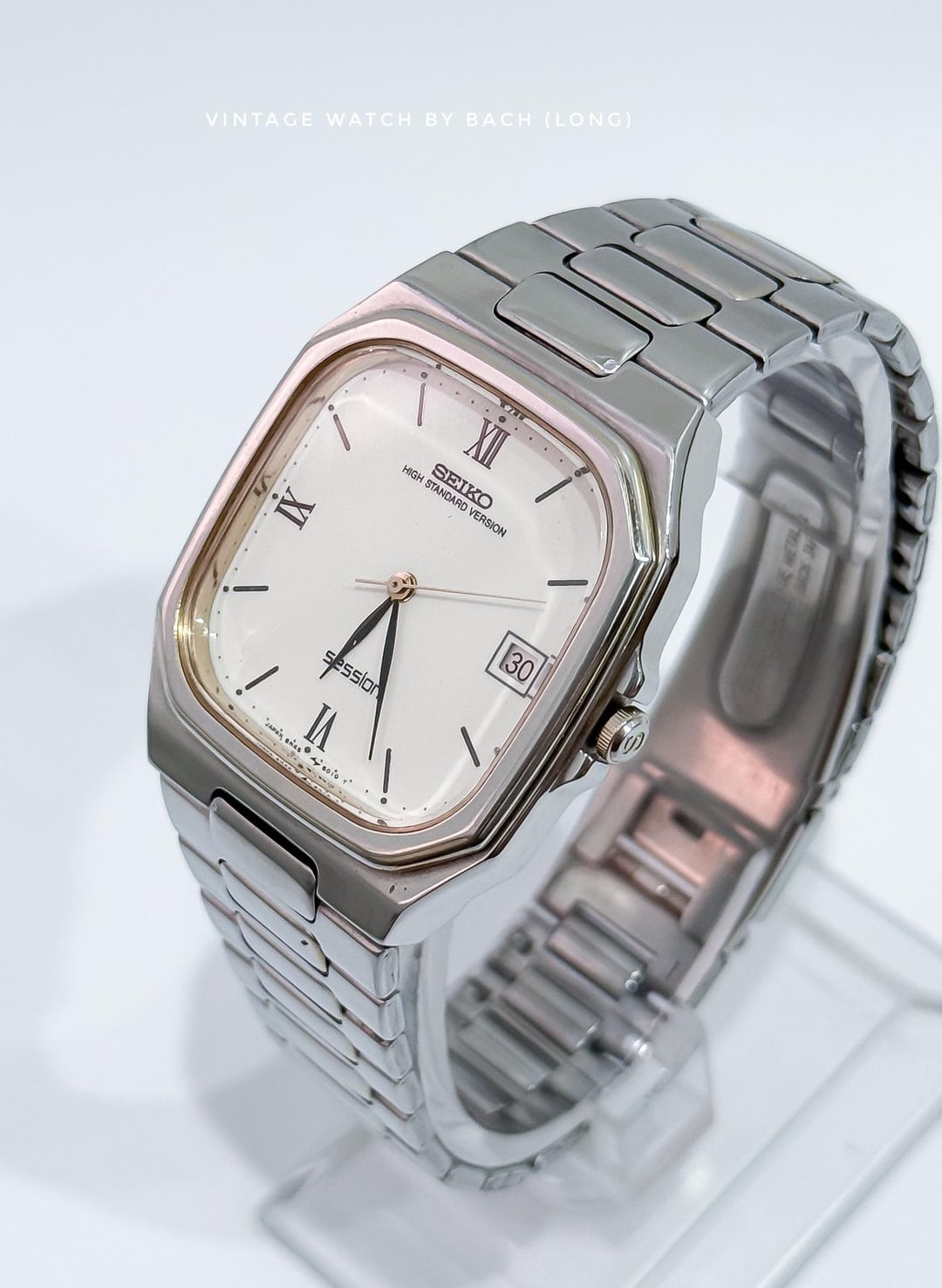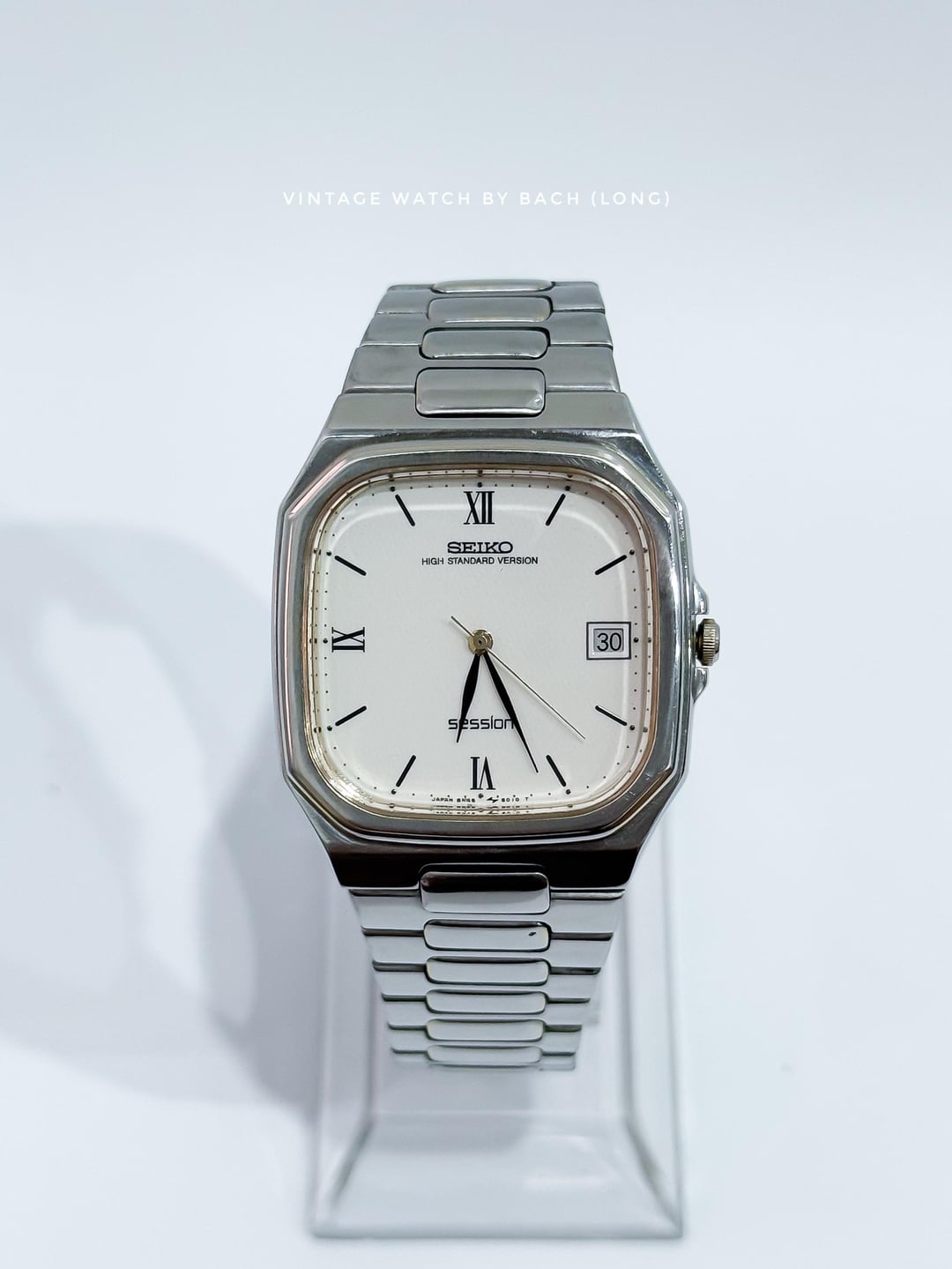 **Seiko Session 8N45-5000 Tank/Square Watch** **SPECIFICATIONS:** \- Japanese Seiko Session (High Standard Version) tank quartz, excellent condition from June 1990. Powered by the high accuracy quartz calibre 8N45, the watch earns the "High Standard Version" title with an accuracy of ±20s/year. Minimal and vintage style. \- Original Seiko intergrated stainless steel bracelet. Fit wrist size upto 19cm. \- Stainless steel case size 33mm (without crown), Lug to Lug: 39mm, Lug Width: 19mm, Thickness: 7 mm. Suitable with all wrist size. \- Beautiful white textured dial, minute and hour hand designed with elegant black leaf. A calendar box for date at 3 o’clock position. Minimal and clean design. **CONDITION:** The watch is very well preserved for its age (See Photos). No obvious signs of wear. The original movement works well (keeping the time, changing the date). Serviced and replaced with new battery. It’s recommend to only setting the date in 6-7 o’clock (safe time), must not change it in 9PM-4AM or that might damage the movement. Recommend to avoid getting wet for vintage watch. The watch has been tested for 1 month and operate stablely before selling. **SHIPPING AND PAYMENT:** \- Worldwide shipping via UPS (cost me 60-80 USD) with tracking number. 6-8 business days. \- Price 250 USD (free shipping). PayPal F&F or G&S (+4.4% transaction fee paid by buyer) \- Import duties, taxes and charges are not included in the item price . These charges are the buyer’s responsibility. Please check with your country’s customs office to determine what these additional costs will be prior to buying. These charges are normally collected by shipping company (UPS). For more beautiful watches, visit: Etsy store: [https://vintagewatchbybach.etsy.com](https://vintagewatchbybach.etsy.com) Chrono24: Please DM for product links. Ebay store: [https://www.ebay.com/usr/vintagewatch\_bybach](https://www.ebay.com/usr/vintagewatch_bybach) Instagram: [https://www.instagram.com/vintagewatch\_bybach](https://www.instagram.com/vintagewatch_bybach)