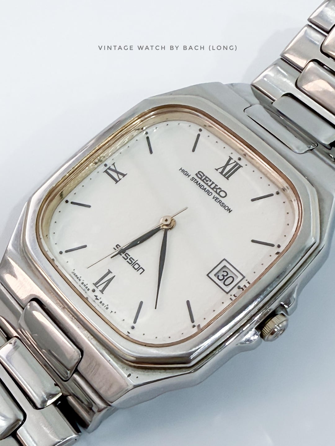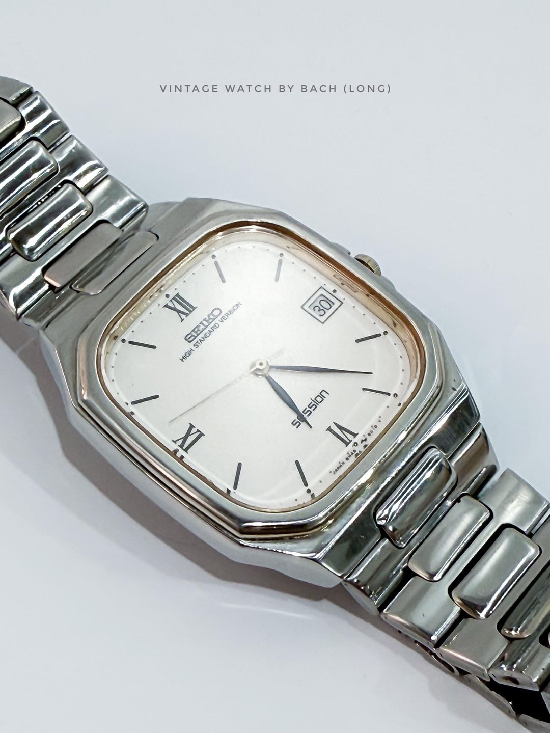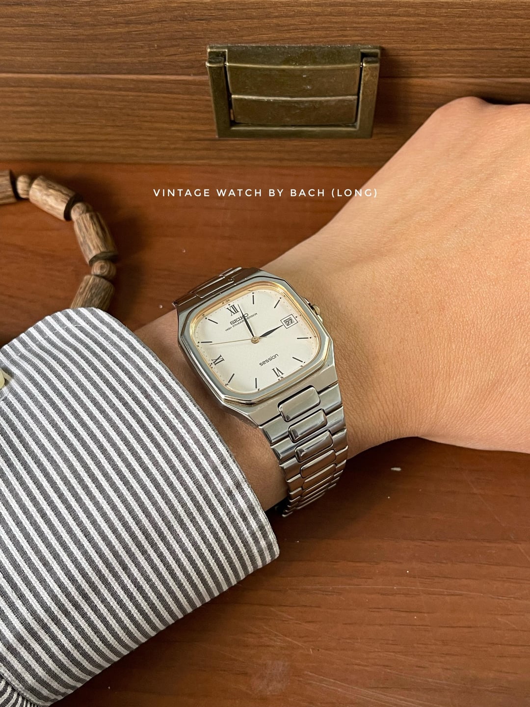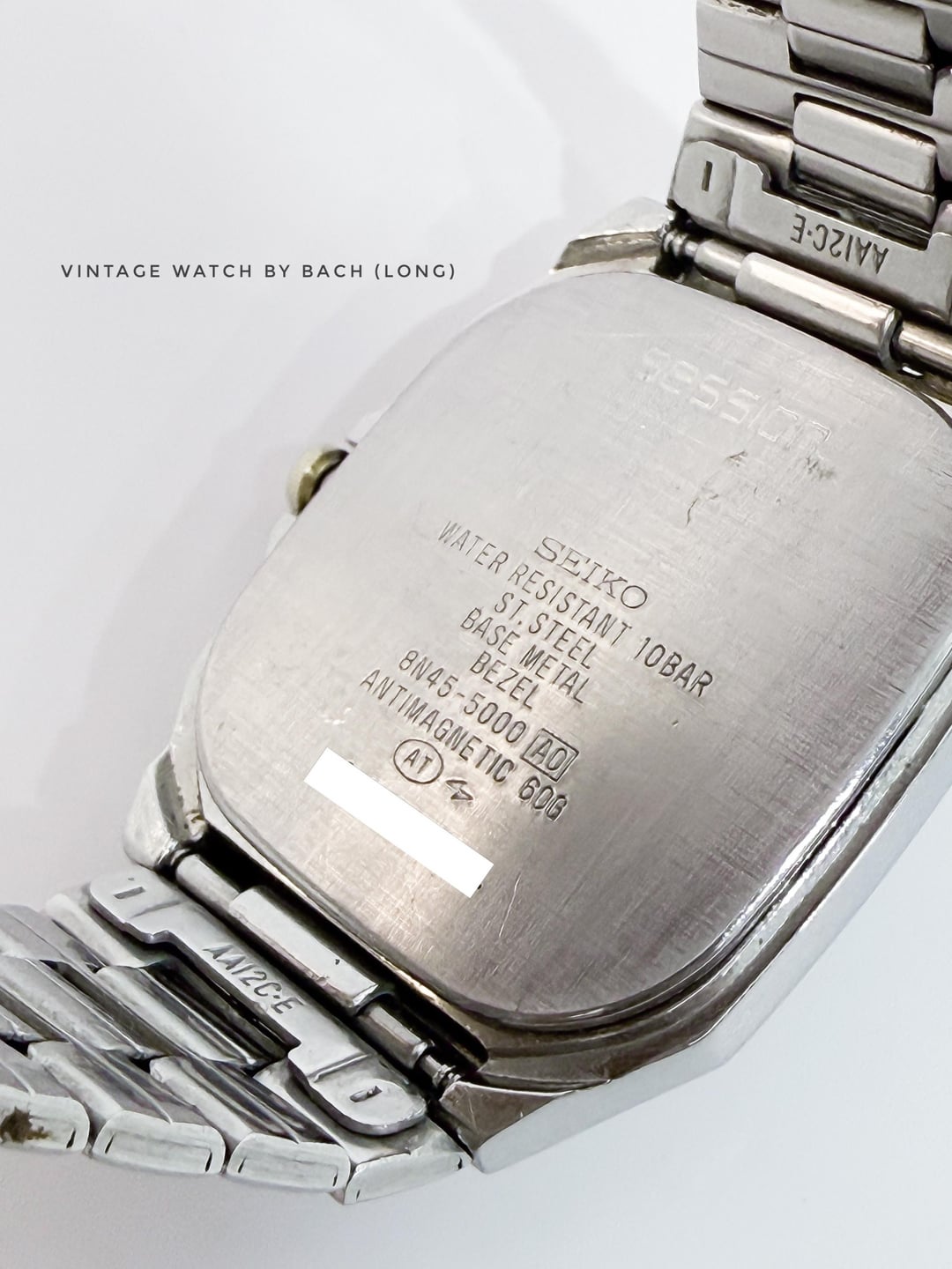 **Seiko Session 8N45-5000 Tank/Square Watch** **SPECIFICATIONS:** \- Japanese Seiko Session (High Standard Version) tank quartz, excellent condition from June 1990. Powered by the high accuracy quartz calibre 8N45, the watch earns the "High Standard Version" title with an accuracy of ±20s/year. Minimal and vintage style. \- Original Seiko intergrated stainless steel bracelet. Fit wrist size upto 19cm. \- Stainless steel case size 33mm (without crown), Lug to Lug: 39mm, Lug Width: 19mm, Thickness: 7 mm. Suitable with all wrist size. \- Beautiful white textured dial, minute and hour hand designed with elegant black leaf. A calendar box for date at 3 o’clock position. Minimal and clean design. **CONDITION:** The watch is very well preserved for its age (See Photos). No obvious signs of wear. The original movement works well (keeping the time, changing the date). Serviced and replaced with new battery. It’s recommend to only setting the date in 6-7 o’clock (safe time), must not change it in 9PM-4AM or that might damage the movement. Recommend to avoid getting wet for vintage watch. The watch has been tested for 1 month and operate stablely before selling. **SHIPPING AND PAYMENT:** \- Worldwide shipping via UPS (cost me 60-80 USD) with tracking number. 6-8 business days. \- Price 250 USD (free shipping). PayPal F&F or G&S (+4.4% transaction fee paid by buyer) \- Import duties, taxes and charges are not included in the item price . These charges are the buyer’s responsibility. Please check with your country’s customs office to determine what these additional costs will be prior to buying. These charges are normally collected by shipping company (UPS). For more beautiful watches, visit: Etsy store: [https://vintagewatchbybach.etsy.com](https://vintagewatchbybach.etsy.com) Chrono24: Please DM for product links. Ebay store: [https://www.ebay.com/usr/vintagewatch\_bybach](https://www.ebay.com/usr/vintagewatch_bybach) Instagram: [https://www.instagram.com/vintagewatch\_bybach](https://www.instagram.com/vintagewatch_bybach)