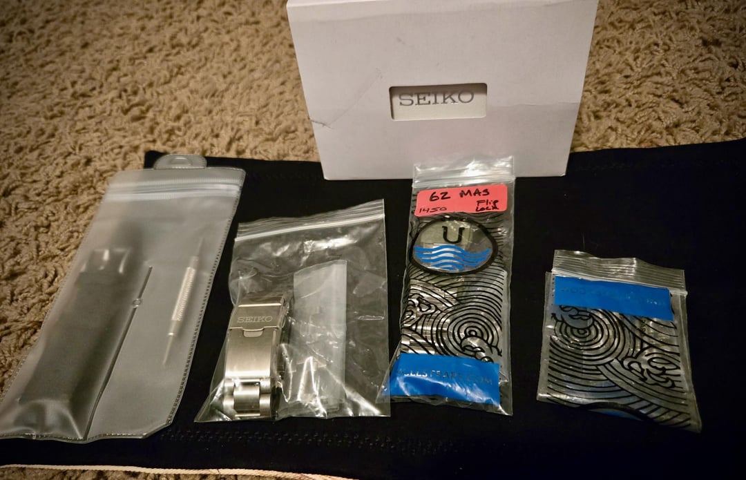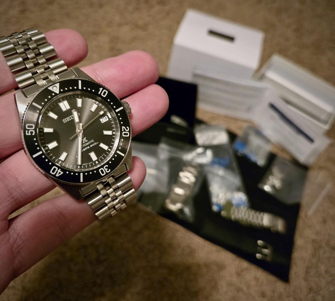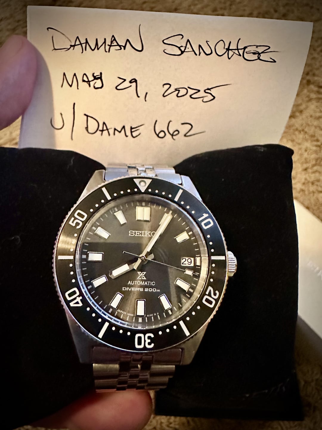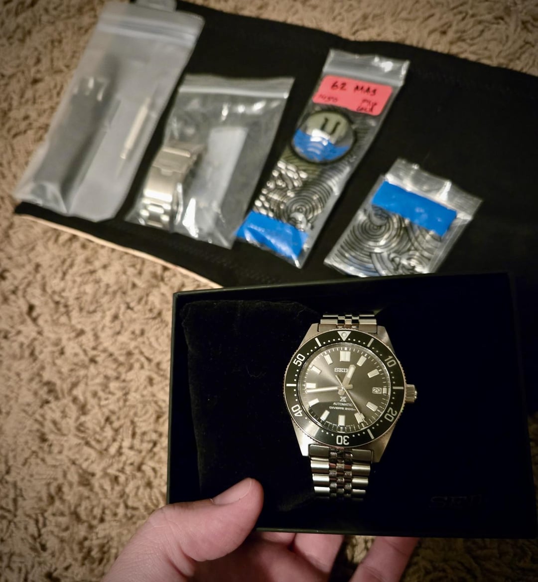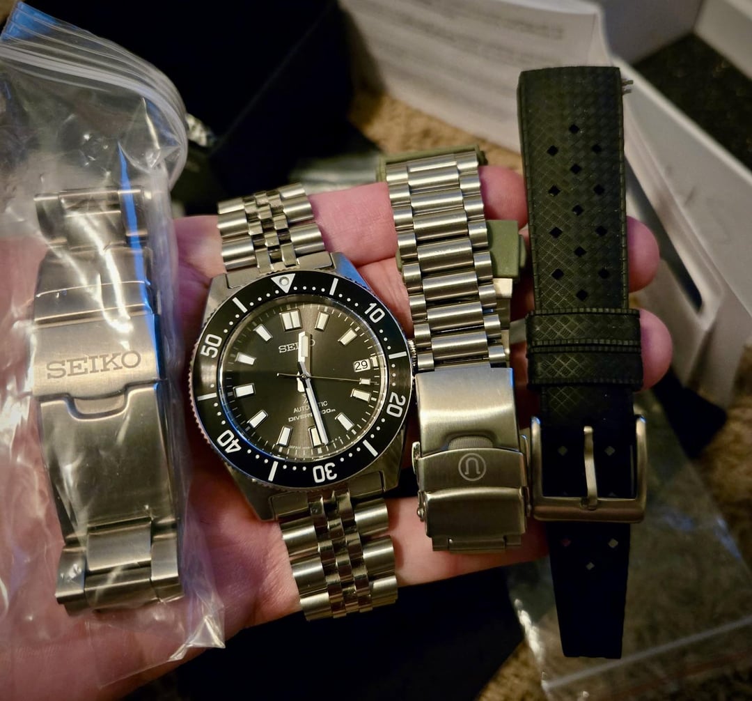 Timestamp: https://imgur.com/gallery/62mas-timestamp-wJyPnbC Up for sale (no trades at the moment) is my prized Seiko SPB143 “62Mas” - one of the most celebrated releases from Seiko. Ever. Iykyk. Includes the stock bracelet with diver extension *but* missing 1 of the collars out of the 3 removed links. Also includes 2 Uncle Strap bracelets, a jubilee style (with screw pins) and an oyster style designed like vintage Omega (pins). Also including a tropic-style strap with quick-release spring bars and throwing in a spring bar tool since the lugs are drilled, making it super easy to swap straps and bracelets. Thankfully everything aligns perfectly. Only selling to partially fund a different diver I just bought 😫😫😫 the more I talk about it the more I already regret it but I already bought the next one so… my loss is your gain! Movement: 6R35 in-house movement with 70hr power reserve Case: 40.5mm Lug to lug: 47.6mm Lug width: 20mm Thickness: 13.2mm Water resistance: 200m/660ft Priced at $850 with stock bracelet + both Uncle options ($90 each) + tropic style strap + spring bar tool, includes shipping CONUS. No trades at the moment. Additional photos: https://imgur.com/gallery/62mas-WMnKNiC