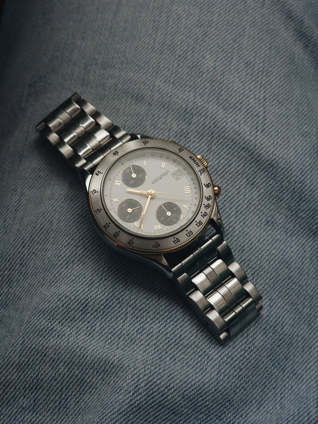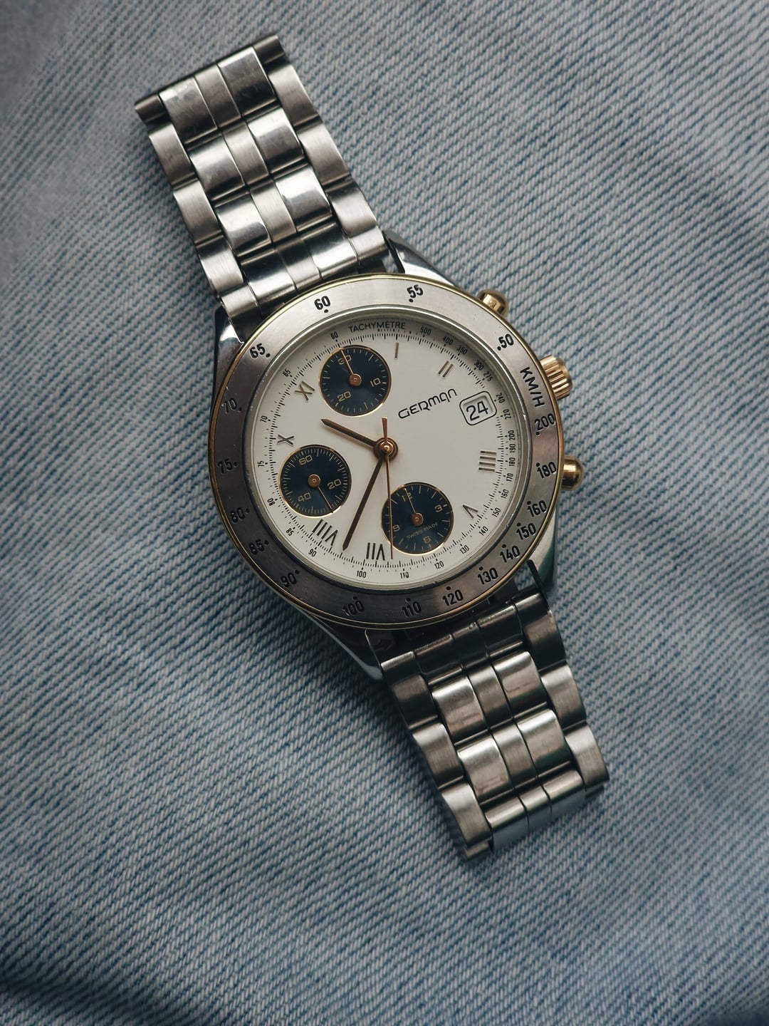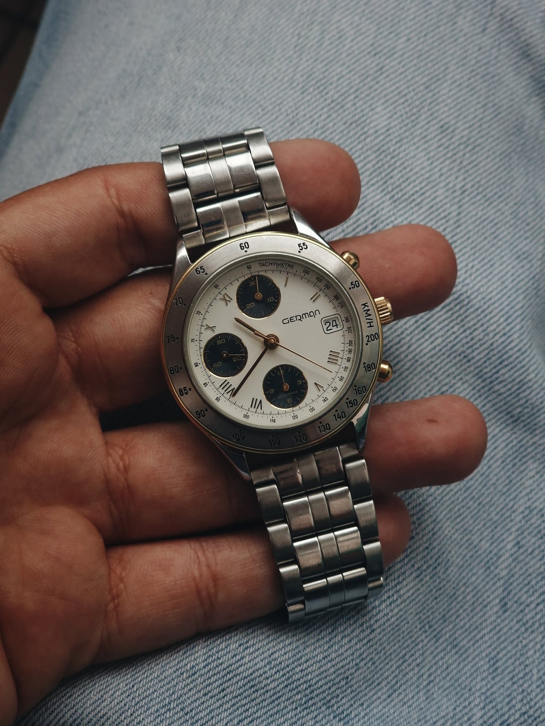 Although its name suggests otherwise, this German chronograph is actually Swiss Made. It features a workhorse Valjoux 7750 movement, a crisp white dial, contrasting black subdials, and gold-plated accents, including the bezel, buttons, hands, and numerals. I can’t find anything about the brand, but I suspect it’s from the 80s or 90s. **Condition:** Good. Some scratches on the case and crystal. Please see the pictures for a better description. The bracelet is likely aftermarket. **Case Size:** 38 x 45.3 mm stainless steel case with a thickness of 13.1mm and a lug width of 19mm. **Crystal:** Mineral. **Movement:** Valjoux 7750, automatic with 25 jewels and hacking seconds. I don’t know its service history, but everything is working as it should. **Price:** Asking $360. Please add $20 for worldwide shipping. Payment methods include Wise, ACH transfer, Revolut, Bitcoin (On-Chain or Lightning), or PayPal G&S for buyers with solid references. Add +6% for currency conversion fees on the latter. I’m located in Portugal, but worldwide shipping isn’t an issue. Established seller with over 220 transactions – buy with confidence! Make sure to follow me on Instagram (@daily.worn) to check out the newest additions. [Pictures](https://imgur.com/a/4IqrLH1) [Timestamp](https://imgur.com/a/EFiu0uN)