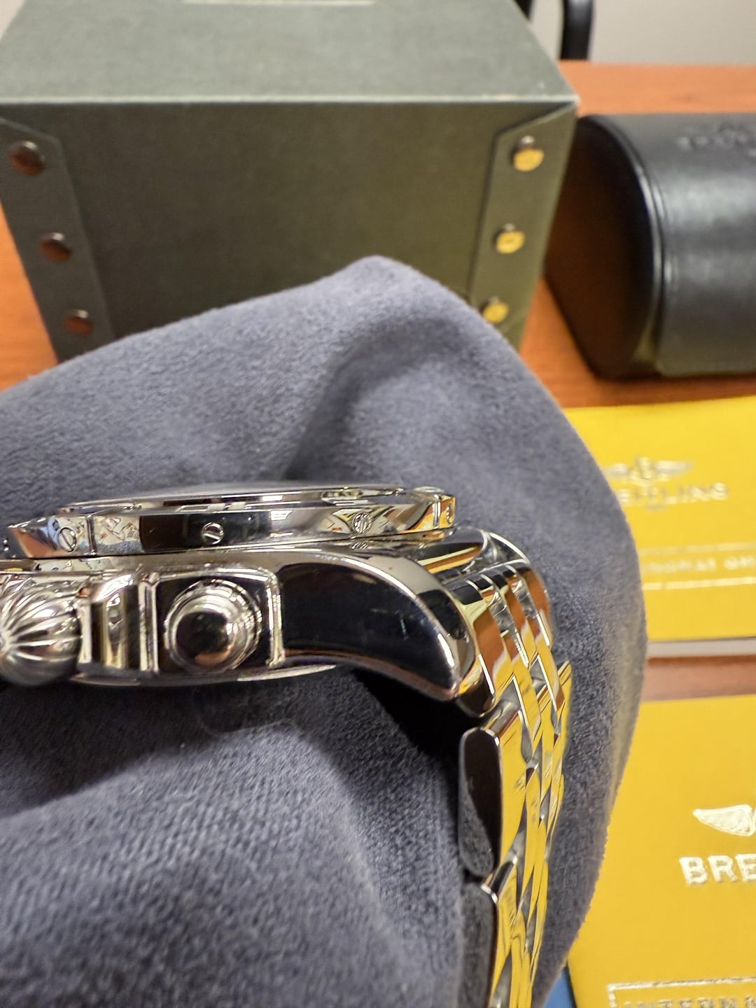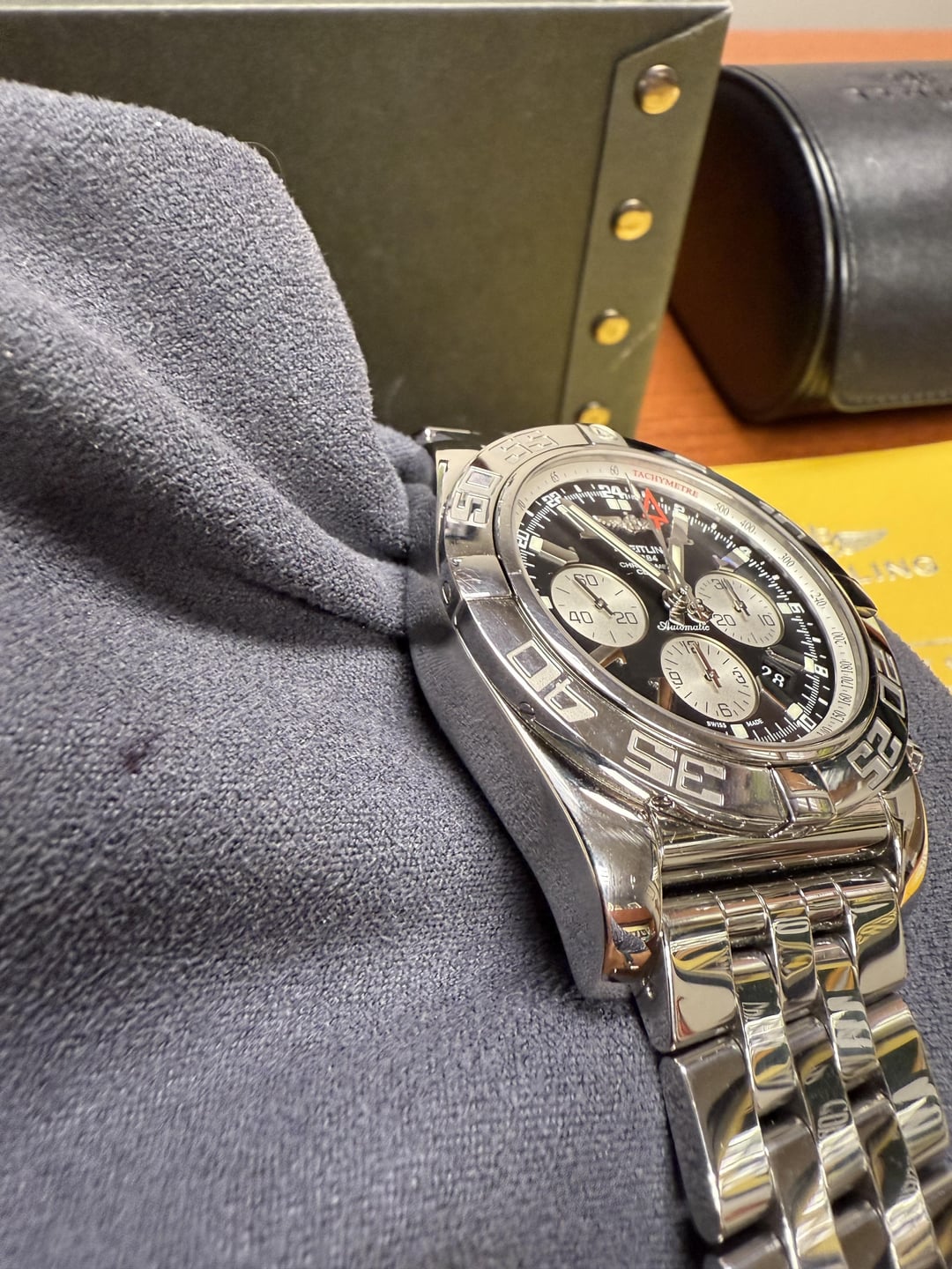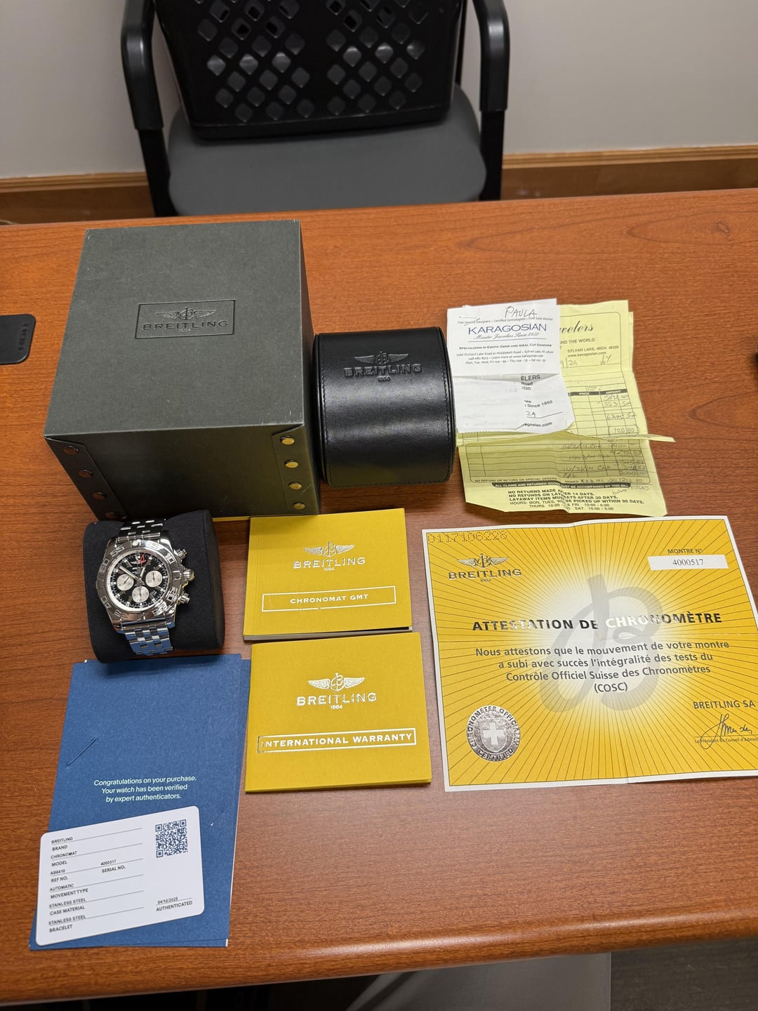 **More Photos & Video** [**https://imgur.com/a/yaiQ3Tn**](https://imgur.com/a/yaiQ3Tn) I am the 2nd owner of this watch. I purchased it off ebay as you can see from the authenticity card. This is an amazing watch that I have had my eye on for a long time but another watch is calling my name. In my opinion this design blows away the new ones. This features the old breitling logo and the "B" and anchor as the counter balance on the large second hand. The Red GMT hand is one of my favorite designs for a GMT hand. The original owner had this watch professionally polished by Breitling and it was serviced before shipping to me. Keeping excellent time. This is a big watch but does not wear that way. Minor desk diving marks on the bracelet and high polished areas of the case. No major nicks or dings. Crystal is free of scratches. Watch will ship with outer box, inner watch roll, international warranty, manual, COA, original receipt, & ebay authentication. Watch was originally purchased in 2014. The Breitling Chronomat GMT AB0410 is a bold, aviation-inspired chronograph that combines robust design with world-time functionality. Housed in a 47mm stainless steel case, it features a striking rotating bezel, screw-down crown, and a distinctive rider-tab design. Powered by the in-house automatic Caliber B04 movement, it offers chronograph capability along with an independently adjustable GMT hand—ideal for frequent travelers. Its high legibility, 70-hour power reserve, and COSC-certified precision make it a reliable companion for both pilots and adventurers. Asking price is $3000 overnight insured shipping with signature included. Conus shipping only Paypal F&F or Zelle only. I have over 200 confirmed transactions over at [u/knife\_swap](https://www.reddit.com/user/knife_swap/) buy with confidence. I am more than happy to facetime prior to purchase to show you the watch. Please comment on this post before sending a message. Thank You for looking
