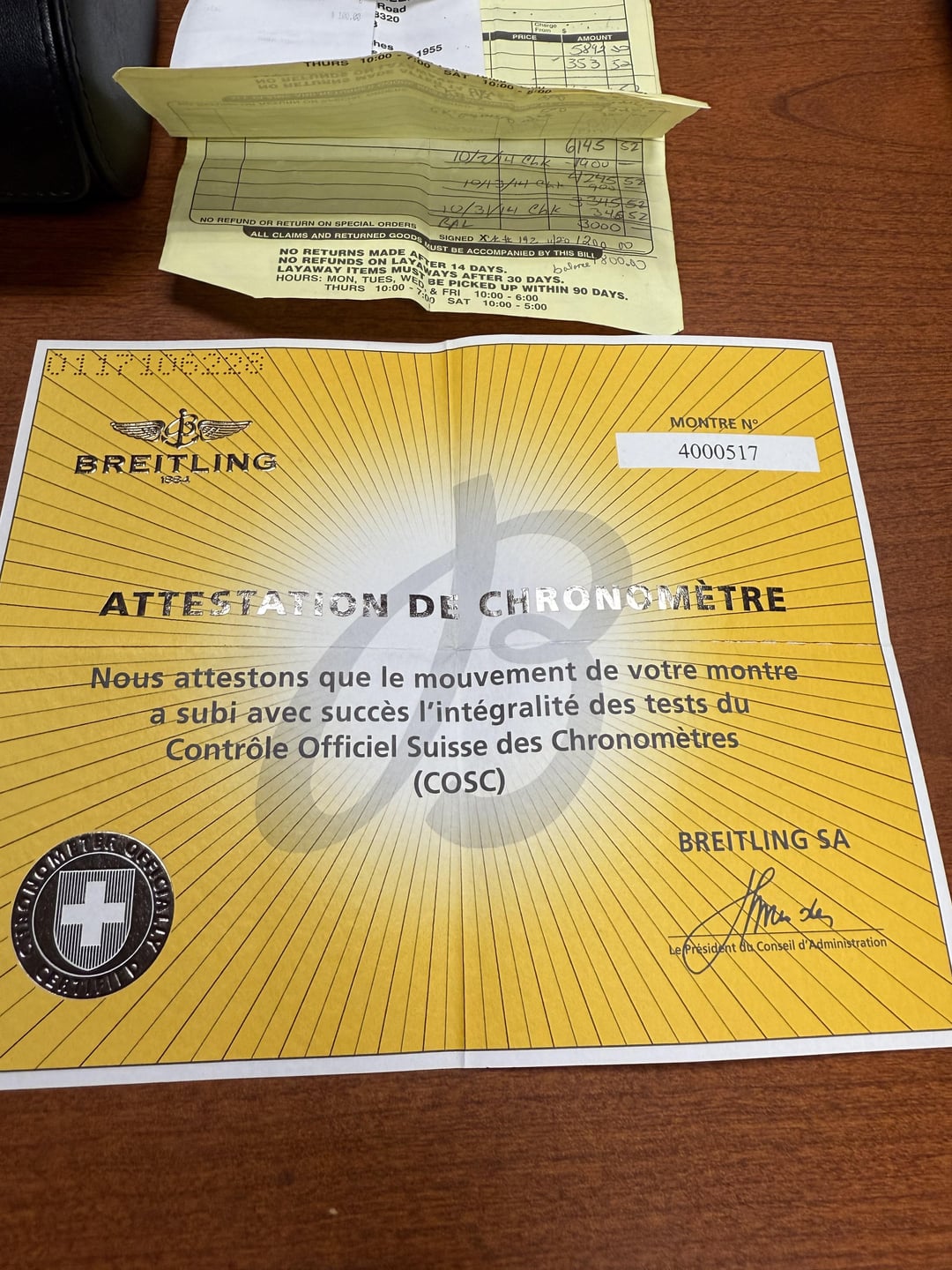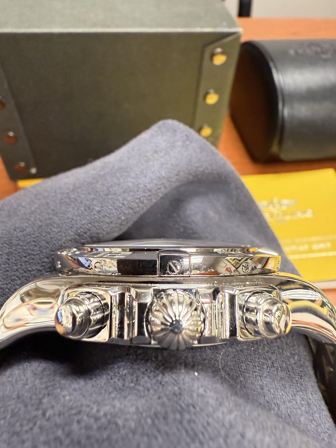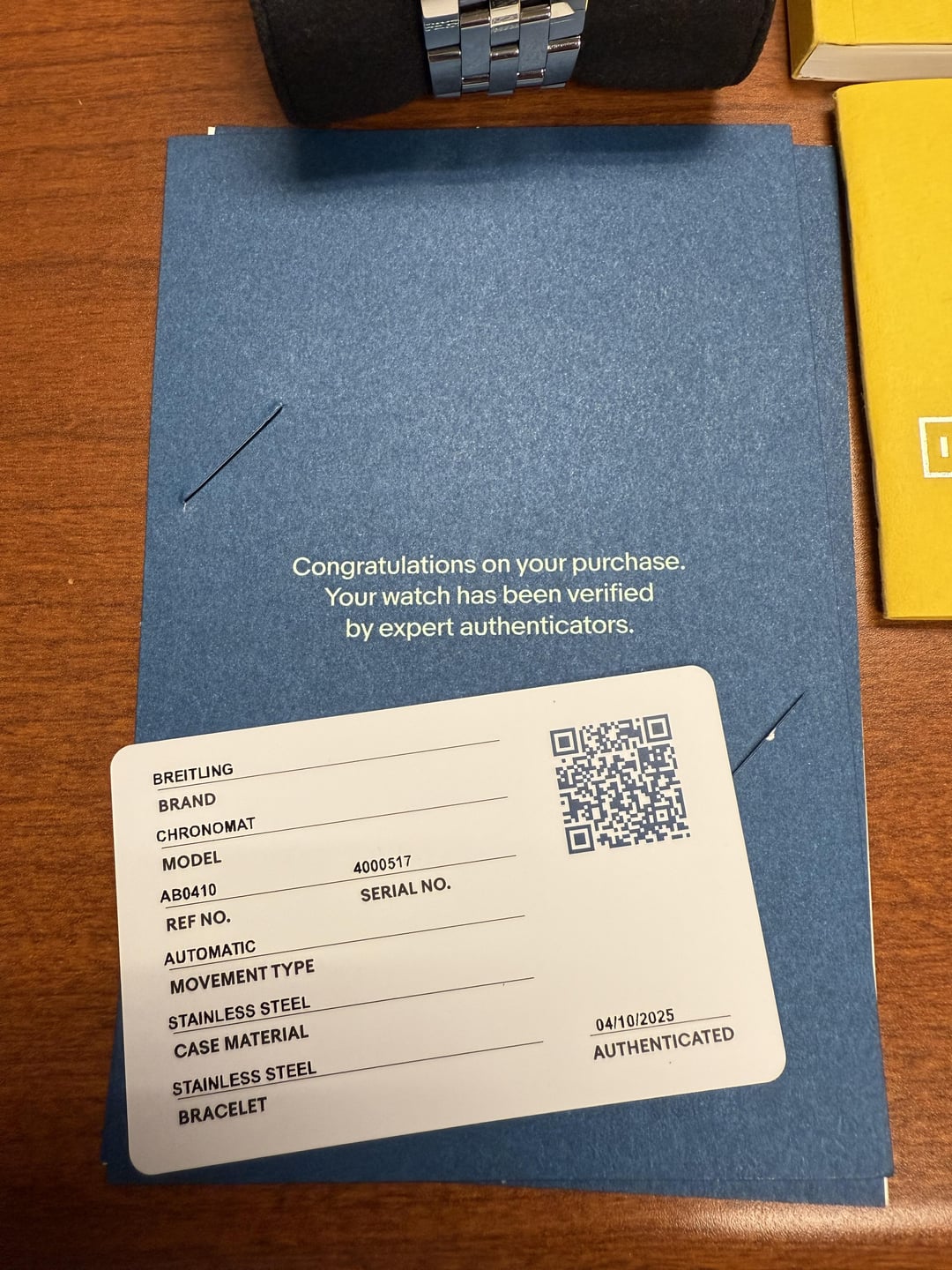 **More Photos & Video** [**https://imgur.com/a/yaiQ3Tn**](https://imgur.com/a/yaiQ3Tn) I am the 2nd owner of this watch. I purchased it off ebay as you can see from the authenticity card. This is an amazing watch that I have had my eye on for a long time but another watch is calling my name. In my opinion this design blows away the new ones. This features the old breitling logo and the "B" and anchor as the counter balance on the large second hand. The Red GMT hand is one of my favorite designs for a GMT hand. The original owner had this watch professionally polished by Breitling and it was serviced before shipping to me. Keeping excellent time. This is a big watch but does not wear that way. Minor desk diving marks on the bracelet and high polished areas of the case. No major nicks or dings. Crystal is free of scratches. Watch will ship with outer box, inner watch roll, international warranty, manual, COA, original receipt, & ebay authentication. Watch was originally purchased in 2014. The Breitling Chronomat GMT AB0410 is a bold, aviation-inspired chronograph that combines robust design with world-time functionality. Housed in a 47mm stainless steel case, it features a striking rotating bezel, screw-down crown, and a distinctive rider-tab design. Powered by the in-house automatic Caliber B04 movement, it offers chronograph capability along with an independently adjustable GMT hand—ideal for frequent travelers. Its high legibility, 70-hour power reserve, and COSC-certified precision make it a reliable companion for both pilots and adventurers. Asking price is $3000 overnight insured shipping with signature included. Conus shipping only Paypal F&F or Zelle only. I have over 200 confirmed transactions over at [u/knife\_swap](https://www.reddit.com/user/knife_swap/) buy with confidence. I am more than happy to facetime prior to purchase to show you the watch. Please comment on this post before sending a message. Thank You for looking