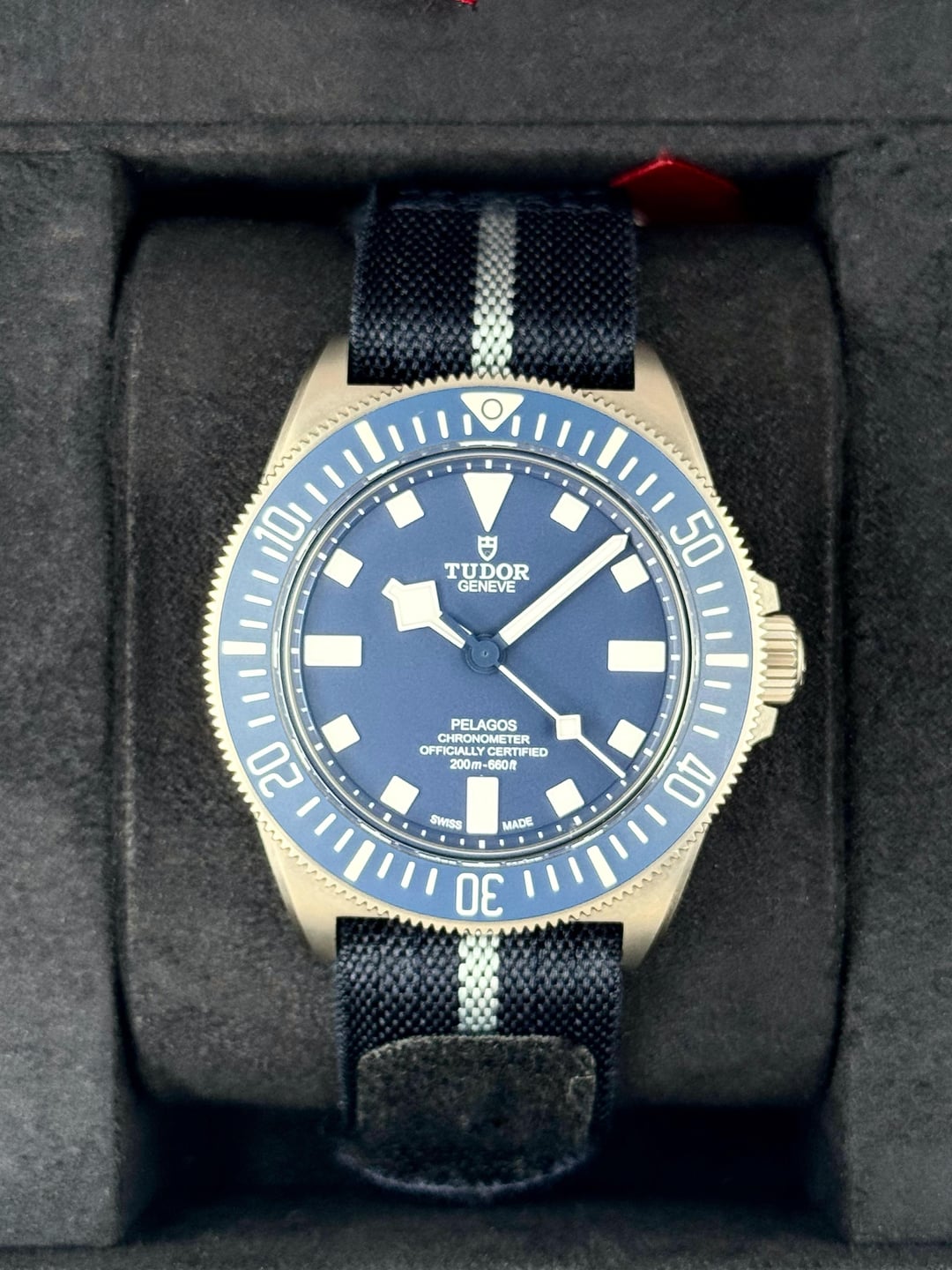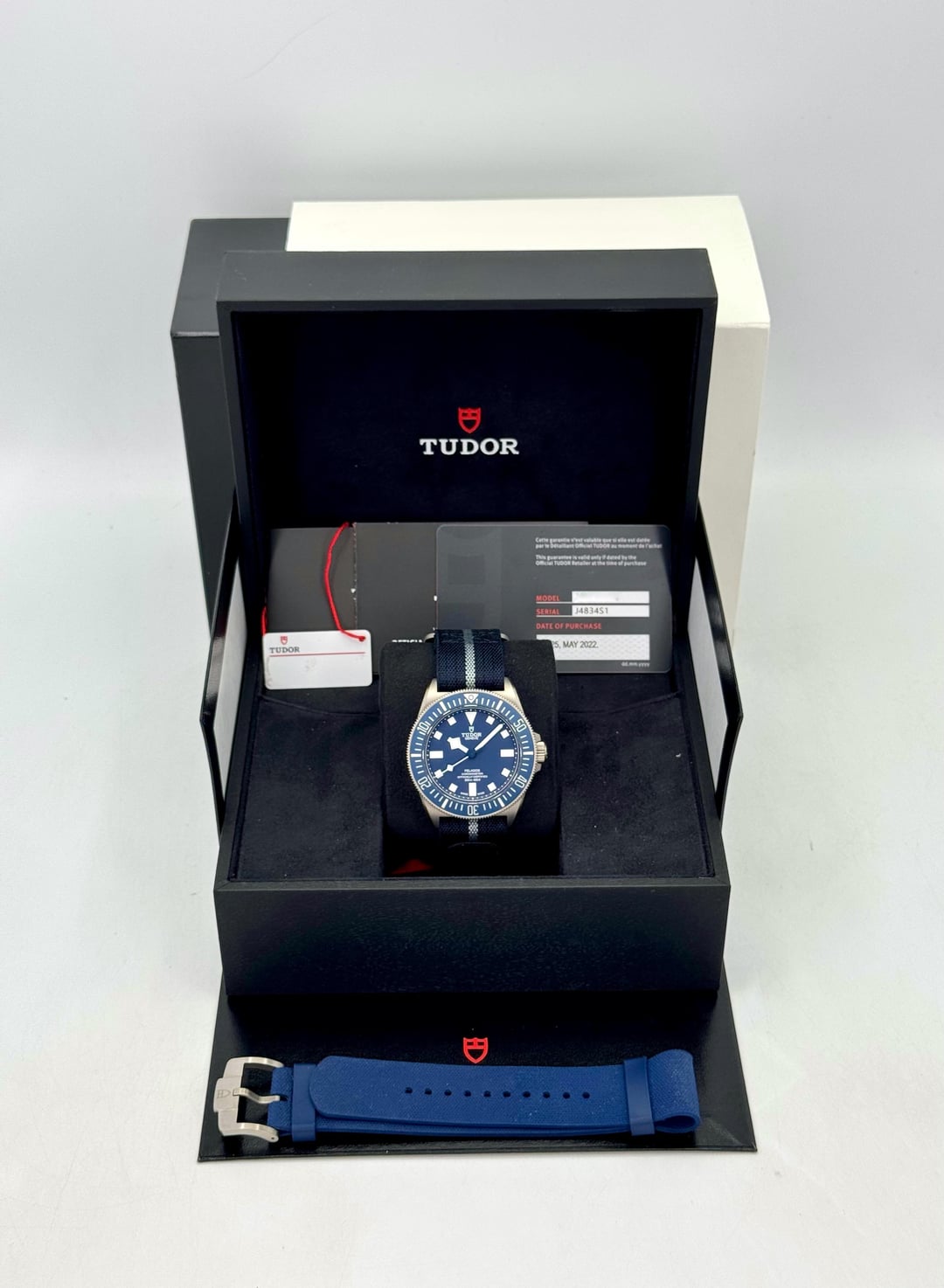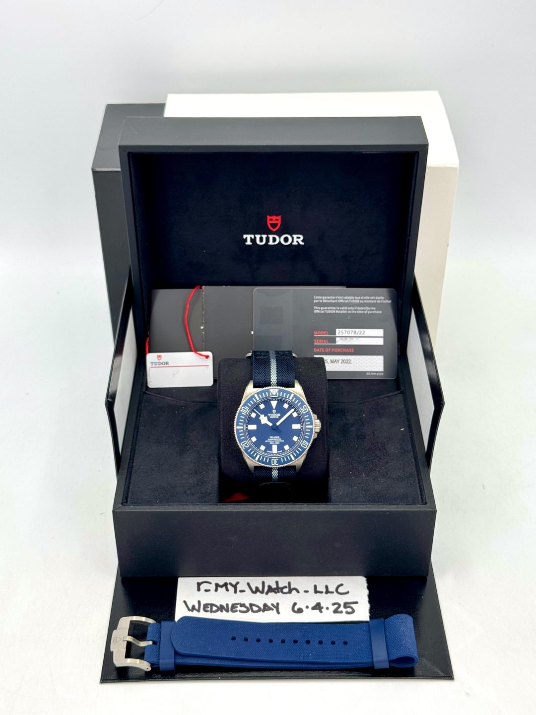 🔵2022 Tudor Pelagos 42mm 25707B/22 Titanium Blue Dial 🔵TRADE or SELL us your luxury watch, all brands considered. Message me details. **Includes the following:** **✔️Original Tudor Double Boxed** **✔️Box and Papers - Yes** **✔️Warranty card dated May 2022** **✔️5 year manufacturer warranty** **✔️Manual and Warranty booklets** **✔️Material: Titanium** **✔️White Hang Tag included** **✔️Size: Adjustable Blue Fabric and Velcro strap** **✔️Additional navy blue rubber strap with woven motif and titanium buckle** **✔️Watch is in excellent overall condition. Please see photos for details.** **✔️**[**Trades**](https://mywatchllc.com/pages/sell-rolex-watch) **welcome** **✔️Appraisal included** Business Name: **My Watch LLC** LOCATION: Oak Park, Michigan ✔️[MyWatchLLC.com](http://mywatchllc.com) for current inventory ✔️Google Business Listing [https://g.co/kgs/Cmd6FPW](https://g.co/kgs/Cmd6FPW) ✔️Business Hours M-F 9-6 ✔️Facetime/Video chat/calls welcome to view the watch interested. ✔️Contact: 248-422-0909 via text or call for quickest response. 🟢TERMS: Visit [MyWatchLLC.Com](http://mywatchllc.com) for payments accepted 🟢REFERENCES/REVIEWS: We are well reviewed on all platforms from google, trust pilot, rolexforums, additionally we have 300+ reference in multiple FaceBook watch groups, reference checks welcome. 🟢SHIPPING: If you are not local, we offer Fully Insured FedEx overnight shipping in the USA for a fee. International shipping available. [https://mywatchllc.com/products/2022-tudor-pelagos-42mm-25707b-22-titanium-blue-dial](https://mywatchllc.com/products/2022-tudor-pelagos-42mm-25707b-22-titanium-blue-dial)
