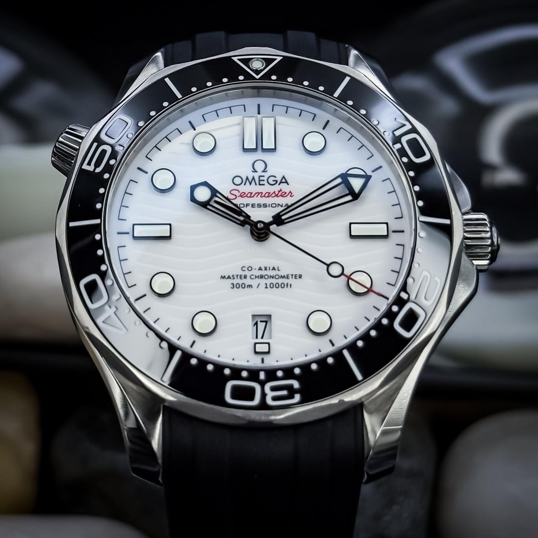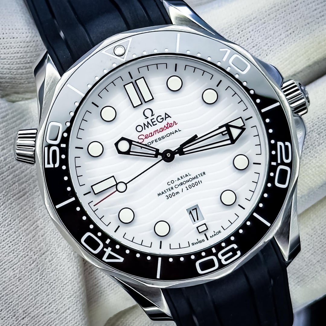 **Omega Seamaster Diver 300M Co-Axial Master Chronometer – White Dial – 42mm – Ref. 210.32.42.20.04.001** For sale is a stunning **Omega Seamaster Diver 300M** featuring the sought-after **white ceramic dial** paired with a 42mm stainless steel case on rubber strap. This modern classic embodies Omega’s legacy of precision, durability, and sophisticated design. It’s powered by the **in-house Omega Caliber 8800**, a METAS-certified Master Chronometer movement with anti-magnetic resistance up to 15,000 gauss and a 55-hour power reserve. # 📌 Condition: Very Good * Minimal signs of wear on caseback * Crystal and ceramic bezel are flawless * Lume is strong and evenly applied * Rubber and clasp are in great condition * Watch is keeping excellent time (verified on timegraph) # 🔧 Key Features * **White ceramic dial** with blackened hands and indexes * **Unidirectional ceramic bezel** with white enamel diving scale * **42mm stainless steel case** – water resistant to 300 meters (1000 ft) * **Omega Caliber 8800** – Co-Axial escapement, automatic winding * **Transparent caseback** showcasing movement * **Helium escape valve** – ideal for professional divers # 📦 What’s Included * Watch with original box, papers, manual and extra Horus white strap * Rubber strap fits a wrist size of approx. 6.25" to 8.25" # 💲 Price Asking 💲4️⃣1️⃣5️⃣0️⃣ +🏷️ Timestamp and complete set: [https://imgur.com/a/MU9EPR4](https://imgur.com/a/MU9EPR4) # 💎 Why This Watch? The white dial variant of the Seamaster 300M has quickly become a collector favorite for its bold, clean aesthetic and versatile wearability. Whether you're heading to the office or diving in open waters, this Seamaster delivers unmatched performance with timeless Omega style as featured in 007, James Bond movies. 📦 **Ships fast and securely via insured shipping (FedEx Overnight)** ✅ **100% Authentic – Buy with confidence** 💬 **Feel free to message with any questions**