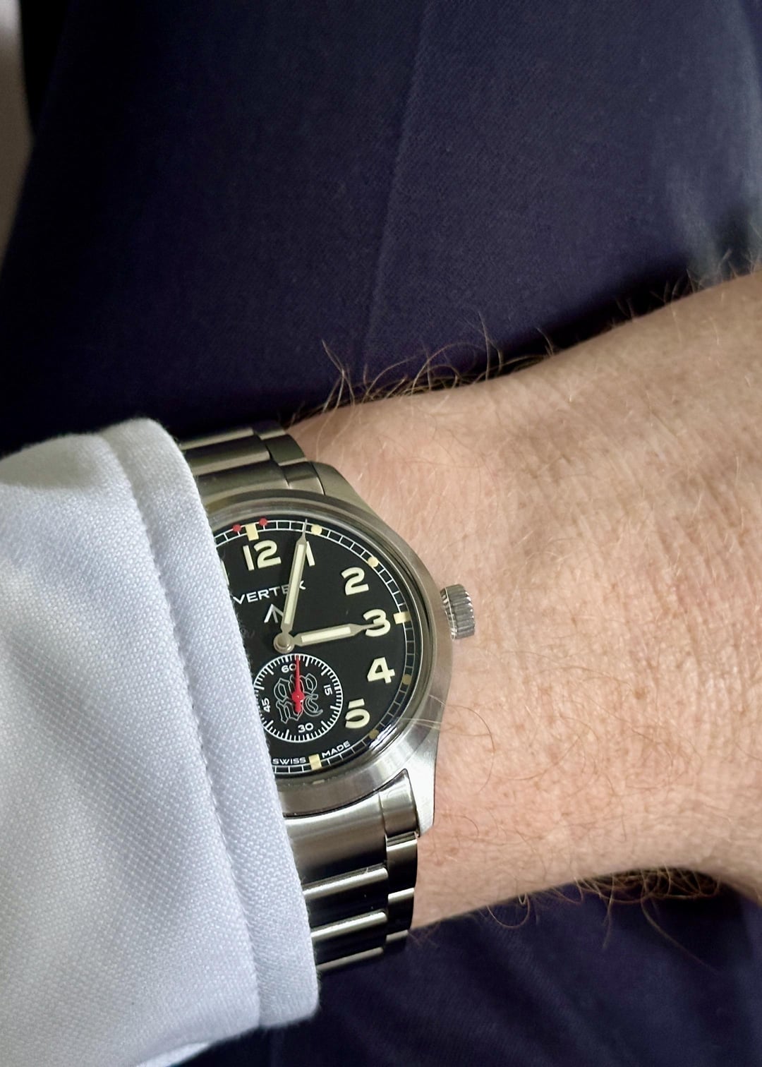 During WWII, the allies needed watches for their soldiers, put out the specs, and twelve companies produced these original watches. Many of the biggest names in watchmaking responded, and among them: Vertex. These are the M1 Garands of watches. Video: https://share.icloud.com/photos/02dUzcaEX41bAr8Mh1zoUsG1Q The M100AWWC is inspired by those watches, but with modern specs. Not only that, but the steel bracelet combined with the slim profile gives the whole watch a new GADA vibe. 40mm, 100m WR, automatic winding, quick release and on-the-fly microadjust bracelet, and indices carved from solid blocks of X1 lume. AWWC “Anti Watch, Watch Club” is a veteran and first responder-centric non-profit that focuses on doing good works within those communities. This piece is in good condition with full kit including three straps, papers, and a really cool case. Runs near perfect. Originally offered at $3400 plus $400 for the bracelet, I’m asking for $2300 shipped CONUS. This Vertex inspired me to buy another (M60), and there’s only room for one!
