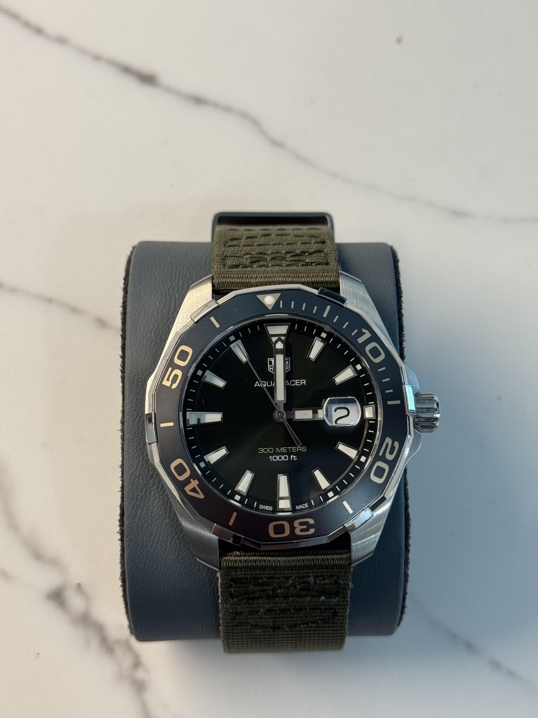 TAG Heuer Aquaracer 43mm Quartz – WAY101E.FC8222 PRICE $1475 Location Dallas, TX or Fayetteville, AR Willing to ship! 🔹 Key Features: • 43mm stainless steel case • Bold blue sunray dial with horizontal lines and white Super-LumiNova® indexes • Unidirectional rotating bezel with 60-minute scale • TAG Heuer Caliber Quartz movement – ultra-reliable and accurate • Screw-down crown and case back for 300m water resistance • Scratch-resistant sapphire crystal • Khaki NATO-style fabric strap with TAG Heuer buckle 🔹 Condition: Lightly worn and well-cared for. Keeps perfect time and shows minimal signs of wear. Strap is in great condition. Everything functions exactly as it should. 🔹 Why You’ll Love It: Perfect for those who want the luxury of a Swiss dive watch without the high-maintenance of an automatic. This Aquaracer blends rugged design with everyday comfort – from the office to open water.
