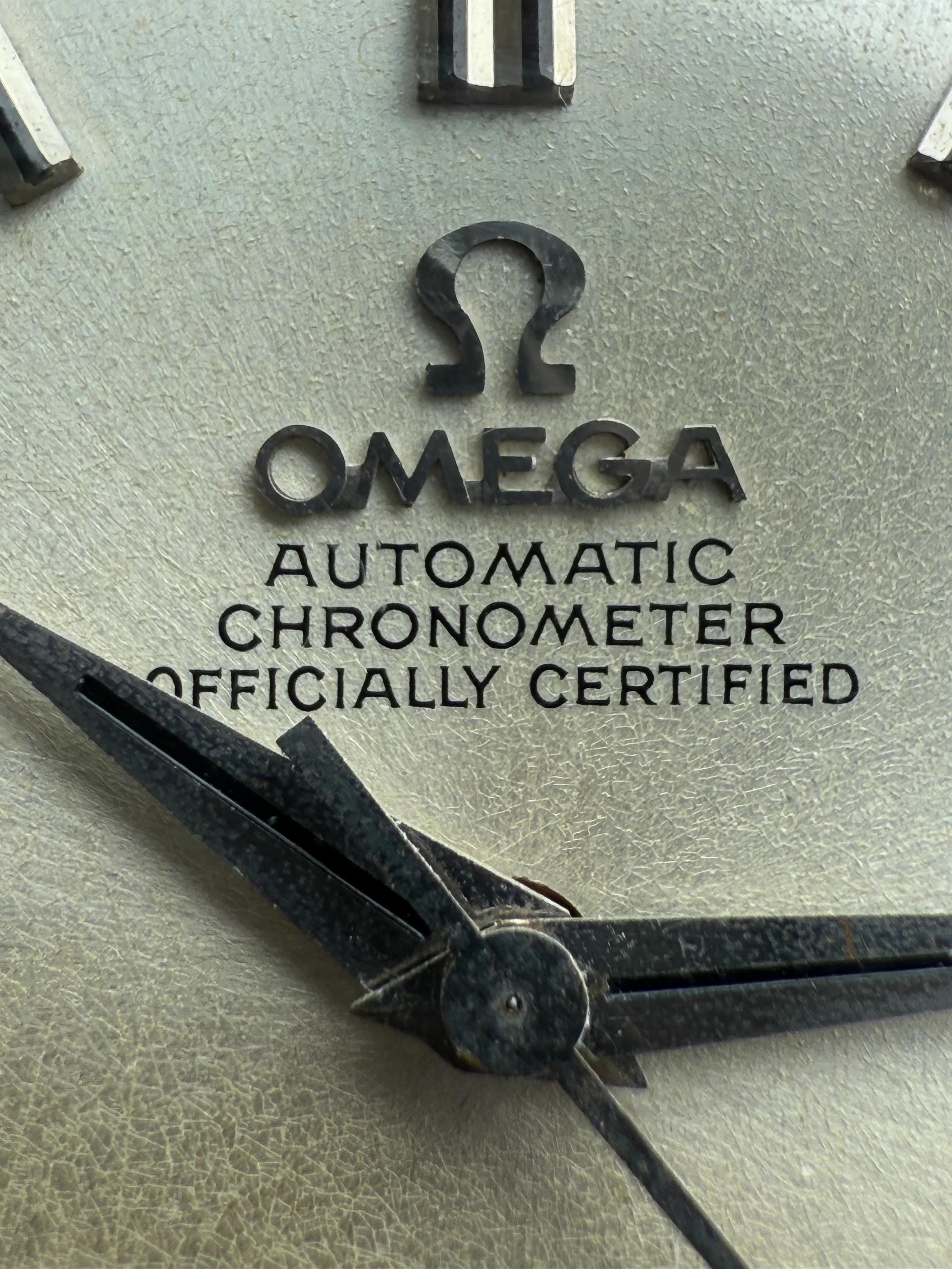 - Dial: Beautiful original white aged dial with leaf vein pattern, applied Omega logo, onyx inserted hour markers, dauphine hands, faceted date-aperture frame at 3; prints, hands and hour markers are all good.