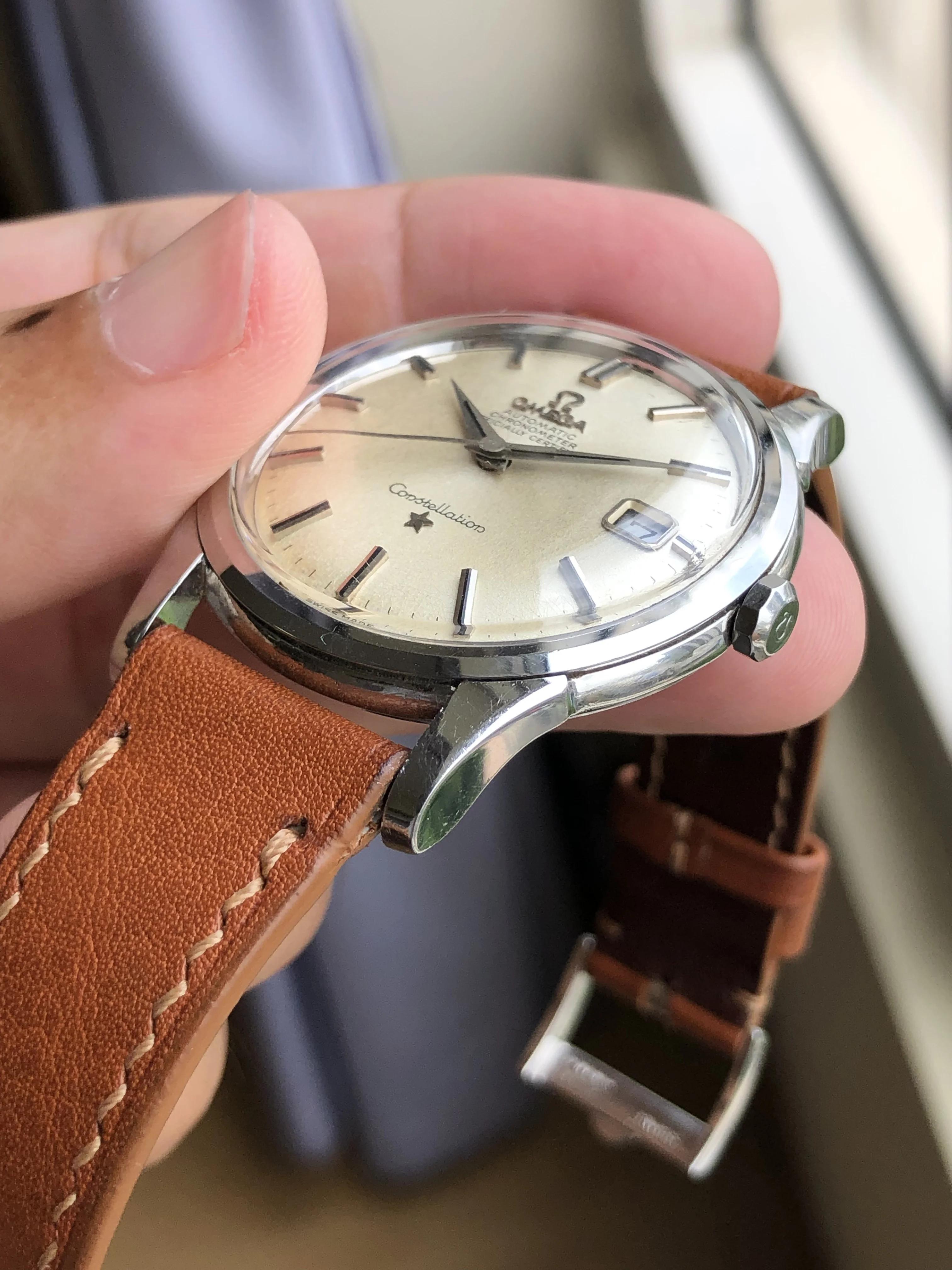 A very nice stainless steel Omega Constellation 168.001, jumbo size 37mm, beautiful aged dial, handmade leather strap, original Omega buckle, serviced recently, free shipping with insurance in EU.
