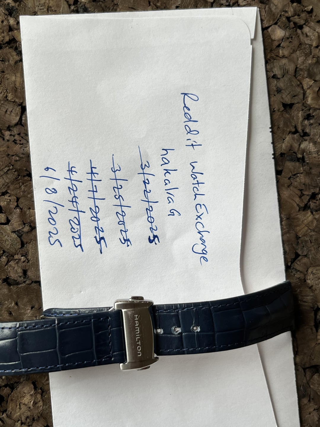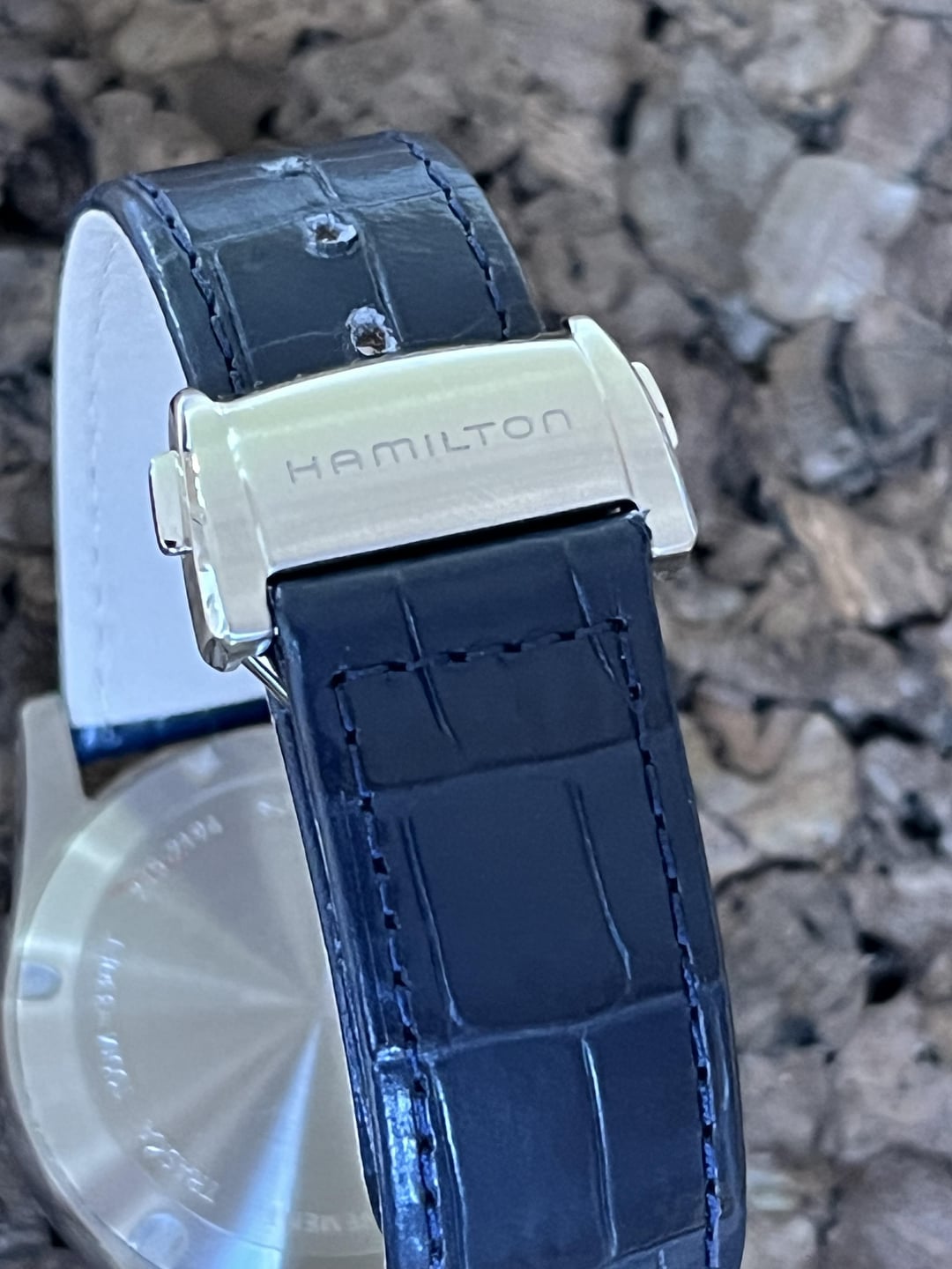 * Asking a negotiable $85 (CONUS shipping on me, fees if any on you) * 20mm Hamilton Strap and Deployant ONLY – Watch is shown as an example! * Beautiful blue croc-calf strap with a raised center that is like some of the older Breitling leather straps.  Comes with a really nice Hamilton deployant. * This would look fantastic on a watch like the Hamilton Intramatic or a white or blue dialed Khaki – would completely change up the white dialed Murph 38 * As you can see from how clean the strap is, very rarely used, but was mounted and stored on a watch pillow, so it’s comfortable immediately. * I’m a private collector slimming my collection down and have 100+ transactions on WatchExchange – and I’m happy to talk to you on the phone or FaceTime once you are sure you’d like to proceed.  Straight sale strongly preferred and priced to reflect this.  Thank you for reading my post, and thanks also to the Mod community on WatchExchange.