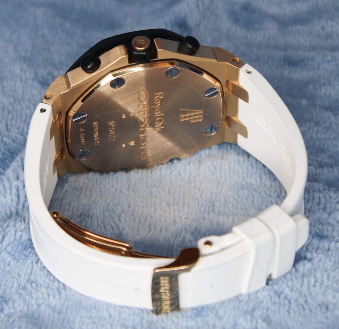 Audemars Piguet Royal Oak Offshore Chronograph 25940OK.OOD002CA.02 A stunning Rose Gold edition of the 42 ROO collection. Very rare to find this variation with the gold trim sub dials and the rubber clad bezel in such good condition. Slight marks on the case and clasp, please see pictures for details. I use a high-res macro lens for photographs that picks up marks and imperfections not visible to the eye. Sale includes original inner and outer boxes along with AP archive papers. Happy to answer questions. I’m very customer service focused and strive for 100% positive transactions each and every time. I ship fully insured overnight to the FedEx location nearest your address with hold for pickup. I am also open to meeting in person. Imgur link: [https://imgur.com/a/ap-royal-oak-offshore-25490ok-UDf4RFQ](https://imgur.com/a/ap-royal-oak-offshore-25490ok-UDf4RFQ) Price: $26,500 @IslandTimeLuxury Cape Coral FL