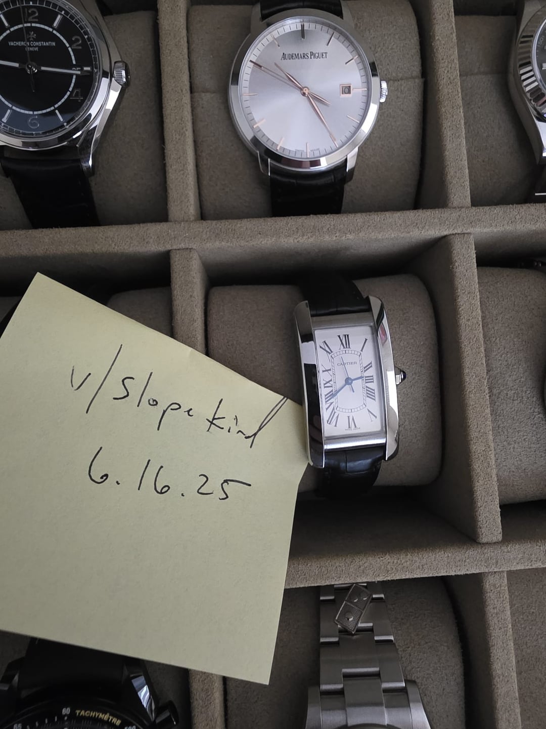 **Cartier Tank Américaine – Medium Model** **Reference:** WSTA0017 **Movement:** Mechanical with automatic winding **Case:** Stainless steel **Crown:** Octagonal, set with a synthetic blue spinel **Dial:** Silvered with blued-steel sword-shaped hands **Strap:** Shiny navy blue alligator skin **Buckle:** 14 mm adjustable folding clasp **Water Resistance:** 30 meters This elegant Cartier Tank Américaine is in **excellent condition**, showing minimal to no signs of wear. It comes complete with the **original box and booklets** (please note: **no warranty card is included**). **Extras Included:** * One extra men’s-size Cartier **alligator strap** with **white gold Cartier buckle** * Original Cartier **alligator strap and deployant clasp** A timeless piece offered at a **great value**—don’t miss the opportunity to own this classic Cartier design with luxurious extras. Price = $3999 shipped Pics & Timestamp = [https://imgur.com/a/koePACo](https://imgur.com/a/koePACo) IG =watchfornia Cheers, Adam
