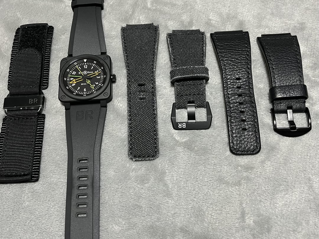 For sale - Bell & Ross BR03 RadioCompass Limited Edition 42mm Ceramic 03-92 Limited to 999 pieces. Like new condition without any visible marks. Comes with the complete set - boxes, papers, warranty card, tools, and two OEM straps(rubber and fabric). I'm also including a handmade canvas strap, a leather strap, and an extra B&R buckle ($350 value). Priced to sell at $2,550 shipped (**no trades please**). Thanks for looking!