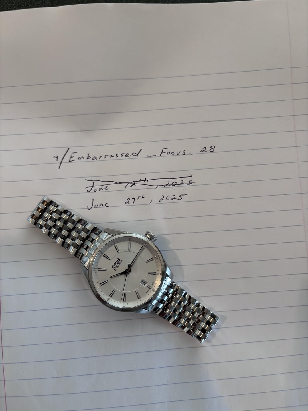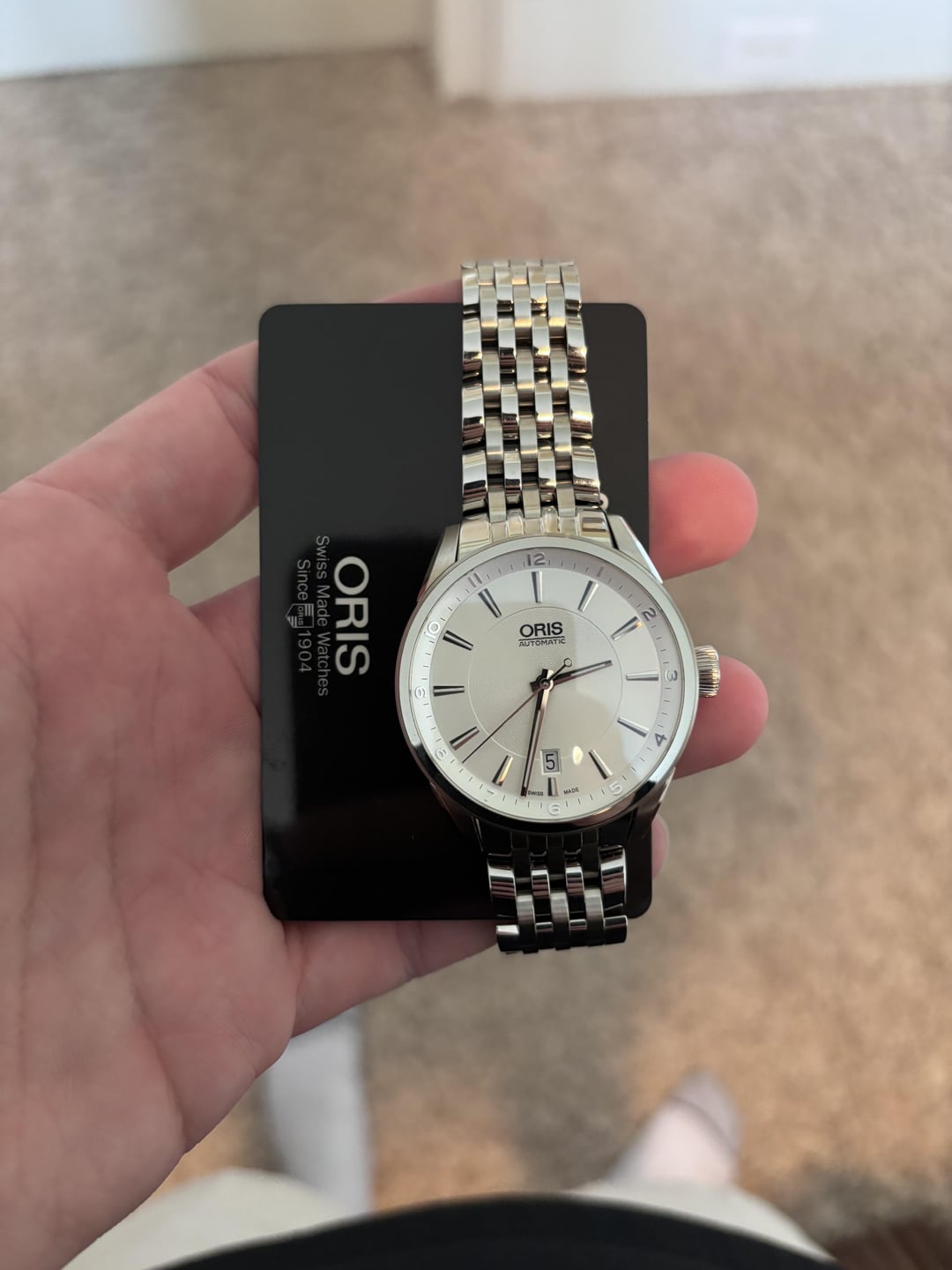 Selling my Oris Artix Date (ref. 73377134031MB), a classy, understated dress piece from one of the most respected Swiss independents. This watch features a crisp silver sunburst dial, polished hands and markers, and comes on the original Oris stainless steel bracelet. This one’s in mint condition, includes the full set (box, warranty card, booklet), and is ready for your next formal rotation or everyday office wear. ⸻ Specs: • 40mm stainless steel case • Automatic Oris Caliber 733 (base SW200) • 38-hour power reserve • Sapphire crystal • Exhibition caseback • Polished stainless steel bracelet • Reference: 73377134031MB • Original MSRP: ~$1,800 ⸻ Condition: • Case/Bracelet: Mint, no visible wear • Movement: Running perfectly • Full Set: Includes original Oris box, card, and manuals ⸻ Price: $600 OBO – CONUS shipping included PayPal or Venmo preferred ⸻ Location: Greenville, SC Timestamp: Available upon request