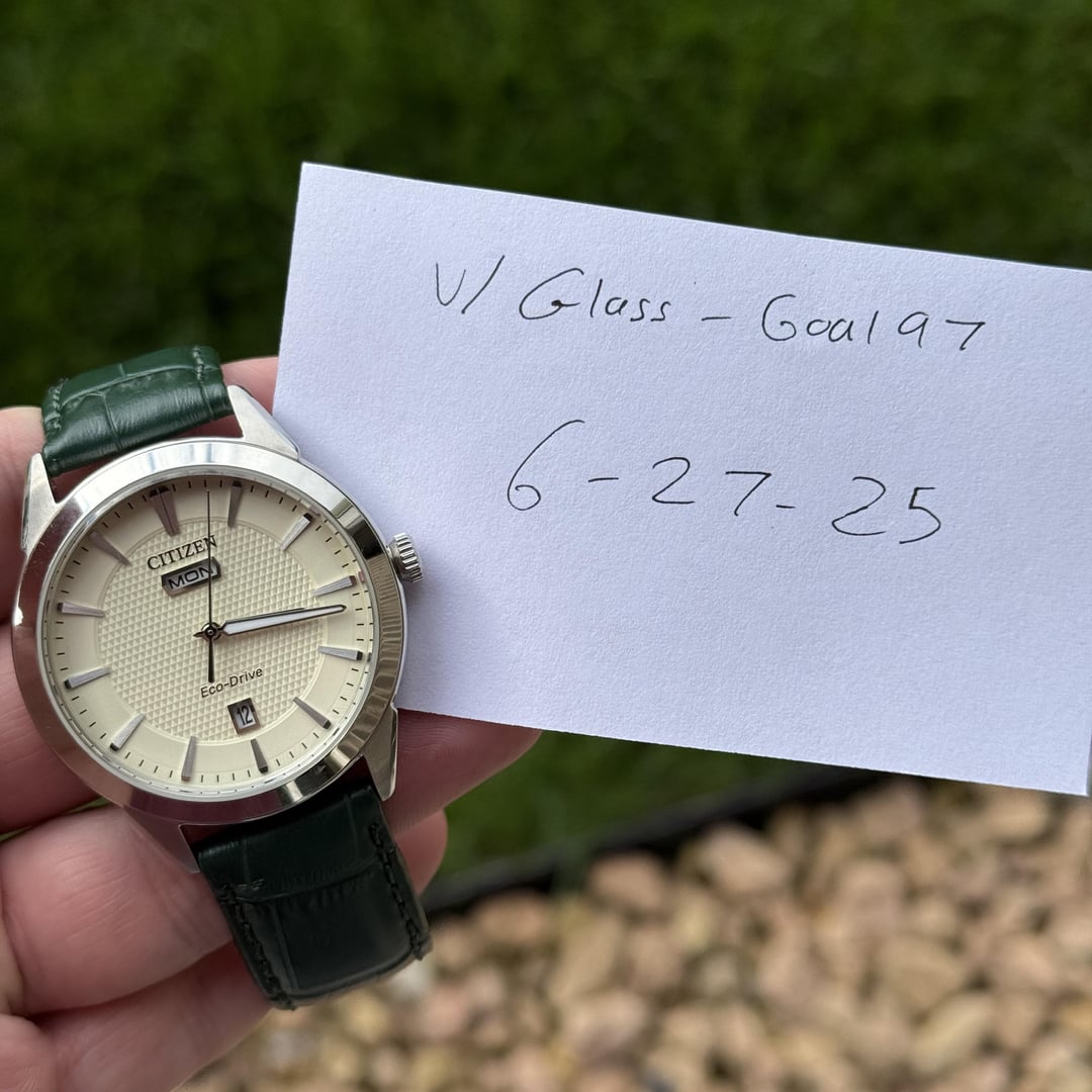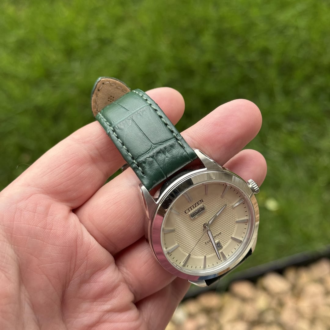 Hey all, up for sale is this classy cream textured dial Citizen Corso on a green strap. Watch only. Timestamp: In Photos Price: $75 USD shipped CONUS, if you're international please message to inquire about shipping/payment options Payment: Zelle, Paypal, or if you have 10+ positive feedback and are based in the US I will take CC via Stripe Portal as an option (+3.5% to buyer). MN buyers without a reseller certificate (ST3) will be subject to sales tax. PM/comment any offers or questions! Based just outside of Minneapolis, MN. I'm a full-time jeweler and watch dealer, so I'm rarely opposed to trades although I'd prefer to sell this piece outright. If you do have a trade that will be less than the value of this watch, send pictures and info to my messages and I'll take a look. Thanks for reading!