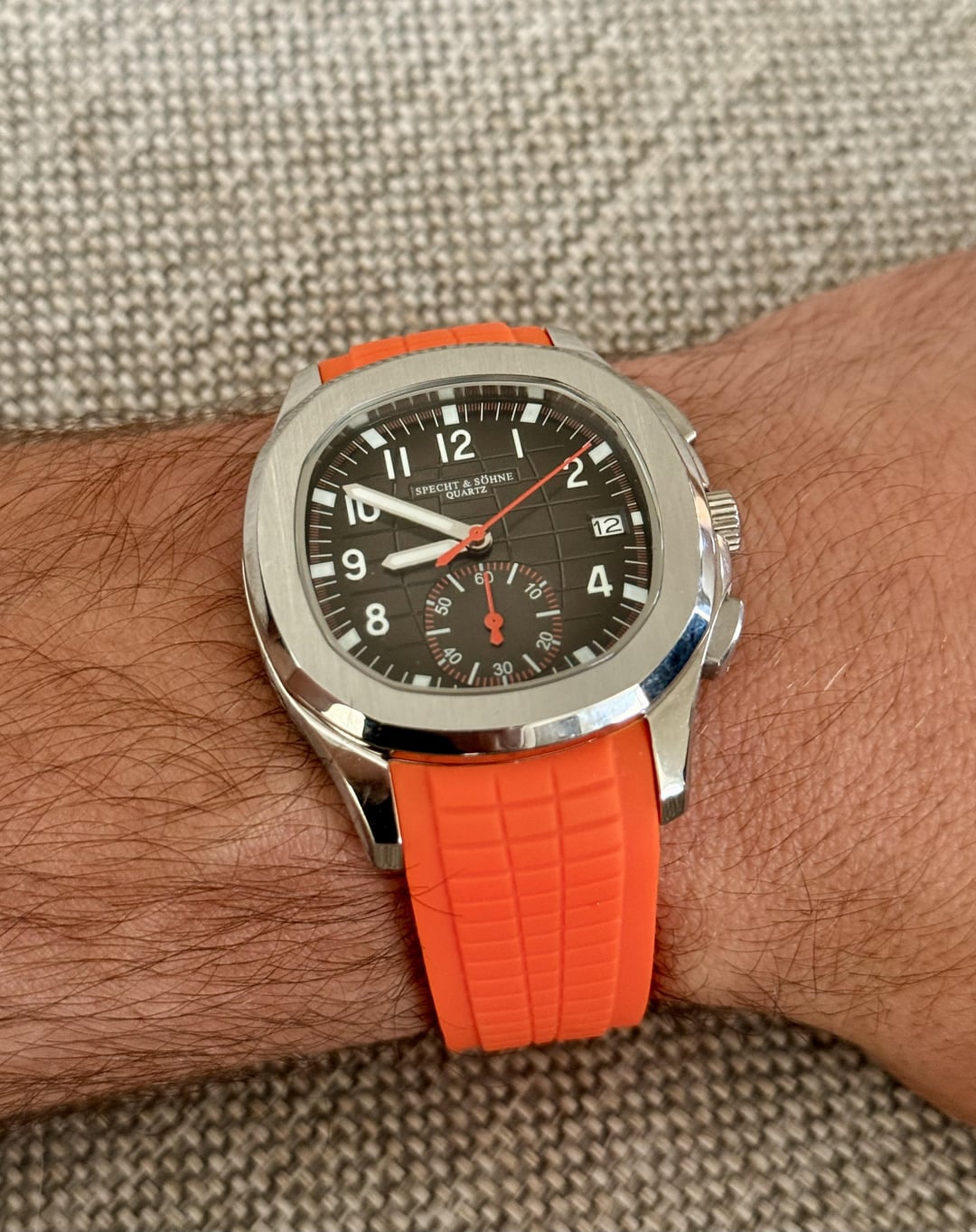 Album: [https://imgur.com/a/H9XKriZ](https://imgur.com/a/H9XKriZ) Up for sale is my Specht & Söhne Aquanaut Dual Time Quartz – Orange Edition, a fun and bold homage to the Patek Philippe Aquanaut. This version features a bright orange tropical strap and dual time functionality, making it a great summer/beater piece. Purchased new and never worn—just a bit too flashy for my rotation. # DETAILS / SPECIFICATIONS: * Brand: Specht & Söhne * Model: Aquanaut Dual Time Quartz – Orange Edition * Movement: Quartz (dual time + 60-second subdial) * Case Material: 316L Stainless Steel * Case Diameter: 40mm (without crown) * Lug Width: 20mm * Crystal: Sapphire with AR coating * Water Resistance: 50m * Strap: Orange rubber tropical strap with push-button deployant clasp (cut-to-fit style) # CONDITION & PERFORMANCE: * Case: Great condition. No marks, scratches, or signs of wear. * Dial, Hands & Crystal: Flawless—no dust or defects. Lume is functional on hands and numerals. * Strap & Clasp: Strap has been cut to a 6.5” wrist. Additional straps can be purchased online. * Performance: Runs perfectly. All subdials and pushers function as expected. # PRICE & DELIVERY: * Price: $69 USD (shipping included) * Payment: PayPal F&F, Venmo, or Zelle * Shipping: USPS Priority Mail with tracking. CONUS only. Securely packaged. * Contact: DM with questions, offers, or if you’d like additional pics or a quick video.