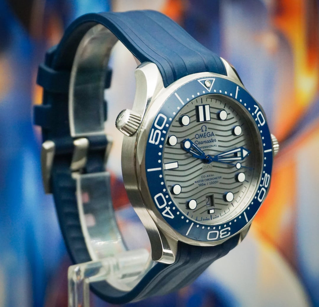 The **Omega Seamaster Diver 300M** delivers modern dive watch performance in a sleek, contemporary colorway. Its 42mm stainless steel case is paired with a blue ceramic bezel and a matte grey dial, laser-engraved with the collection’s signature wave pattern. Luminous indices and hands ensure optimal readability, while the helium escape valve and screw-in crown provide true professional dive functionality. Powering this model is Omega’s Co-Axial Master Chronometer Caliber 8800, visible through the sapphire caseback. The watch is magnetic-resistant to 15,000 gauss and offers up to 55 hours of power reserve. Finished with a comfortable blue rubber strap, this timepiece makes a versatile and striking addition to any collection. This 2023 example is in very good condition, showing minimal signs of wear. It comes complete with its Omega wooden presentation box, instruction manual, international warranty card, Master Chronometer card, pictogram card, and original accessories. Please review all images for a closer look at the condition and included items. **Key Features** * **Reference**: 210.32.42.20.06.001 * **Case Size**: 42mm * **Case Material**: Stainless Steel * **Bezel**: Blue ceramic, unidirectional rotating * **Dial**: Grey ceramic with laser-engraved wave pattern, luminous markers * **Movement**: Omega Caliber 8800, automatic, Co-Axial Master Chronometer * **Functions**: Hours, minutes, seconds, date * **Crystal**: Domed sapphire with anti-reflective treatment * **Water Resistance**: 300m / 1000ft * **Power Reserve**: Approximately 55 hours * **Strap**: Blue rubber * **Clasp**: Stainless steel tang buckle * **Year**: 2023 * **Condition**: Very good – light signs of wear **Caseback**: Sapphire exhibition with wave-edge engraving