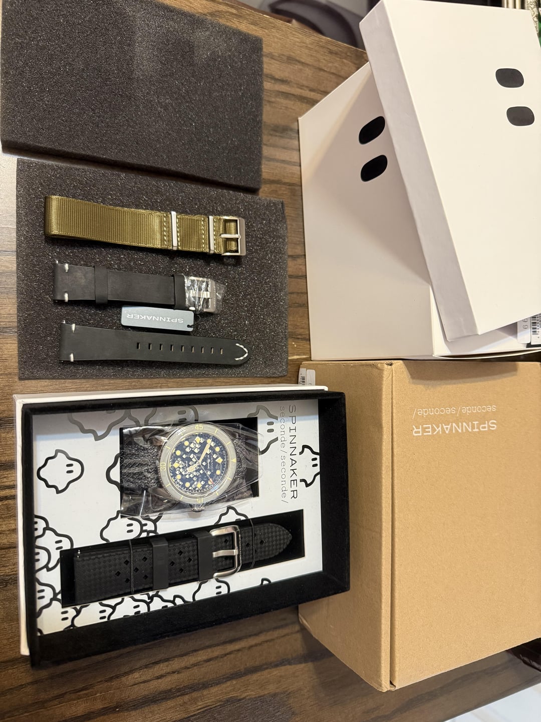 Up for sale is a Spinnaker Second/Seconde 50 Phantoms in the ghost bezel variant. This is the first release and I was fortunate enough to get one before the site crashed and sold out in 47 second LOL. Condition is brand new and flawless. It comes as a complete set with all boxes/paper work and accessories. I am also throwing in 2 Crown & Buckle Single pass Straps that I felt worked well with this watch. I am asking $800 (negotiable) via bank wire, Zelle, or venmo and will ship anywhere within the US from Hawaii
