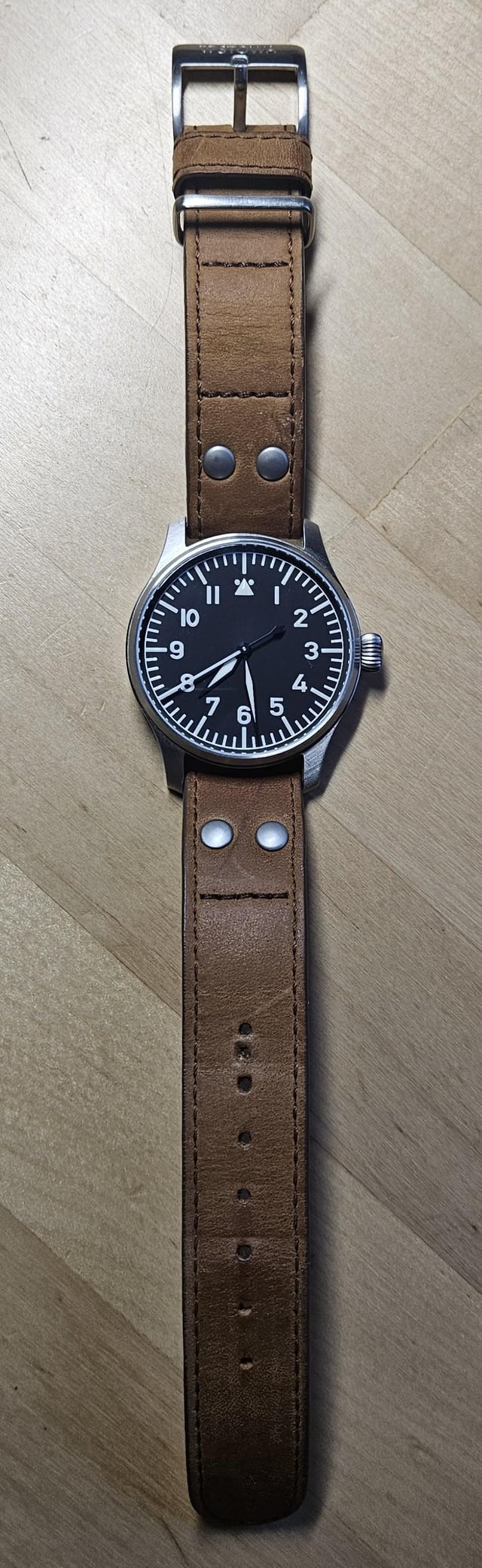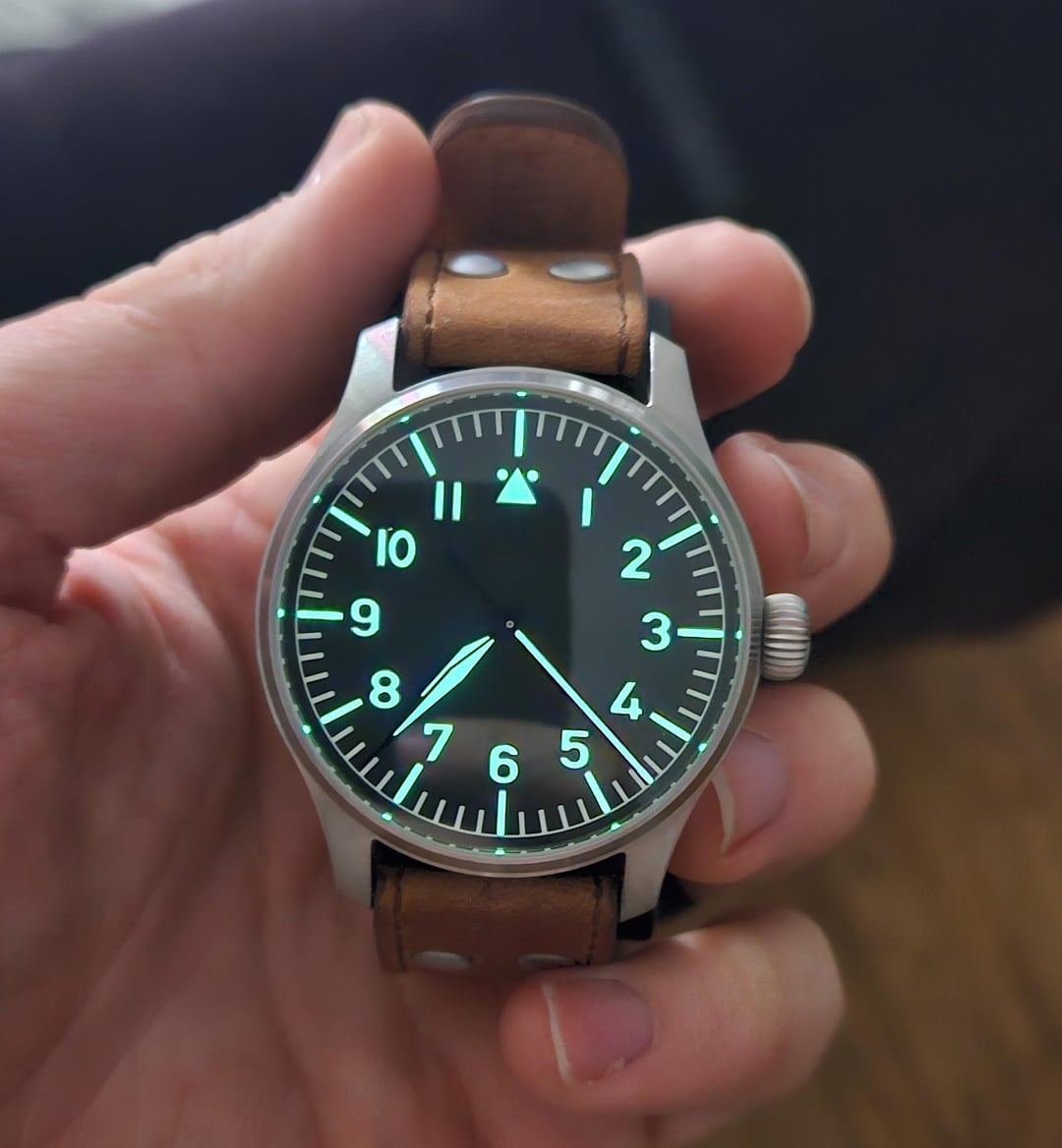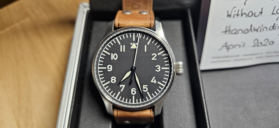 Up for sale today is my Stowa Flieger Classic 40 Manual wind with no logo and no date. It's a fantastic watch, but I don't wear it often enough to justify keeping it around at this point. I've only worn it maybe 10 times since I got it. Not much to speak of in terms of wear aside from some scratches on the undersides of the lugs that I've tried to get in my pictures. Comes with the original strap, metal case, and warranty card. It's dated April 2020. I'm the second owner as far as I'm aware. I generally wore it on a NATO strap so the original strap doesn't have much wear either. I did, however, punch a new hole in the original strap before deciding to switch straps. I'm looking to get \*\*$775\*\* through PayPal F&F ($800 for G&S) or Zelle. This price includes shipping which will be through USPS with tracking and full insurance. Not looking for trades right now.