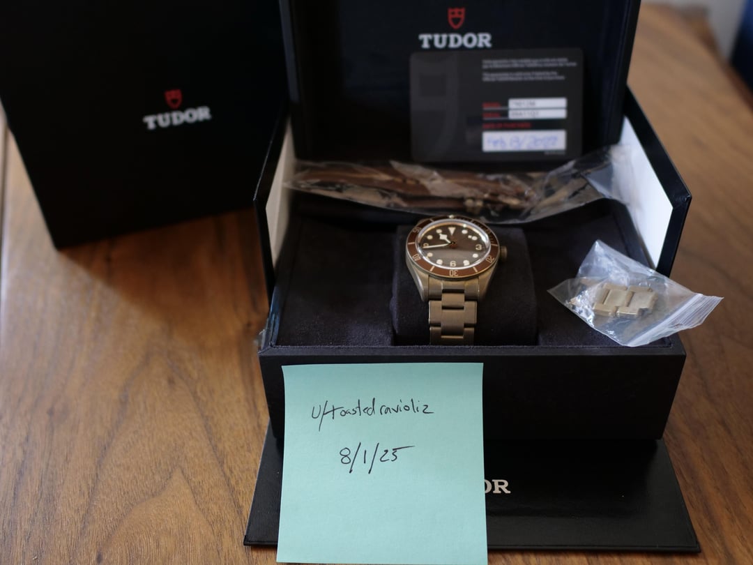 Up for sale is a stunning Tudor Black Bay 58 Bronze (Ref: M79012M) in excellent condition. The watch combines the vintage-inspired styling of the BB58 line with a unique bronze case that will develop a rich patina over time. This is a full set including the inner and outer boxes, papers, warranty card, all links, and both the OEM bronze bracelet and the OEM nato strap. **Specs and Details:** * Model: Tudor Black Bay Fifty-Eight Bronze * Ref: M79012M-0001 * Case Size: 39mm * Case Material: Bronze (aluminum-bronze alloy) * Dial: Matte brown-bronze gradient with gold accents and 3, 6, 9 * Bezel: unidirectional rotatable bronze bezel with brown aluminum insert * Crystal: Domed sapphire * Movement: Tudor MT5400 * Power Reserve: 70 hours * Water Resistance: 200m * Bracelet: Bronze with T-fit micro adjustment clasp * Year: 2022 **Condition** Overall, this watch is in great condition. It was worn sparingly, as I bought a Pepsi that has dominated my wrist time, shortly after acquiring this. * The watch is in great pre-owned condition, showing only light signs of wear * The crystal is clean and scratch-free * Bracelet shows minimal patina and the T-fit clasps works perfectly **Price: Asking $3300 shipping included** (USA to FedEx location for pickup) [Album](https://imgur.com/a/d2FxWHR) [Timestamp](https://imgur.com/KCTGcdg) [Hodinkee Article](https://www.hodinkee.com/articles/whoa-the-tudor-black-bay-fifty-eight-is-now-fully-bronze-live-pics-and-pricing)