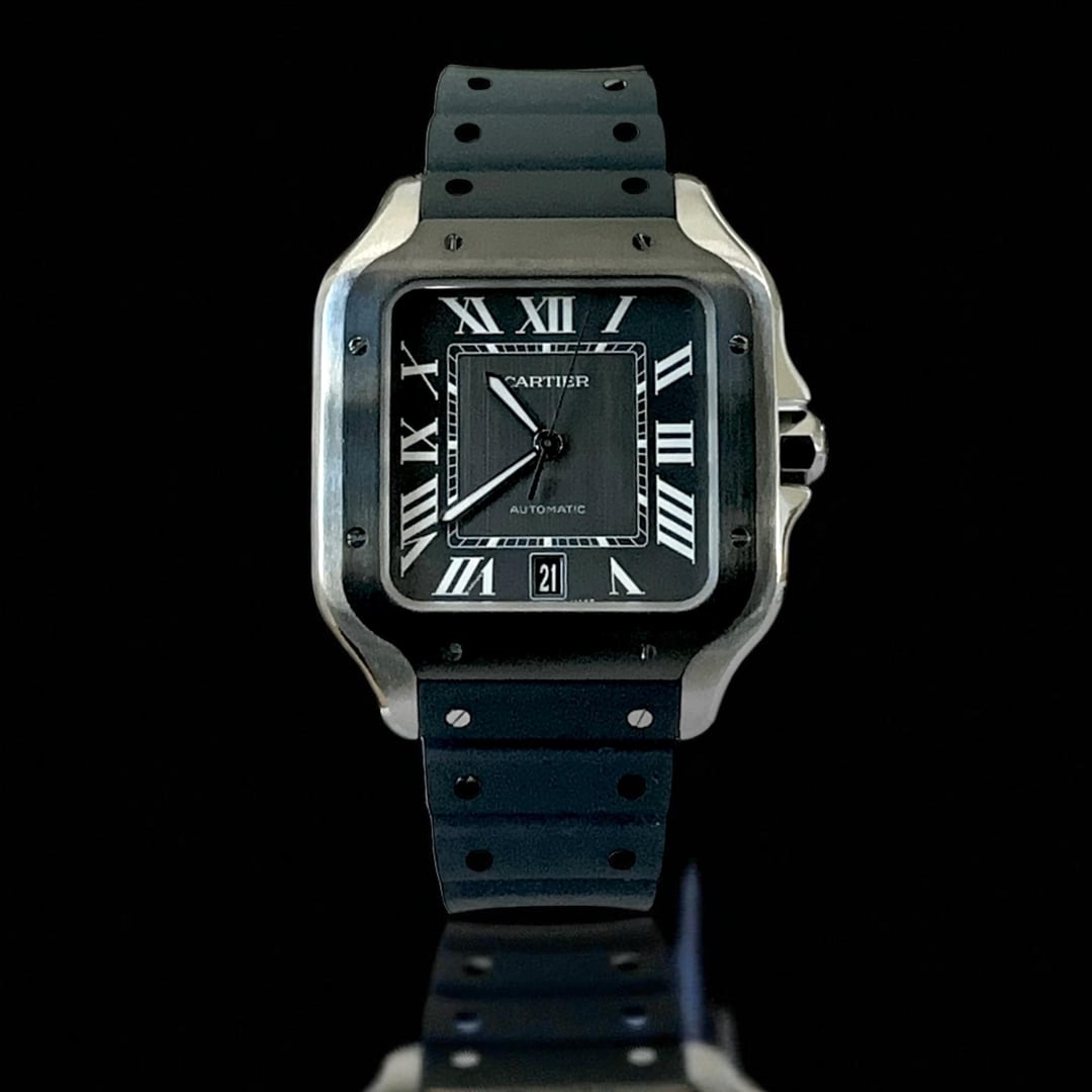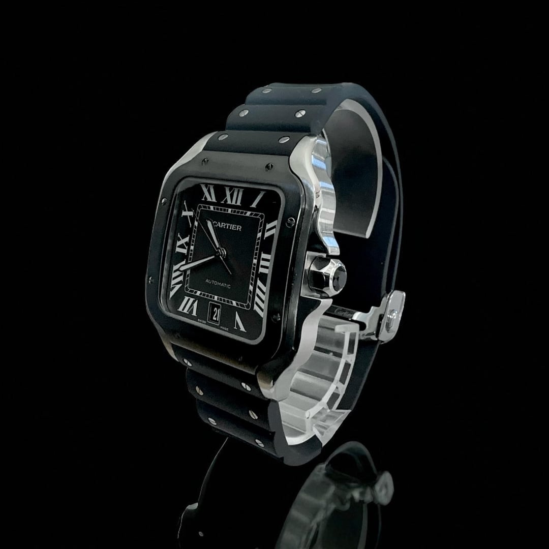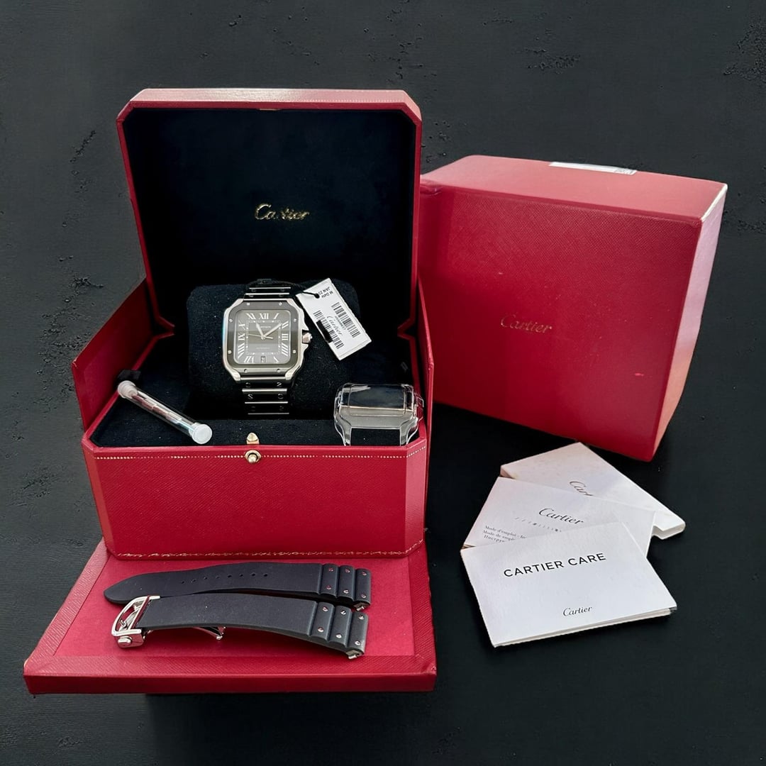 For sale is a Cartier Santos ADLC WSSA0037 Large (40MM) Condition: Very Good Pre-Owned no real visible signs of wear, any imperfection you see in the photos is probably dust. Scope of Delivery: • Double Box • Stainless Steel Bracelet • Rubber Strap • Booklets • Service Tool • Hang Tag • Plastic Protector MSRP for this watch is $9,600 (Tax incl) ✅Take this piece for $6,599 + Shipping ✅ 🍀Trades are Welcome, DM your offers🍀 Ships from San Diego, open to F2F deals for local buyers and FaceTime calls as needed Cartier Large (WSSA0037) is a modern interpretation of the classic Santos design, known for its square case, and ADLC (amorphous diamond-like carbon) coated bezel. It features a grey dial, Roman numeral hour markers, and a stainless steel case and bracelet. The watch is powered by the Cartier caliber 1847 MC automatic movement and is water-resistant to 100 meters.