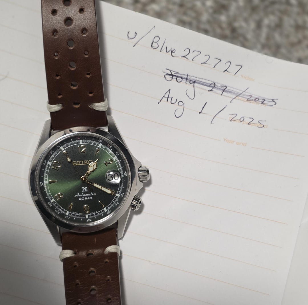 Sold Selling my Seiko SPB121J1 Alpinist – the classic green dial with gold accents. Perfect everyday piece with a unique adventure vibe. Condition: Good – minor scratches visible under certain lighting Includes: Watch only + generic box (no original box, papers, or original strap) Movement: 6R35 automatic, 70-hour power reserve Case: 39.5 mm, sapphire crystal with cyclops $550 CAD shipped via UPS overnight to CONUS (from MB, Canada) paid via PayPal F&F. Not sure how much in USD that'd be (probably around $400 USD) Timestamp: please see last pic above