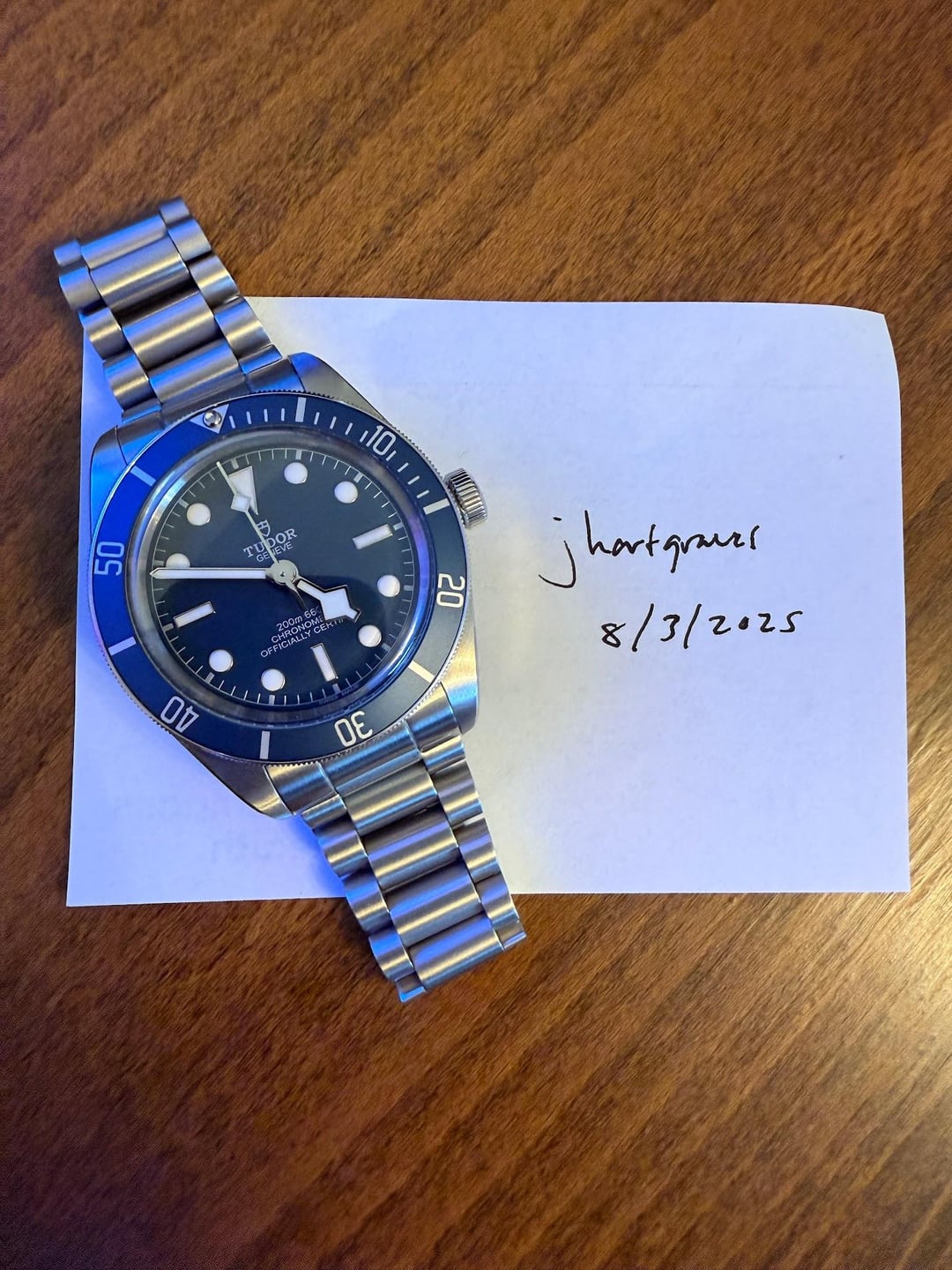 **Brand**: Tudor **Model**: Black Bay 58 Blue **Technical Data:** 39 mm case diameter, 11.9 mm thickness, 48 mm lug-to-lug, 20 mm lug width, water resistant to 200 meters, Tudor Manufacture Calibre MT5402 movement, automatic winding, 70 hour power reserve **Condition**: Great overall condition. Purchased from original owner about a month ago in June 2025 on eBay, underwent eBay authentication at that time. Running great, keeping excellent time. Watch in great condition cosmetically, has a couple very small scratches/marks really only noticeable on the polished sides of the case if you really look closely. Tudor bracelet is in great condition with very minor scuffing on the clasp. The extra included Forstner bracelet has slightly more “desk diving” scratches over the clasp (this is the bracelet I have pretty much exclusively worn the watch on since it came into my possession). **What's Included**: Watch, original Tudor bracelet with all links, Forstner President (1450) bracelet with quick adjust clasp, original outer and inner boxes, Tudor warranty card and owner’s manual, hang tag. Both bracelets currently sized for my roughly 7.5 inch wrist. **Price:** **~~$3,000~~** **$2850** or best offer (includes shipping); NOT INTERESTED IN ANY TRADES AT THIS TIME **Payment**: Zelle, Venmo, PayPal G&S (+3% for buyer) **Location**: Dallas, TX **Shipping**: Will ship tracked and insured via USPS priority mail within CONUS Thanks for looking!