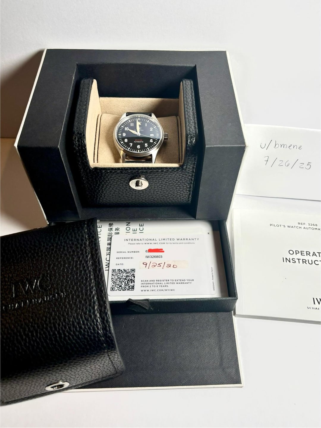 Timestamp: https://imgur.com/a/lNorL63 Up for grabs is an IWC Spitfire Automatic (Ref. IW326803) in excellent condition. The watch has been lightly worn by me and was purchased as NOS not too long ago. Overall, it looks fantastic and functions flawlessly. Selling to fund another purchase. This model is now discontinued and will become harder to find, especially in this condition. It blends IWC’s vintage military DNA with modern specs and warm colors added to the dial, making it incredibly versatile. The 39mm case wears comfortably on almost any wrist and looks amazing on just about any strap you throw on it. Specs & Details: - 39mm stainless steel case - Slate sunburst dial - In-house IWC Caliber 32110 (72-hour power reserve) - Water resistance: 60m w/ screwdown crown - Under factory warranty until 2028 - Complete set – box, papers, manuals, warranty card - Original strap in great condition Price: $3,790 shipped CONUS via FedEx or UPS (fully insured). Payment: Zelle, Venmo or PayPal. Location: Colorado, USA Happy to provide additional photos or videos on request. Feel free to reach out with any questions, and thanks for looking!