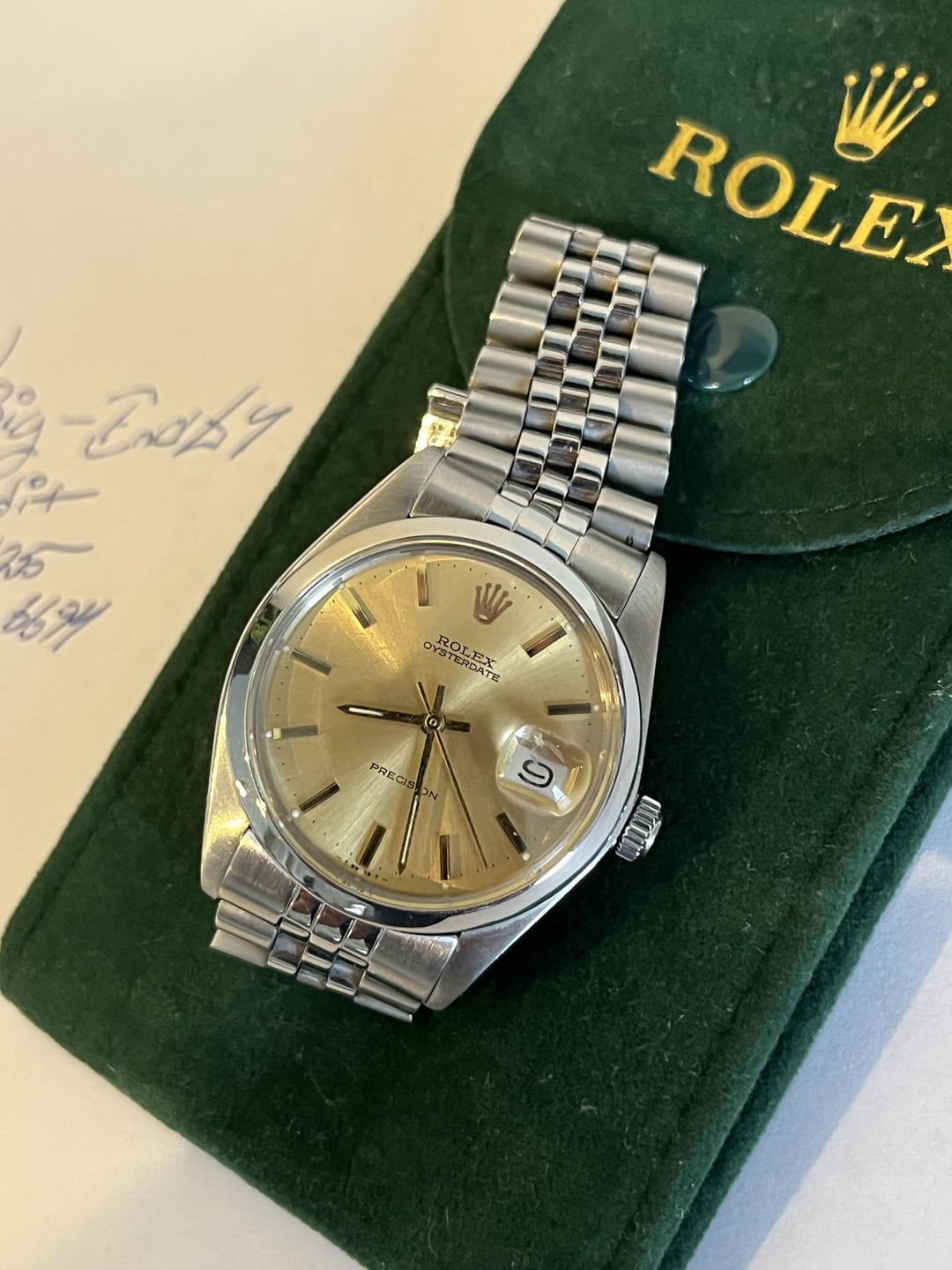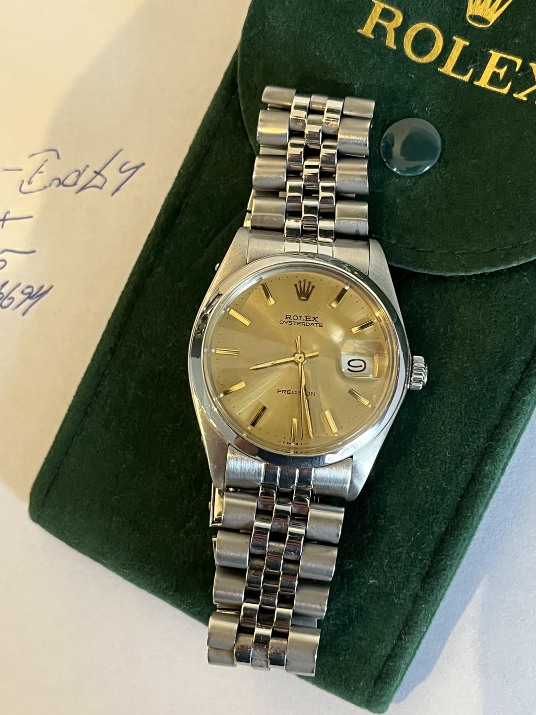 Selling a vintage Rolex model. I don’t now much about it but I have had it for few years. I was going to get it serviced and was quoted $500~$650 at my Rolex AD so I’ll just sell it. It does work and holds good time. Does loose few seconds over the day but nothing really noticeable. It is 34mm and overall condition is okay with the age in mind. Any questions just send me a message and I’ll try to answer when I can. Price: $575 inside CONUS - I’ll ship it worldwide.