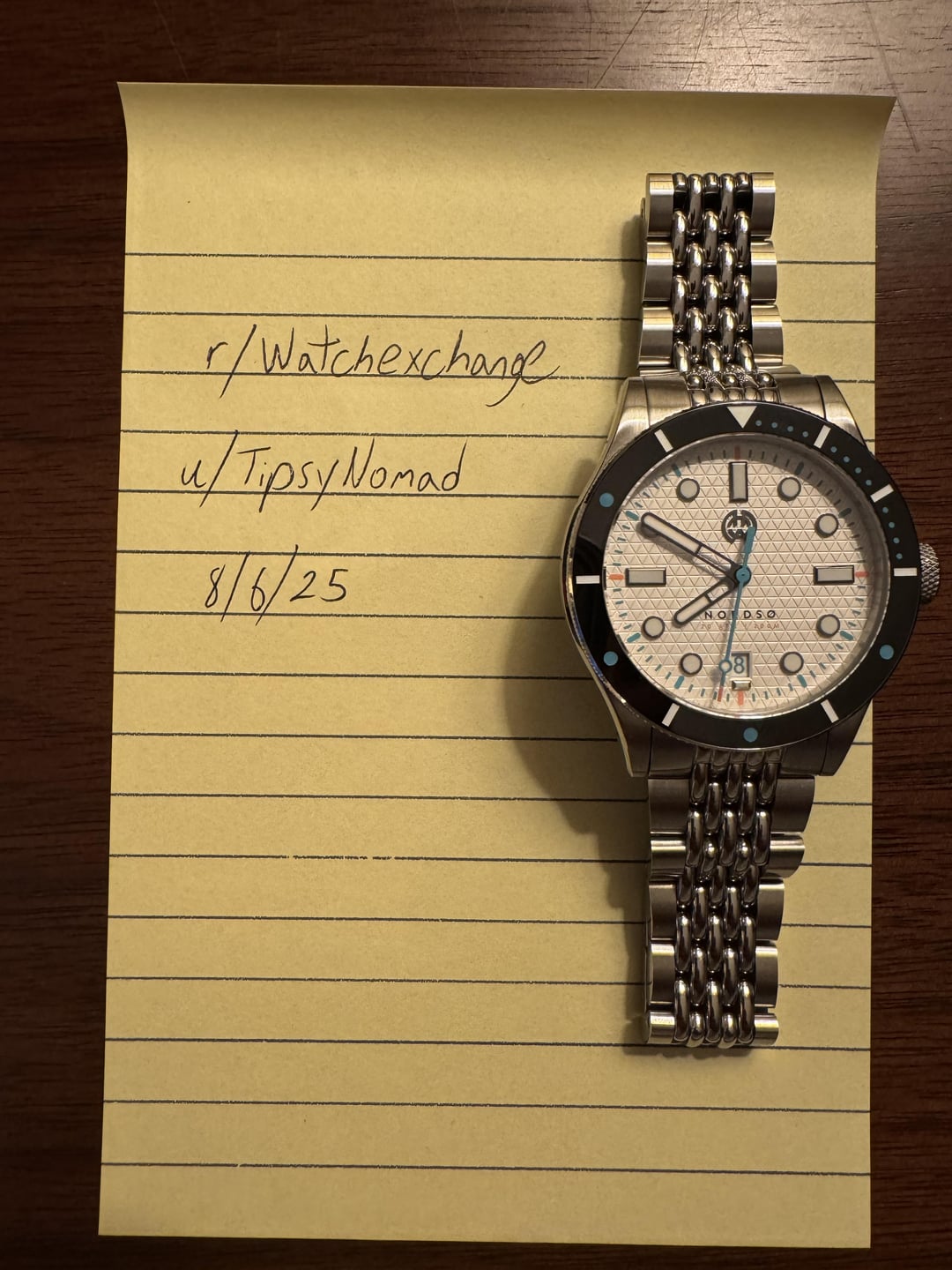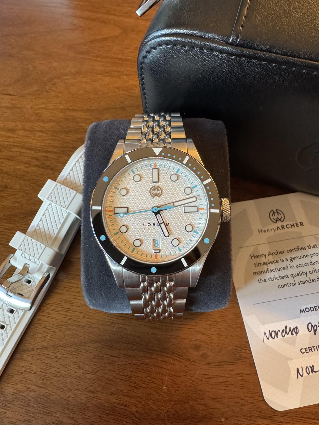 Henry Archer Nordso - Optic White Timestamp: [https://imgur.com/txSUtNK](https://imgur.com/txSUtNK) Pictures: [https://imgur.com/a/henry-archer-nordso-optic-white-pYFqnch](https://imgur.com/a/henry-archer-nordso-optic-white-pYFqnch) The small splashes of blue and orange add some fun character to the lovely textured white of this watch. Between the super thin case and beads-of-rice style bracelet it wears extremely comfortably making it feel like it disappears on your wrist; thankfully it’s 200 meters of water resistance means it’ll happily ride along with you, no matter what you’re doing! What's included: Watch, travel case (fits two watches), matching white rubber strap, and 2-year warranty Condition: The watch head is in fantastic condition, with minor scratches on the underside of the lugs due to swapping out the bracelet and strap. The bracelet has minor scratches and scuffs on the links and clasp, but are really only noticeable if you really look for them or in harsh lighting. Price: $380 w/ shipping included. US only Payment Method: Zelle, Paypal, Venmo Happy to answer any questions!