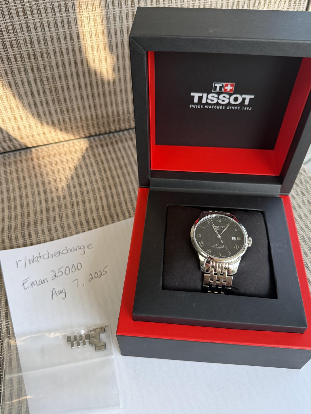 For sale is a beautiful Tissot LeLocle Powermatic 80. I purchased this brand new in the summer of 2024. Barely worn so it is in excellent condition. I simply don’t wear this watch as much as I originally anticipated, and I am hoping somebody else can get great use out of it. Included is the full kit except the warranty card. Unfortunately, I cannot find it. This is my first sale on r/watchexchange ! · Condition: Excellent · Model: Tissot LeLocle Powermatic 80 · Reference: T006.407.11.053.00 · Movement: Tissot Powermatic 80 · Dial: Black with silver accents · Case size: 39.3mm · Lug to Lug: 19mm · Included in the kit – Tissot original box, booklet, extra links, watch and metal bracelet. I cannot find the warranty card, so that is NOT included, but the watch was purchased new in 2024. Timestamp included in photos. **Price**: Asking $375 including shipping **Payment**: PayPal F&F (for G&S add 3%), Zelle, Venmo **Shipping:** CONUS only Thanks for looking! Feel free to PM if you have questions and I’ll respond as soon as possible.