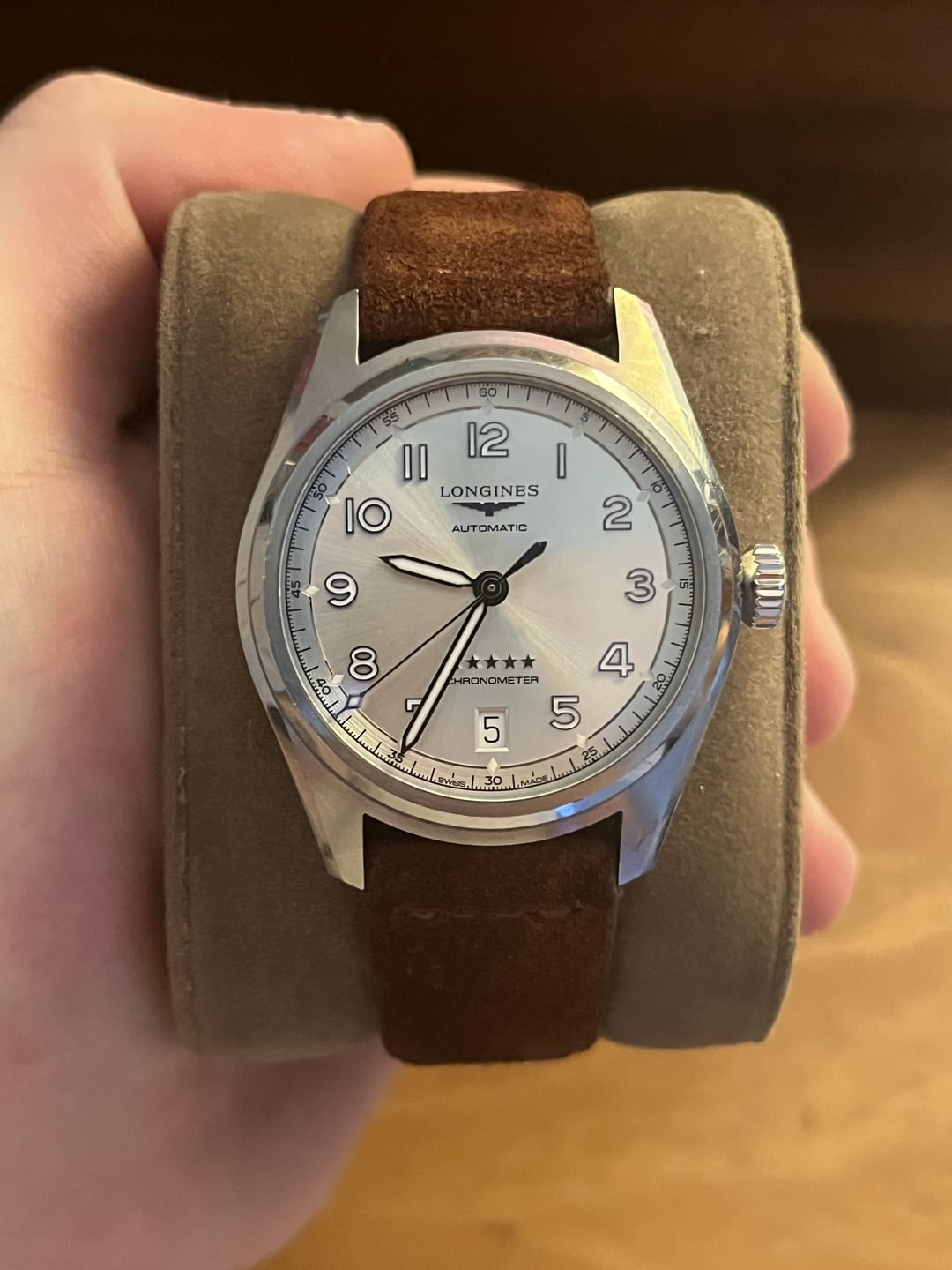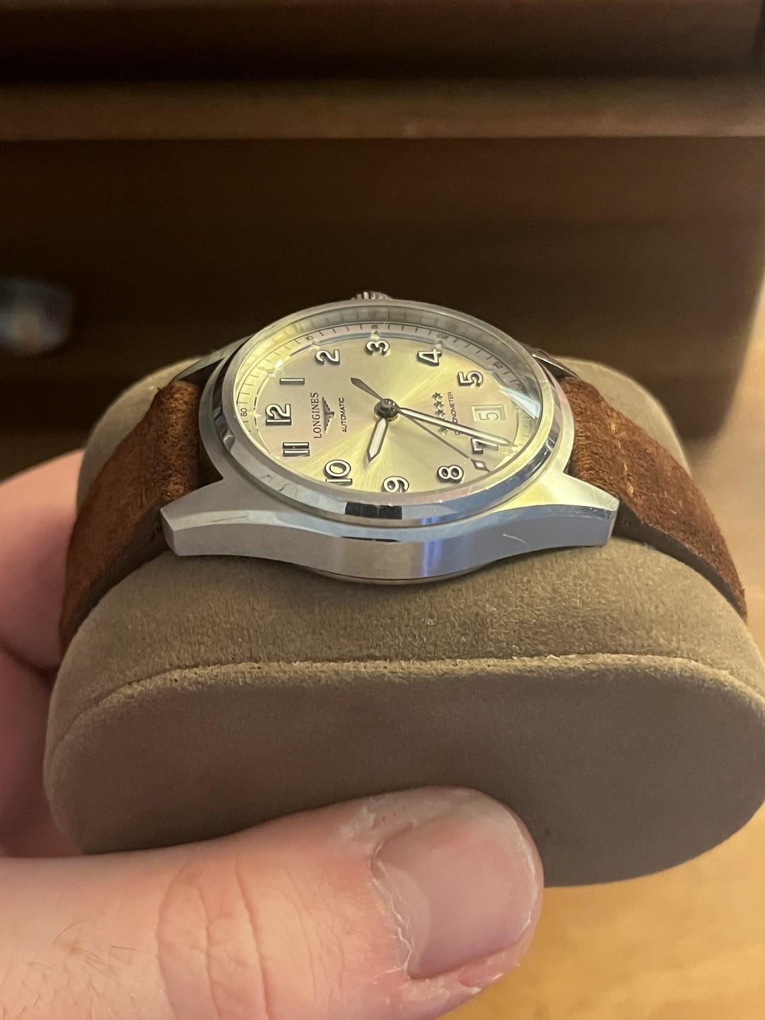 Longines Spirit 37 (Champagne Dial) FULL SET + 2 Leather Straps (Brown is Bulang&Sons, Grey is unknown) - Brown strap fits me and I have a big wrist (7.5in), grey is too small. Full set includes: • ⁠Box • ⁠COSC Certification • ⁠Longines Card • ⁠Original Receipt • ⁠Watch with original band Good Condition - Some wear, mostly on clasp and a couple dings on the case. Scratching on the bezel as well. Crystal is clean. Watch runs great and keeps good time. One of the best pieces I've ever owned, just not getting wrist time since I got my Shunbun. Price: $1575 OBO Payment via PayPal, Venmo, Cashapp Located in USA (Arkansas)