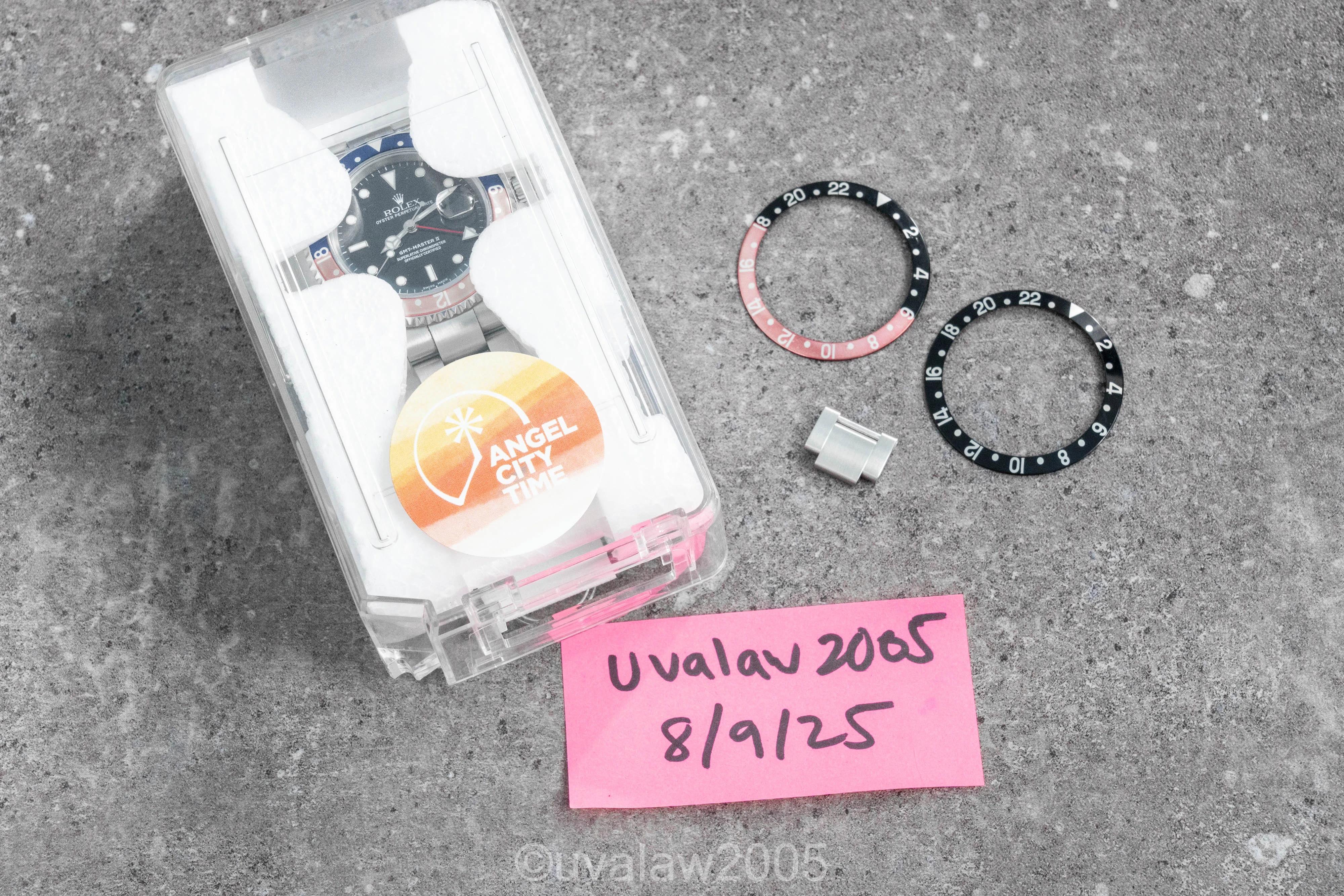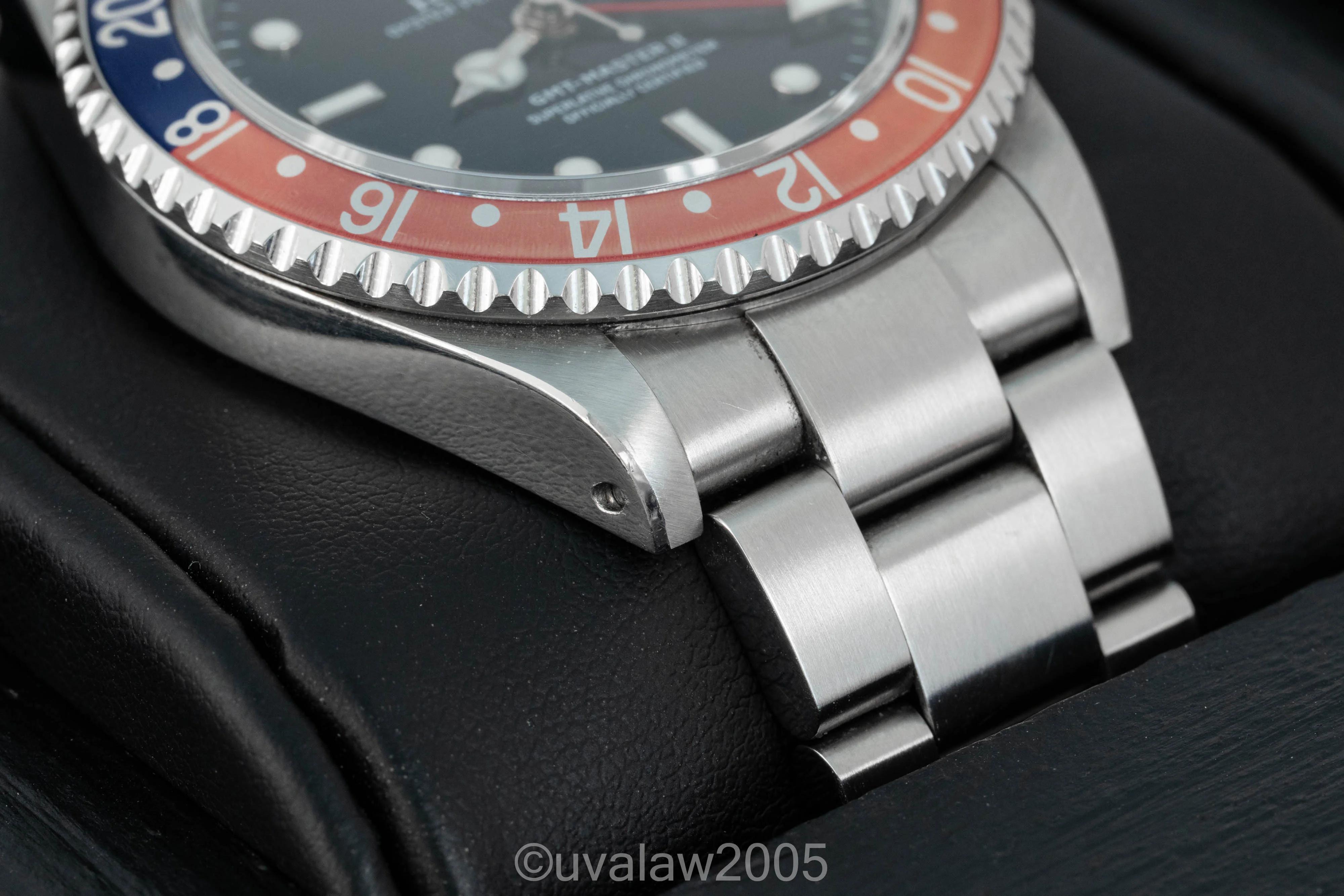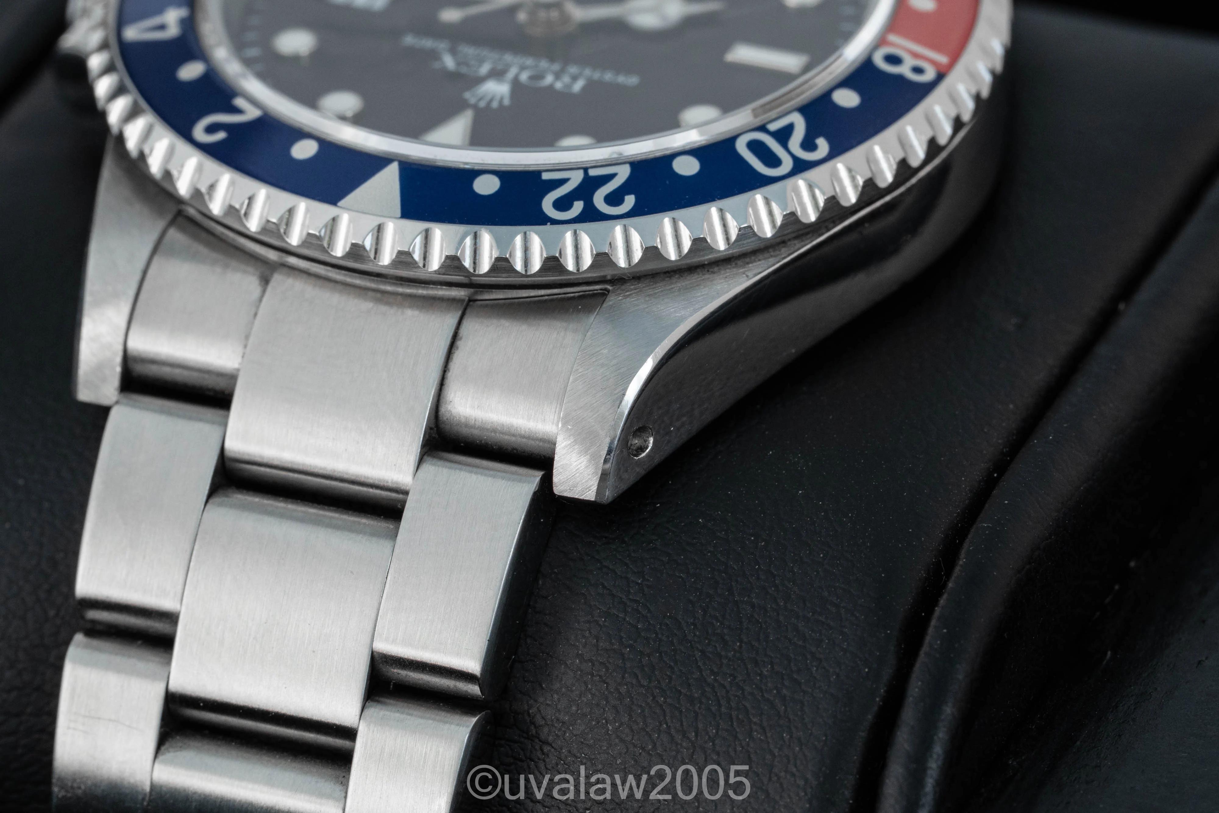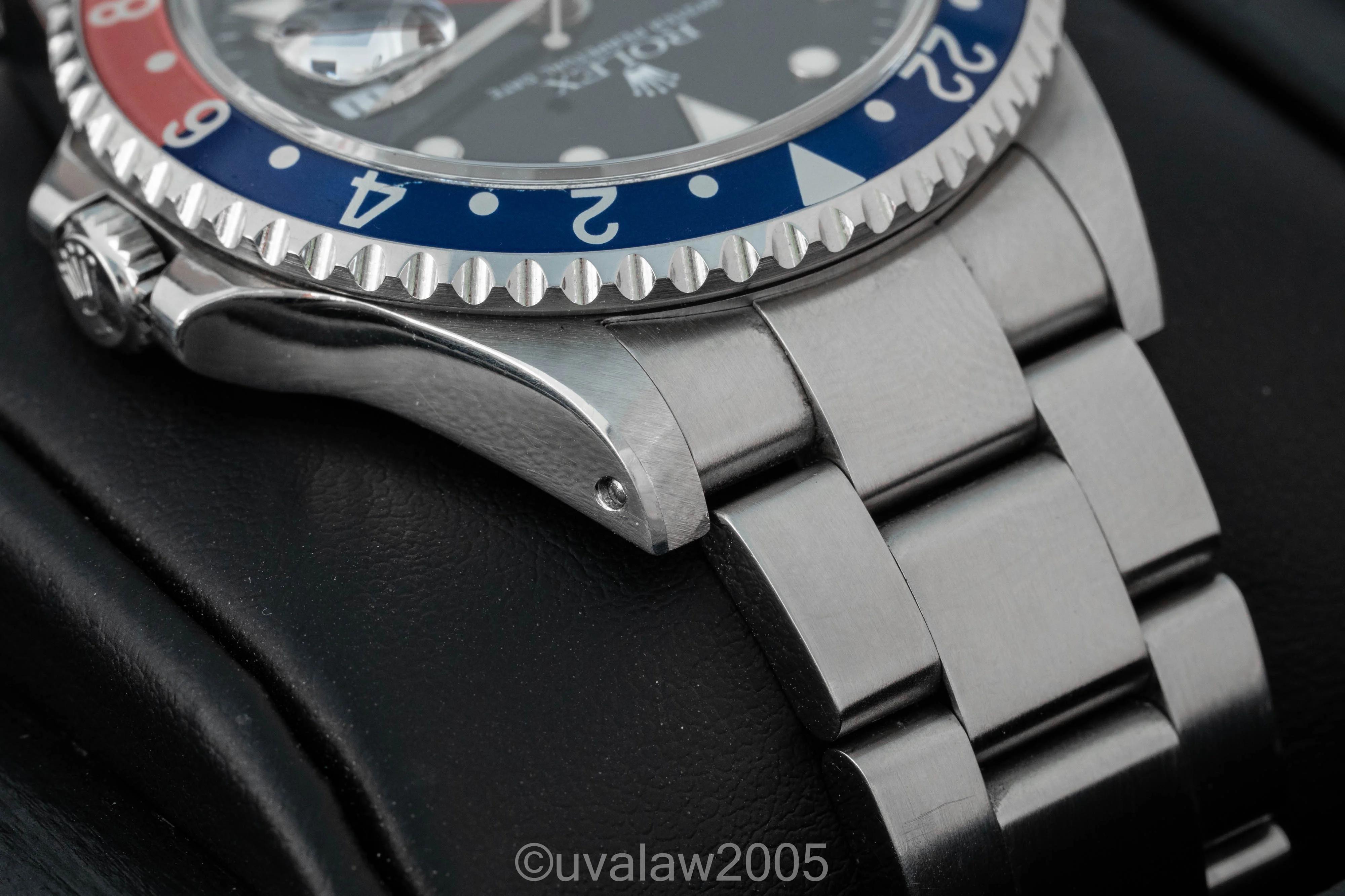 For sale is my Rolex GMT-Master II reference 16710 with holes case, solid endlinks, and three OEM bezel inserts. I bought it earlier this year with a black bezel from Angel City Time (original sales post here), and then purchased vintage OEM Pepsi and Coke inserts from jfullm42time.