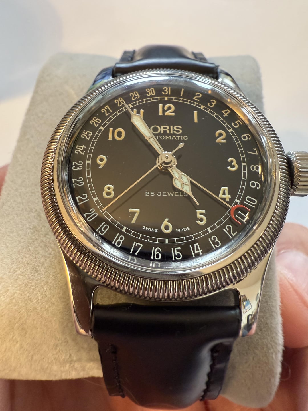 Up for sale is an Oris Big Crown Pointer Date Ref. 7463B in stainless steel. This model houses the Oris Caliber 654 (25 jewels) with the decorated gold-tone rotor visible through the display back. It features the iconic coin-edge bezel, large fluted crown, and the classic red crescent pointer date hand — a design Oris has produced for decades. Details: Reference: 7463B Era: 1990s production Movement: Oris Cal. 654 (25 jewels, gold-tone decorated rotor) Case Size: 36 mm stainless steel (excluding crown) Lug Width: 18 mm Water Resistance: 30 M Crystal: Domed acrylic Dial: Black with cream Arabic numerals, outer date track, red crescent pointer date hand Bezel: Coin-edge, fixed Strap: Aftermarket black leather strap with stainless steel deployment clasp Lume: Tritium (aged patina) Condition: Excellent vintage condition with very light wear. Acrylic crystal is clean and free of major scratches. Case and bezel have only very light surface marks. Recently serviced. Movement winds, sets, and runs smoothly. The way this watch ticks is hypnotic! Price: $975 (includes CONUS shipping) Payment: PayPal F&F, Venmo, or Zelle Location: San Francisco, CA Shipping: USPS Priority insured within CONUS.