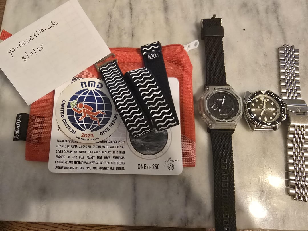 Good evening, WatchEx! Im looking to do a sort of trade up challenge. I've got; Seiko SRPD95 w/ Uncle Seiko Beads of Rice Bracelet, as well as a Nick Mankey Dive series hook strap (Blue) G Shock GA2100 Clear Bezel (comes with JaysandKays 22mm straps adapters) My ultimate goal is to make it to a Sinn 104 St Sa (black dial), but I know I need to make baby steps. I know this is a long shot, and I'd be considered extra lucky to make it to my goal, but I figured it's worth a shot! With a conservative estimate, I'm placing the value of all of these together at roughly $300. I'm looking to trade to that or higher! I don't have any particular brands / watches in mind, so send me what you think may work. The worst that I can say is no. Thanks for taking the time to read this! Much Love ❤️ Edit 1: I've got a bit of confirmed transactions over on r/hardwareswap if you're a bit weary! Edit 2: The wave strap is actually a nice navy blue (idk why it appears black in the photo) Edit 3: Grammer / Spelling